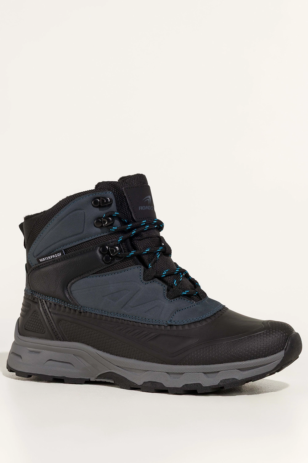Granatowe wstawki na cholewce dodają charakteru i oryginalności, podkreślając sportowy styl obuwia. Wnętrze wyściełane miękkim kocem obuwniczym oraz wyjmowana wkładka z tego samego materiału gwarantują ciepło i wygodę, nawet przy dłuższych wędrówkach. Dzięki zaokrąglonemu noskowi i solidnemu sznurowaniu, buty perfekcyjnie dopasowują się do stopy, zapewniając stabilność i wygodę noszenia bez względu na pogodę.