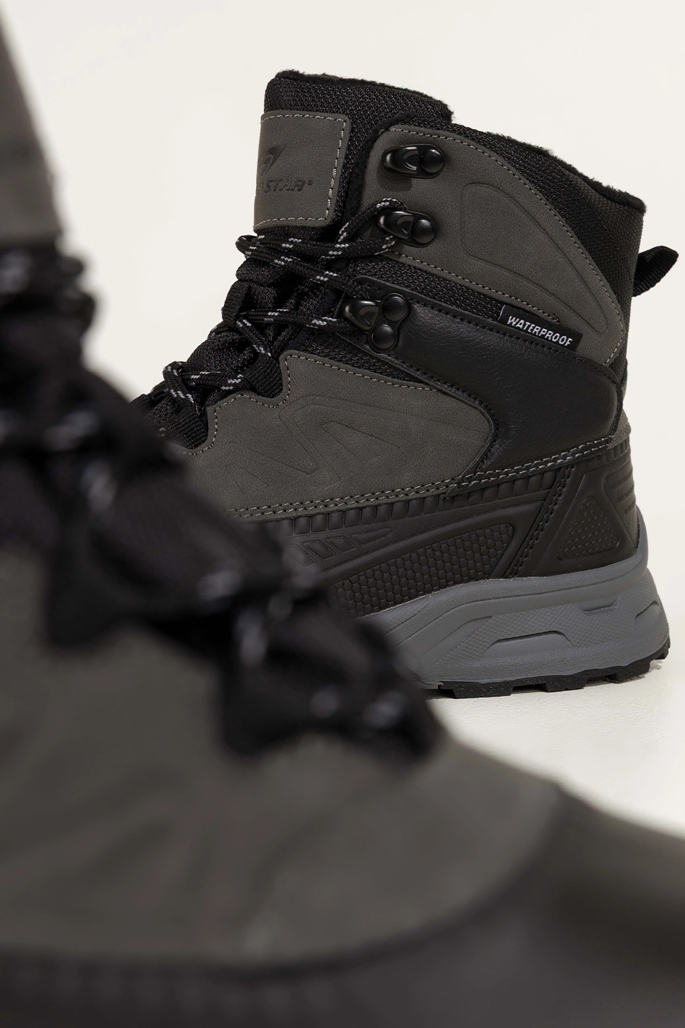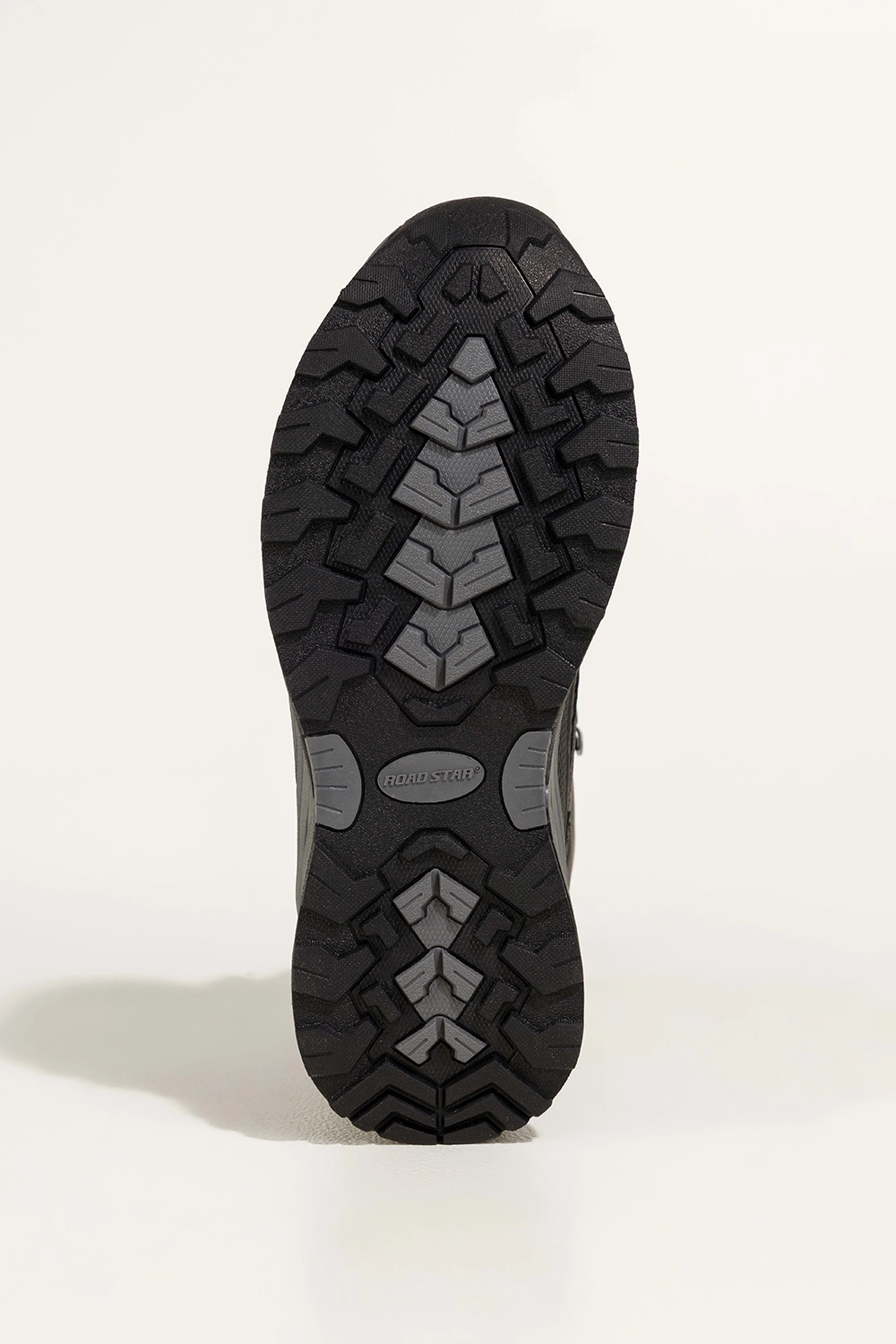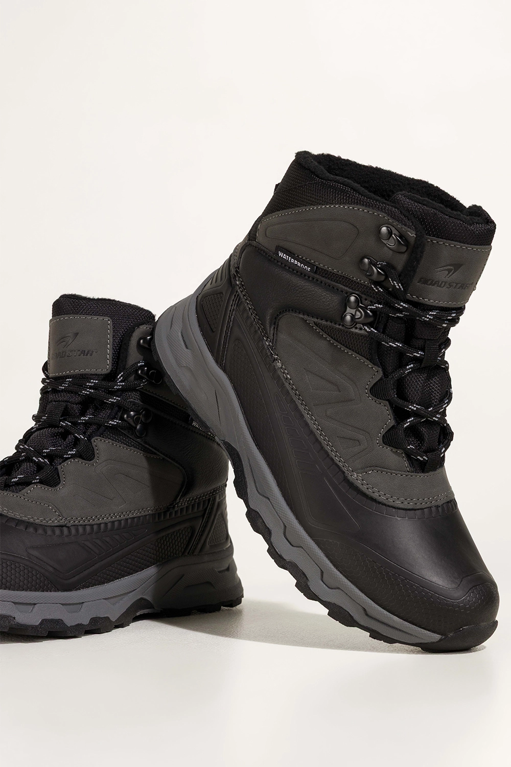 Czarne buty sportowe trekkingowe damskie wodoodporne na bieżnikowanej podeszwie sznurowane szare wstawki Casu model 7688-3D, to połączenie najwyższej jakości wykonania i nowoczesnych technologii. Zrobione z wysokogatunkowej skóry ekologicznej o właściwościach waterproof, idealnie sprawdzają się w trudnych warunkach pogodowych. Wnętrze wyściełane miękkim kocem obuwniczym oraz wyjmowana wkładka zapewniają niespotykany komfort i ciepło podczas długich wędrówek czy codziennego użytkowania. Solidna konstrukcja i dbałość o detale sprawiają, że te buty są gotowe na każde wyzwanie.