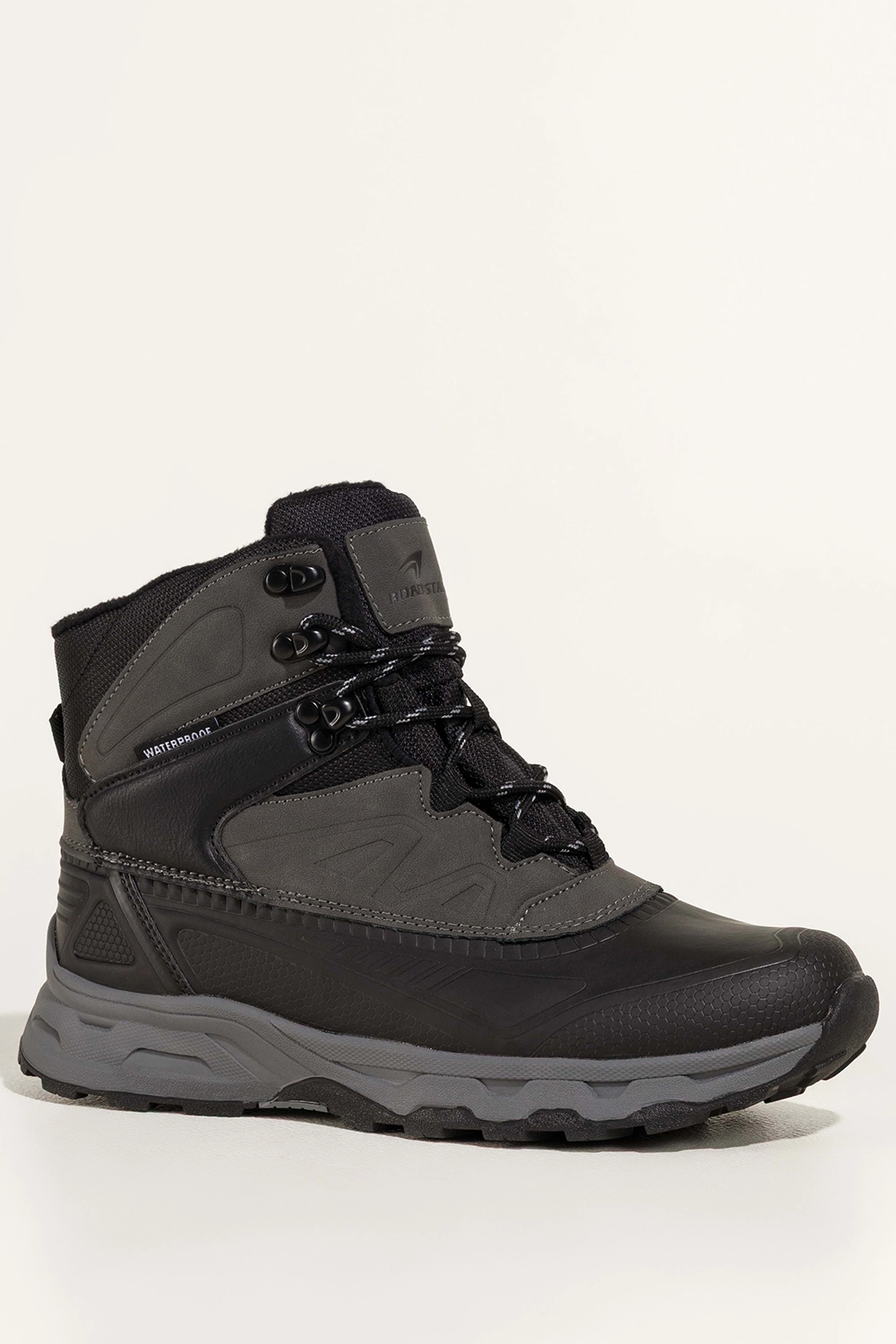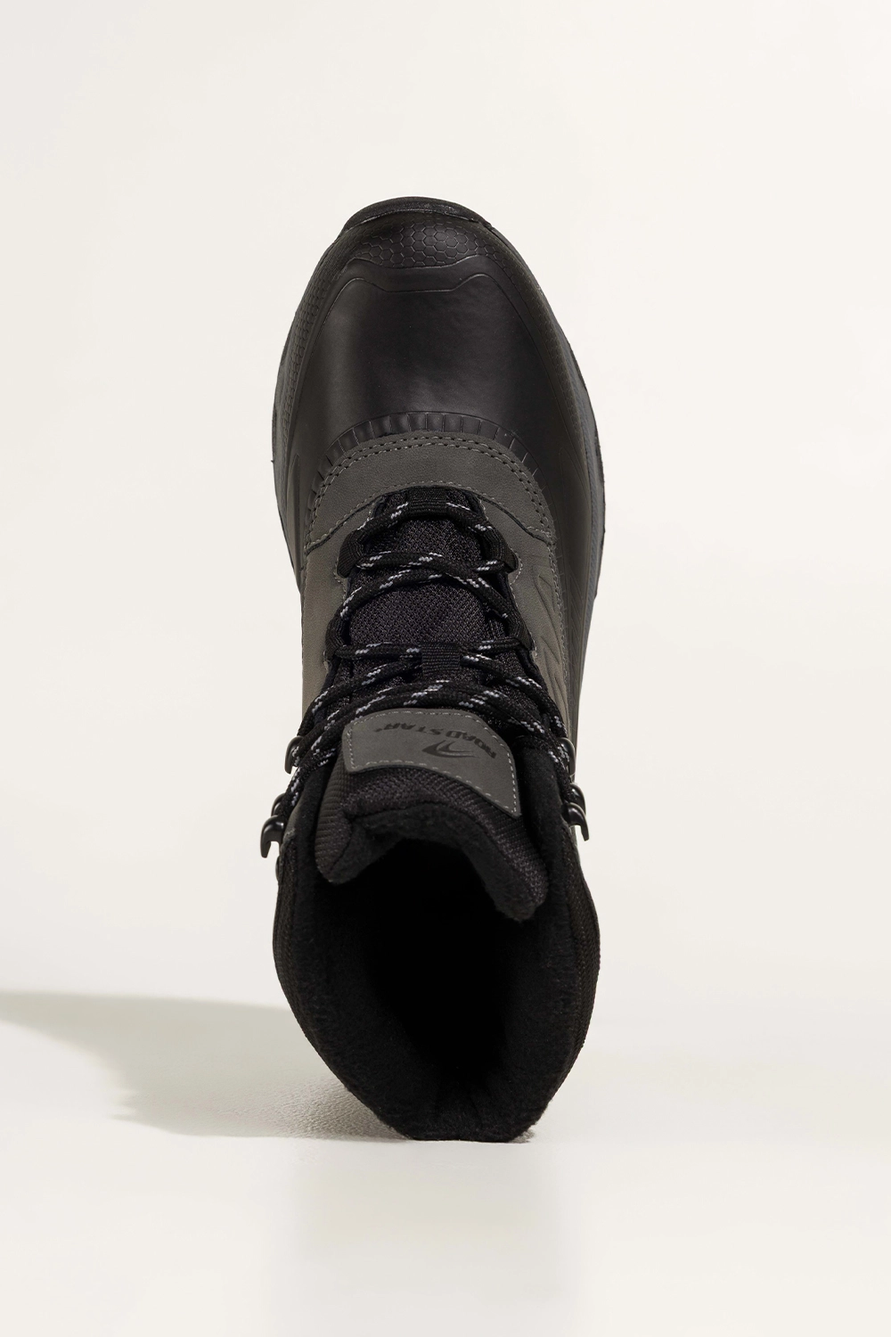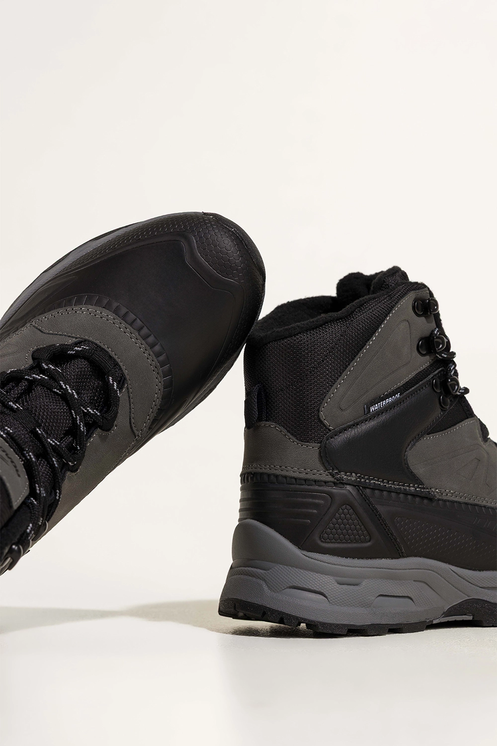 Czarne buty sportowe trekkingowe damskie wodoodporne na bieżnikowanej podeszwie sznurowane szare wstawki Casu model 7688-3D, to połączenie najwyższej jakości wykonania i nowoczesnych technologii. Zrobione z wysokogatunkowej skóry ekologicznej o właściwościach waterproof, idealnie sprawdzają się w trudnych warunkach pogodowych. Wnętrze wyściełane miękkim kocem obuwniczym oraz wyjmowana wkładka zapewniają niespotykany komfort i ciepło podczas długich wędrówek czy codziennego użytkowania. Solidna konstrukcja i dbałość o detale sprawiają, że te buty są gotowe na każde wyzwanie.