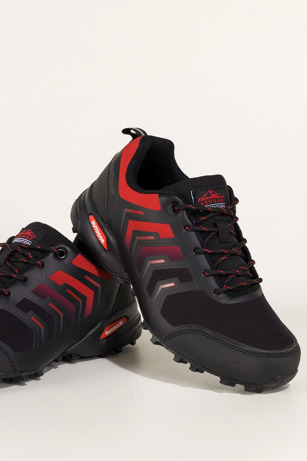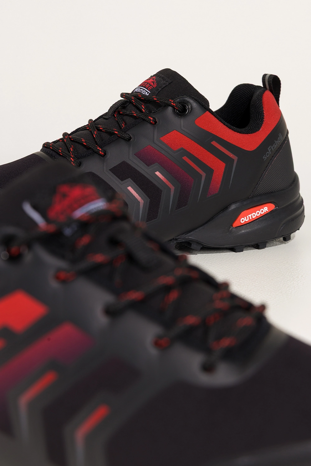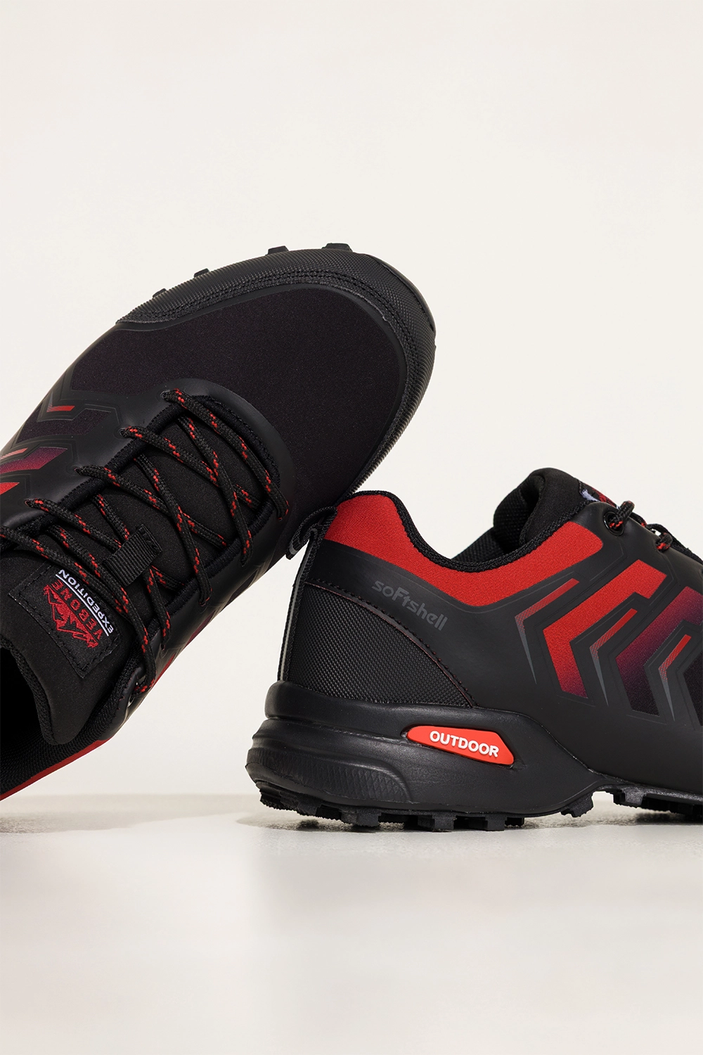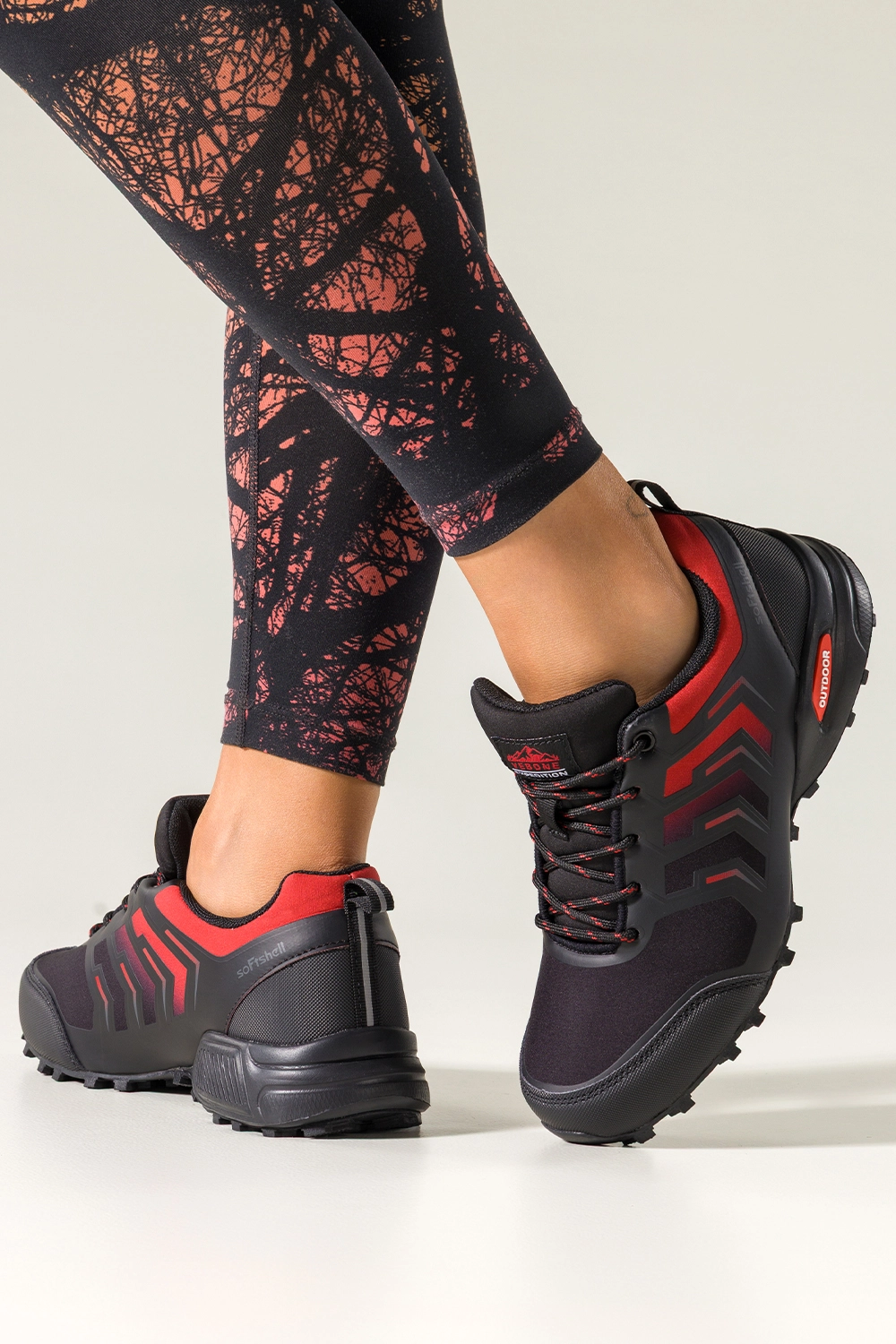 Czarne buty trekkingowe damskie buty sportowe softshell na bieżnikowanej podeszwie czerwone wstawki sznurowane Carla model EY82976-5, połączenie trwałości, wygody i nowoczesnego stylu. Wykonane z wysokogatunkowej skóry ekologicznej i wyposażone w miękką, tekstylną wkładkę, gwarantują komfort nawet podczas długich wędrówek. Bieżnikowana podeszwa zapewnia doskonałą przyczepność, co czyni je idealnym wyborem zarówno w miejskich warunkach, jak i podczas górskich wypraw. Lekka konstrukcja i ergonomiczny kształt zapewniają stabilność na każdym kroku.