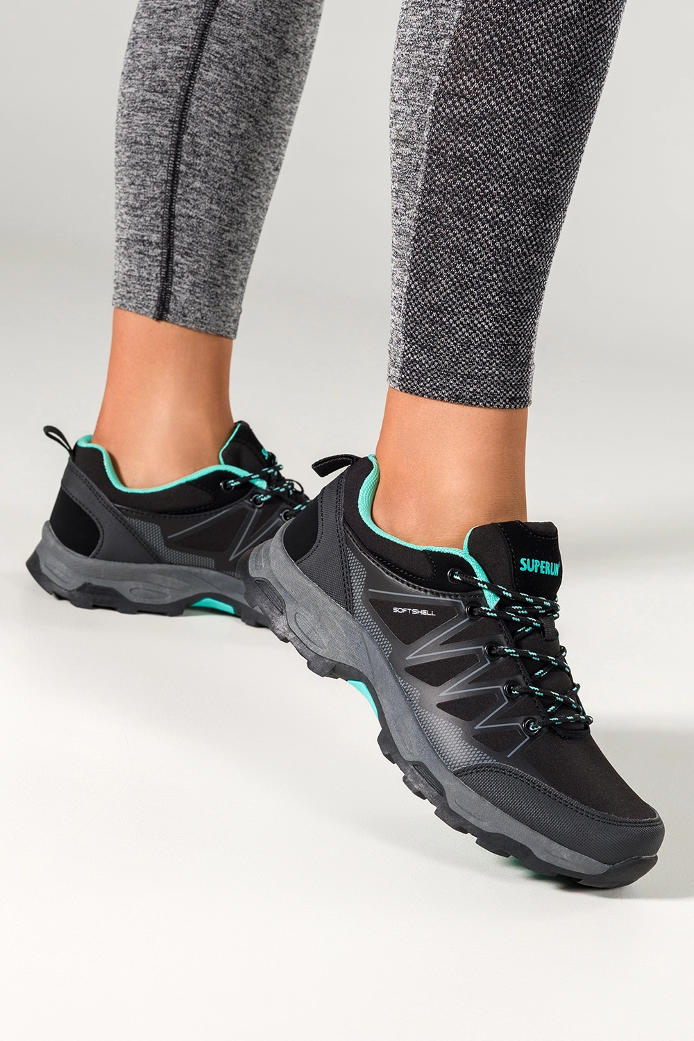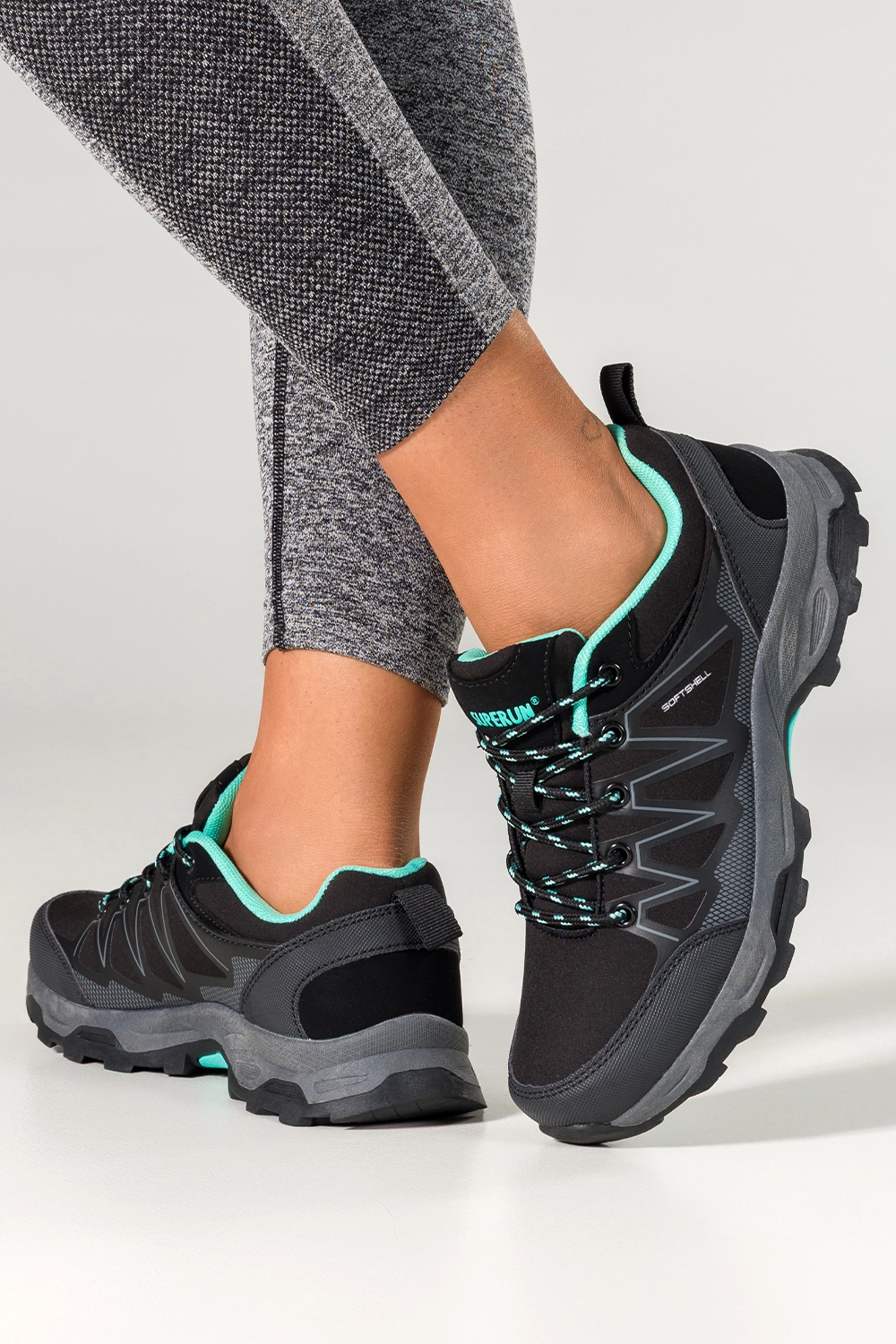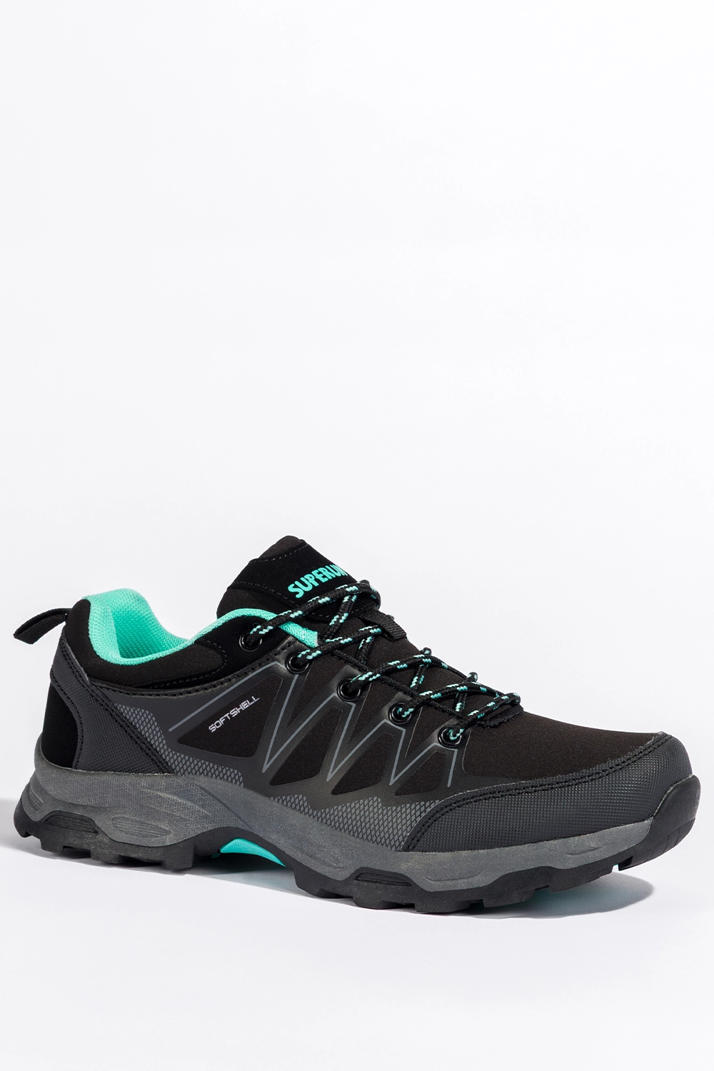 Czarne buty trekkingowe damskie buty sportowe softshell na bieżnikowanej podeszwie sznurowane turkusowe wstawki Carla model 8452 to niezawodny towarzysz każdej aktywnej kobiety, która ceni sobie wygodę, jakość wykonania i nowoczesny design. Wykonane z wysokogatunkowej skóry ekologicznej i uzupełnione tekstylną wkładką, te wyjątkowe buty łączą w sobie wszystkie cechy idealnego obuwia outdoorowego. Dzięki technologii softshell, zapewniają komfort termiczny, jednocześnie pozwalając stopie oddychać. To idealna propozycja dla kobiet, które potrzebują funkcjonalnego, stylowego i trwałego obuwia trekkingowego, które sprawdzi się zarówno w mieście, jak i podczas dłuższych spacerów po lesie czy w górach.
