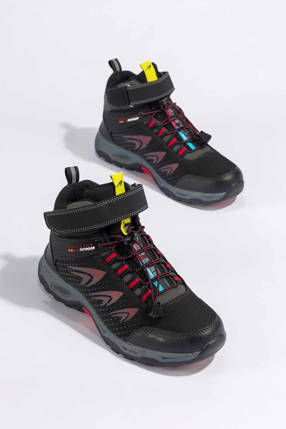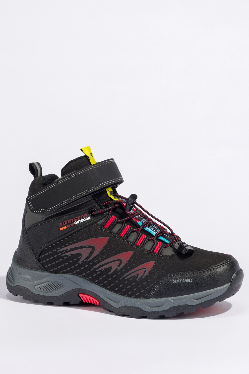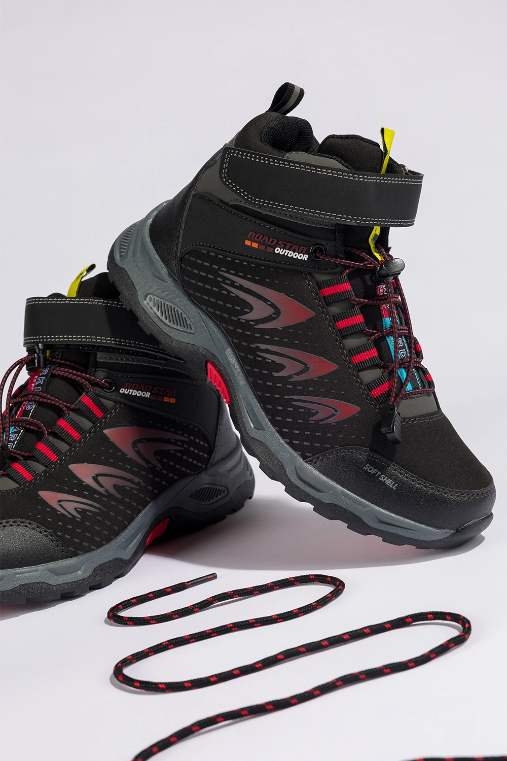 Czarne buty trekkingowe damskie na bieżnikowanej podeszwie z regulowaną elastyczną sznurówką czerwone wstawki softshell Casu 2310-3W