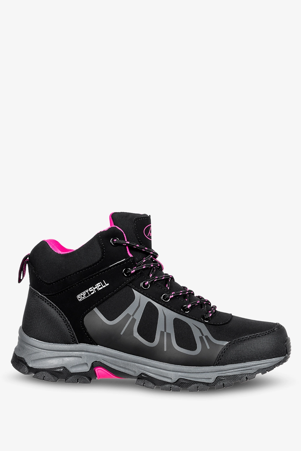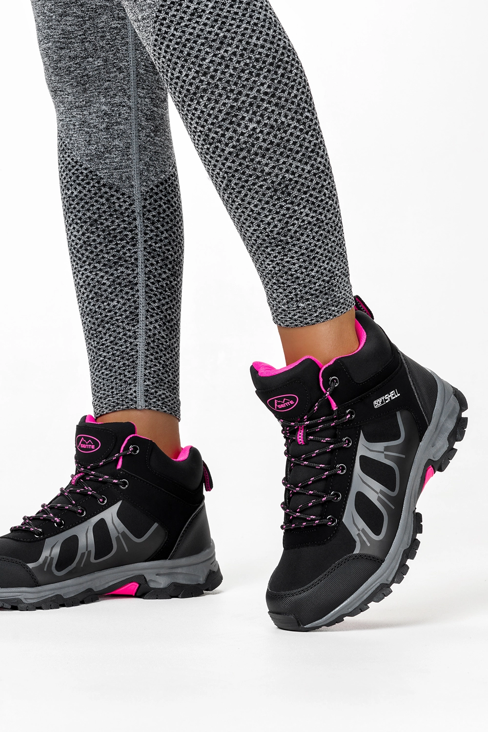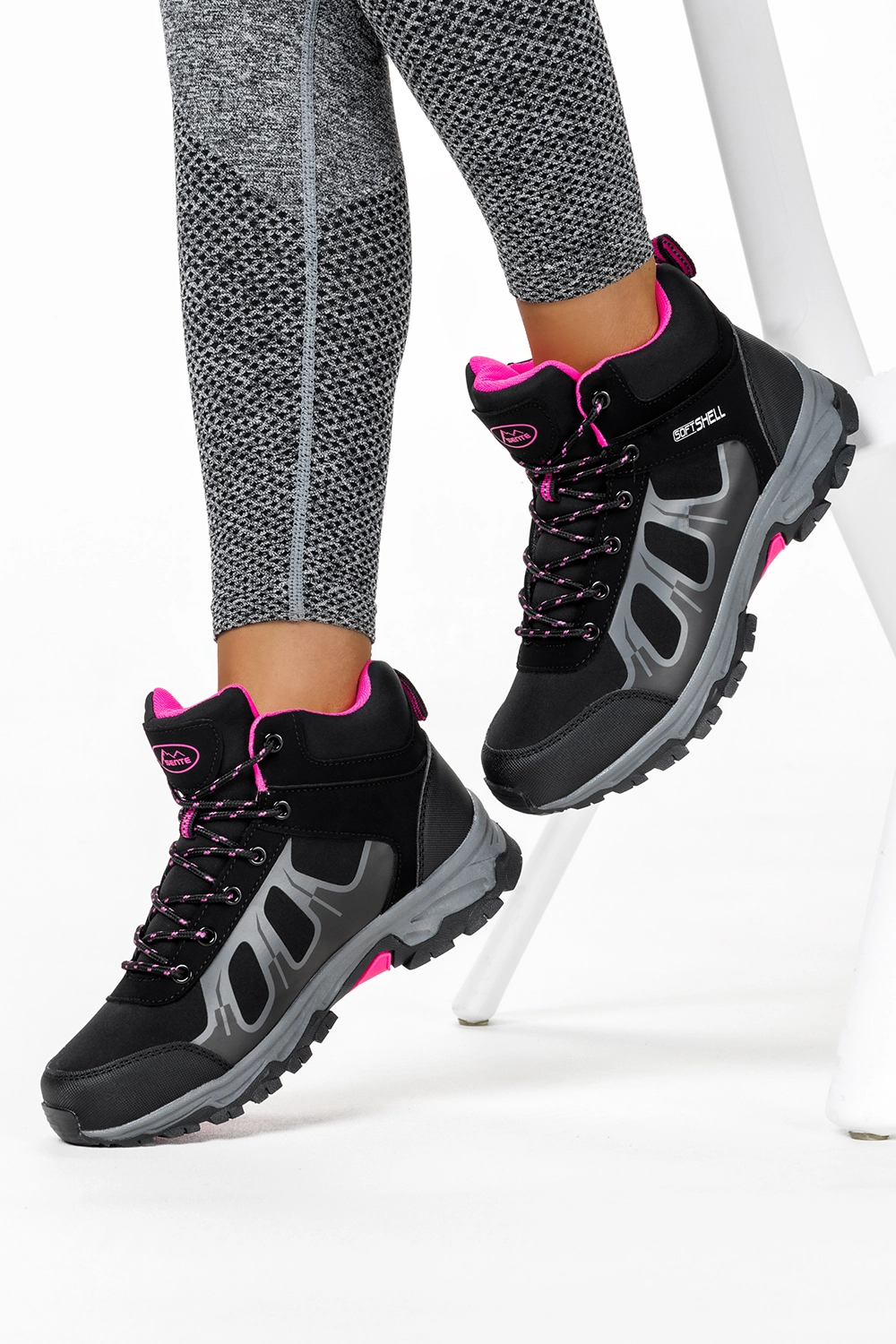Czarny kolor z energetycznymi różowymi wstawkami i sznurówkami z różowymi akcentami nadaje butom nowoczesnego, kobiecego wyrazu. Ich uniwersalna stylistyka sprawia, że doskonale komponują się zarówno z odzieżą sportową, jak i codziennymi, casualowymi stylizacjami. Zaokrąglony nosek oraz bieżnikowana podeszwa podkreślają outdoorowy charakter obuwia, zapewniając przy tym stabilność i pewność kroku. To buty, które łączą modny wygląd z funkcjonalnością, dla kobiet, które cenią styl, ale nie chcą rezygnować z wygody.