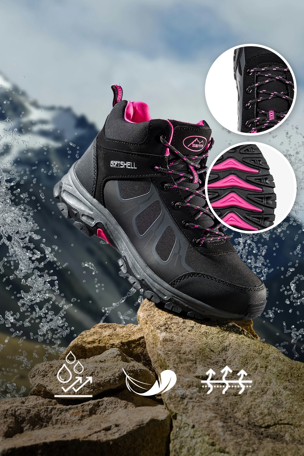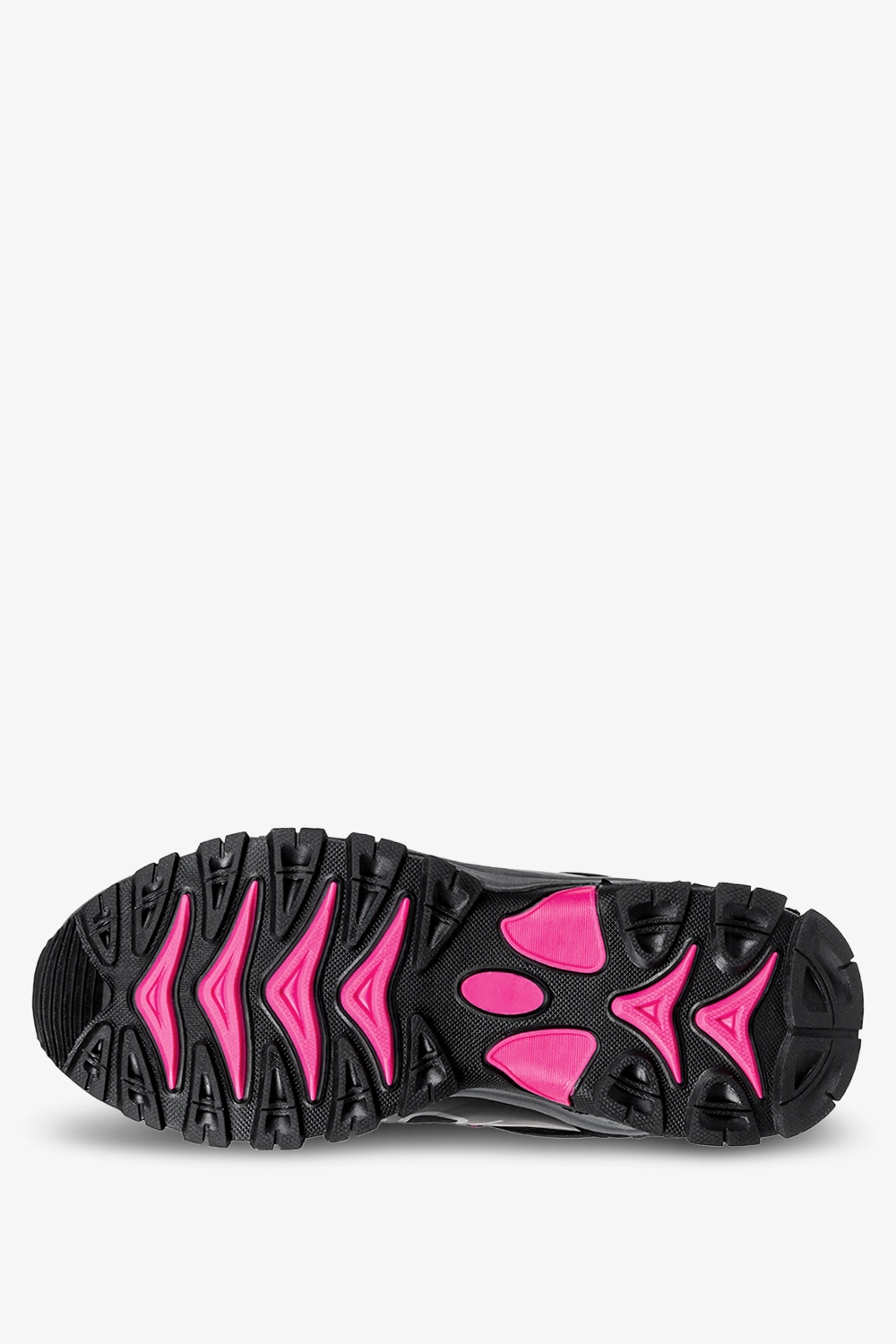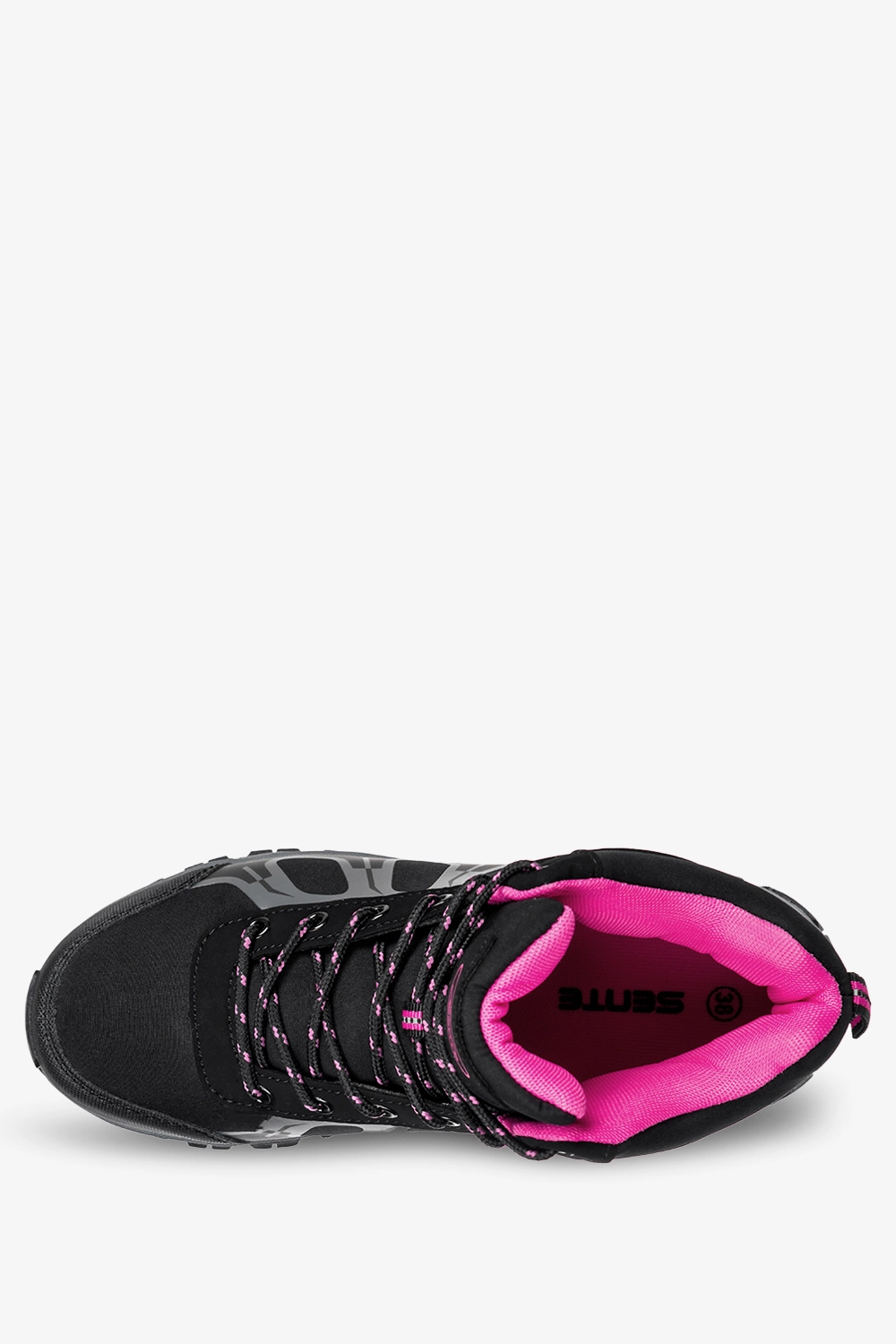 Czarny kolor z energetycznymi różowymi wstawkami i sznurówkami z różowymi akcentami nadaje butom nowoczesnego, kobiecego wyrazu. Ich uniwersalna stylistyka sprawia, że doskonale komponują się zarówno z odzieżą sportową, jak i codziennymi, casualowymi stylizacjami. Zaokrąglony nosek oraz bieżnikowana podeszwa podkreślają outdoorowy charakter obuwia, zapewniając przy tym stabilność i pewność kroku. To buty, które łączą modny wygląd z funkcjonalnością, dla kobiet, które cenią styl, ale nie chcą rezygnować z wygody.