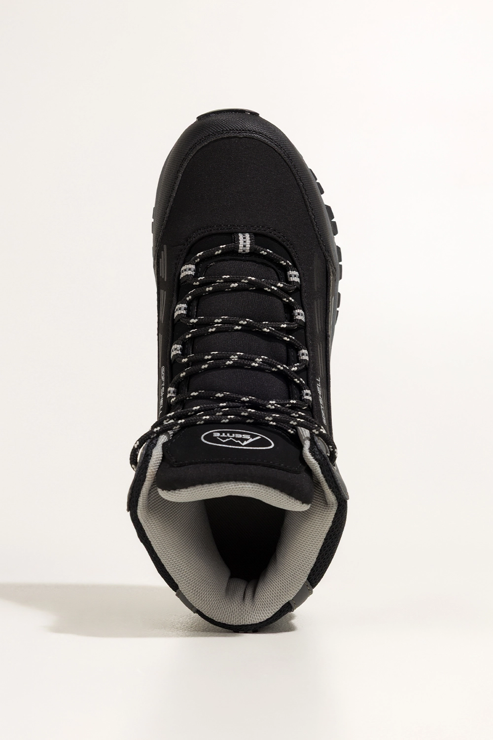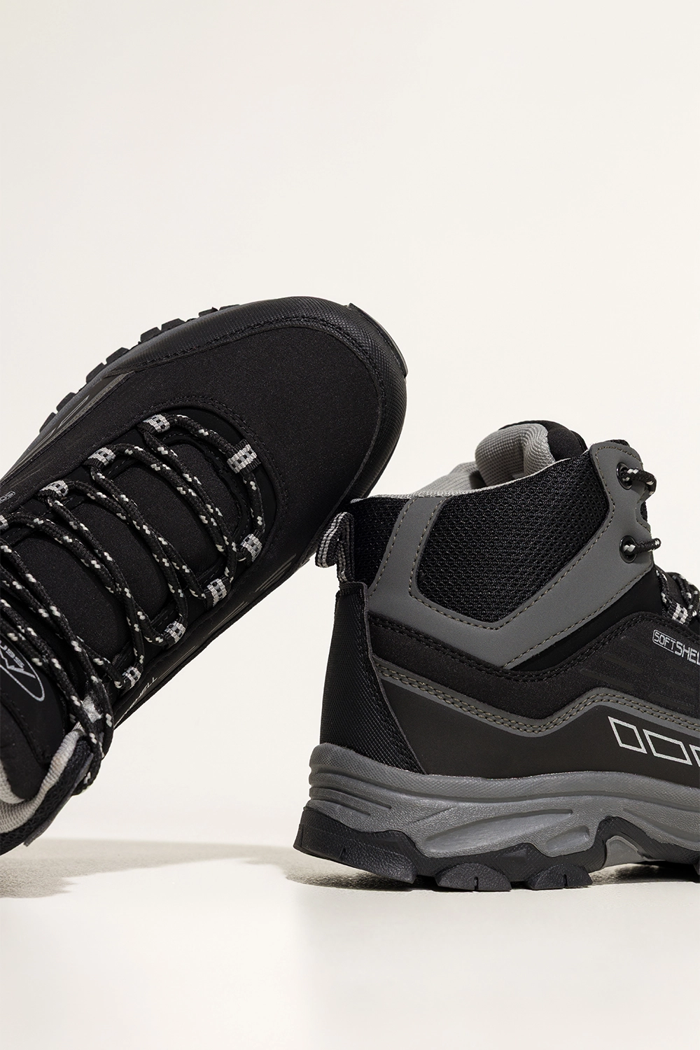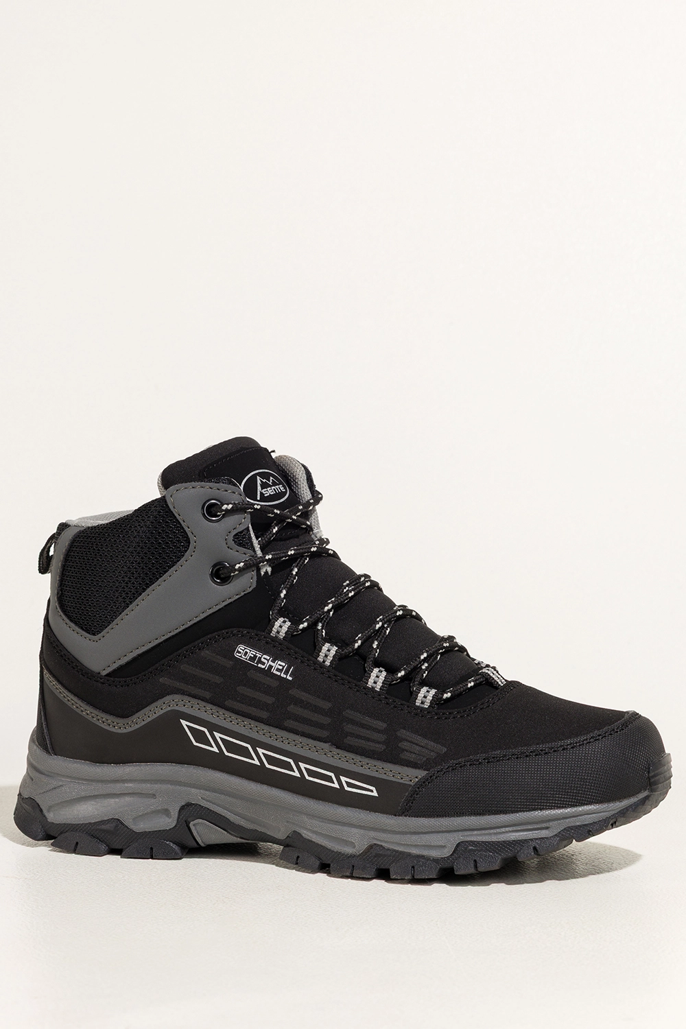 Miękka wkładka z materiału tekstylnego, zaokrąglony nosek i wysoka cholewka gwarantują stabilność i wygodę nawet podczas długich wędrówek. Bieżnikowana podeszwa poprawia przyczepność na nierównym terenie, a czarne sznurówki z szarymi akcentami dodają sportowego charakteru.