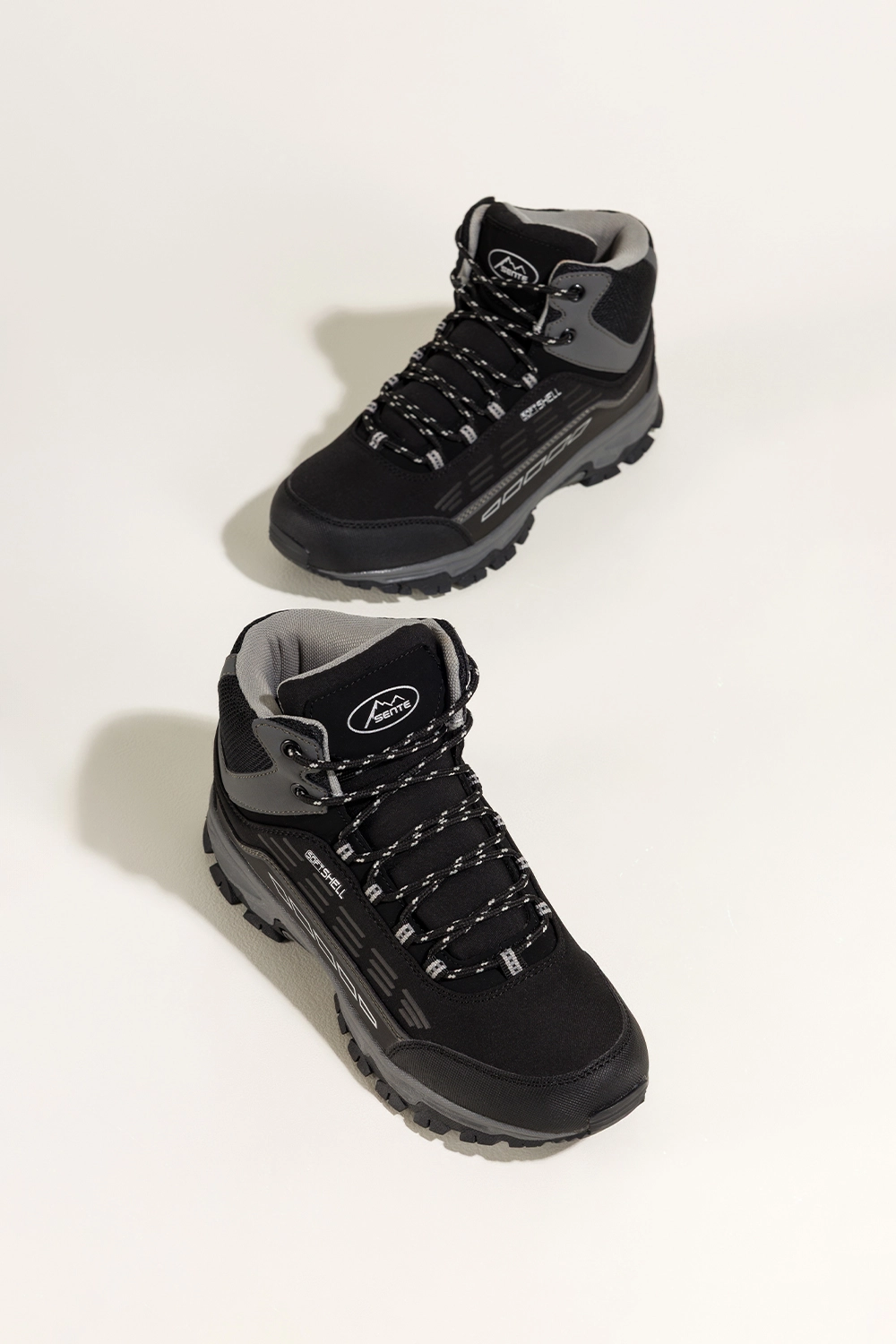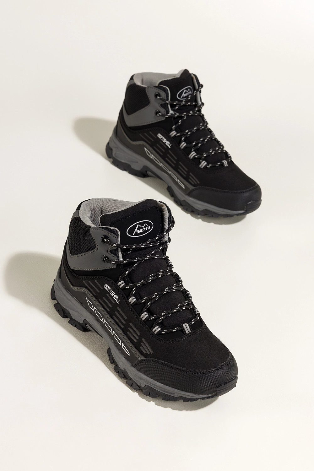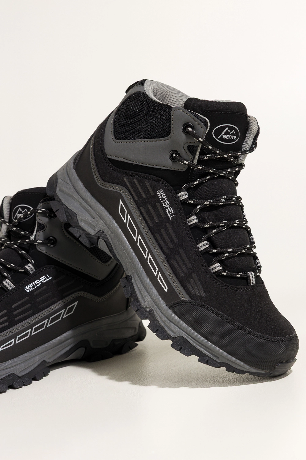 Miękka wkładka z materiału tekstylnego, zaokrąglony nosek i wysoka cholewka gwarantują stabilność i wygodę nawet podczas długich wędrówek. Bieżnikowana podeszwa poprawia przyczepność na nierównym terenie, a czarne sznurówki z szarymi akcentami dodają sportowego charakteru.