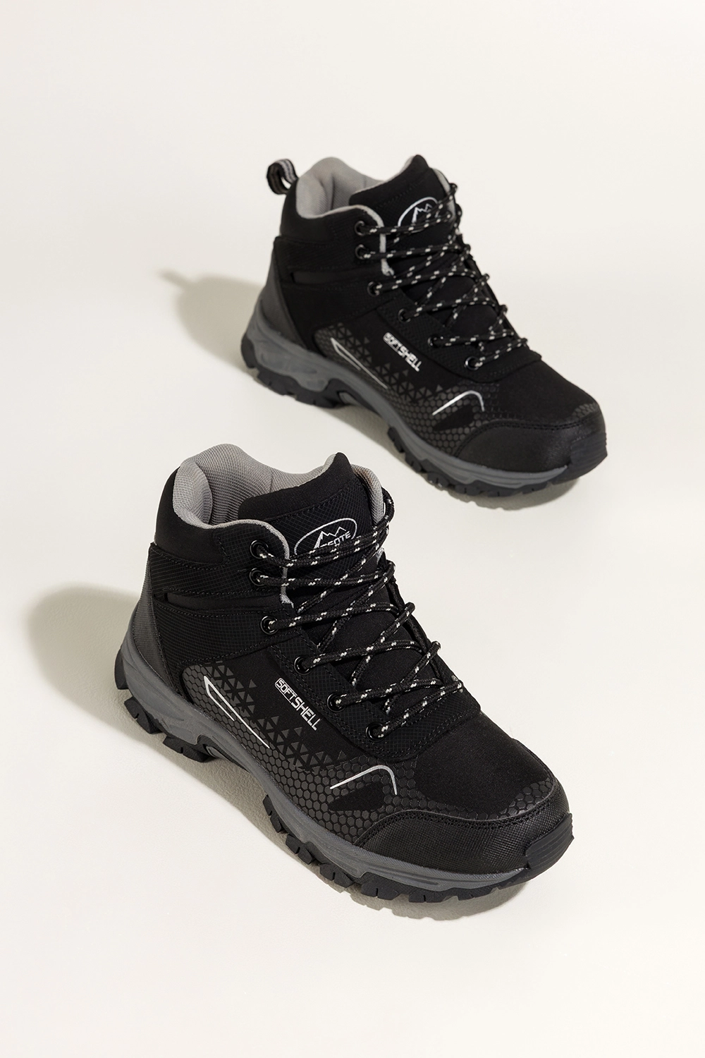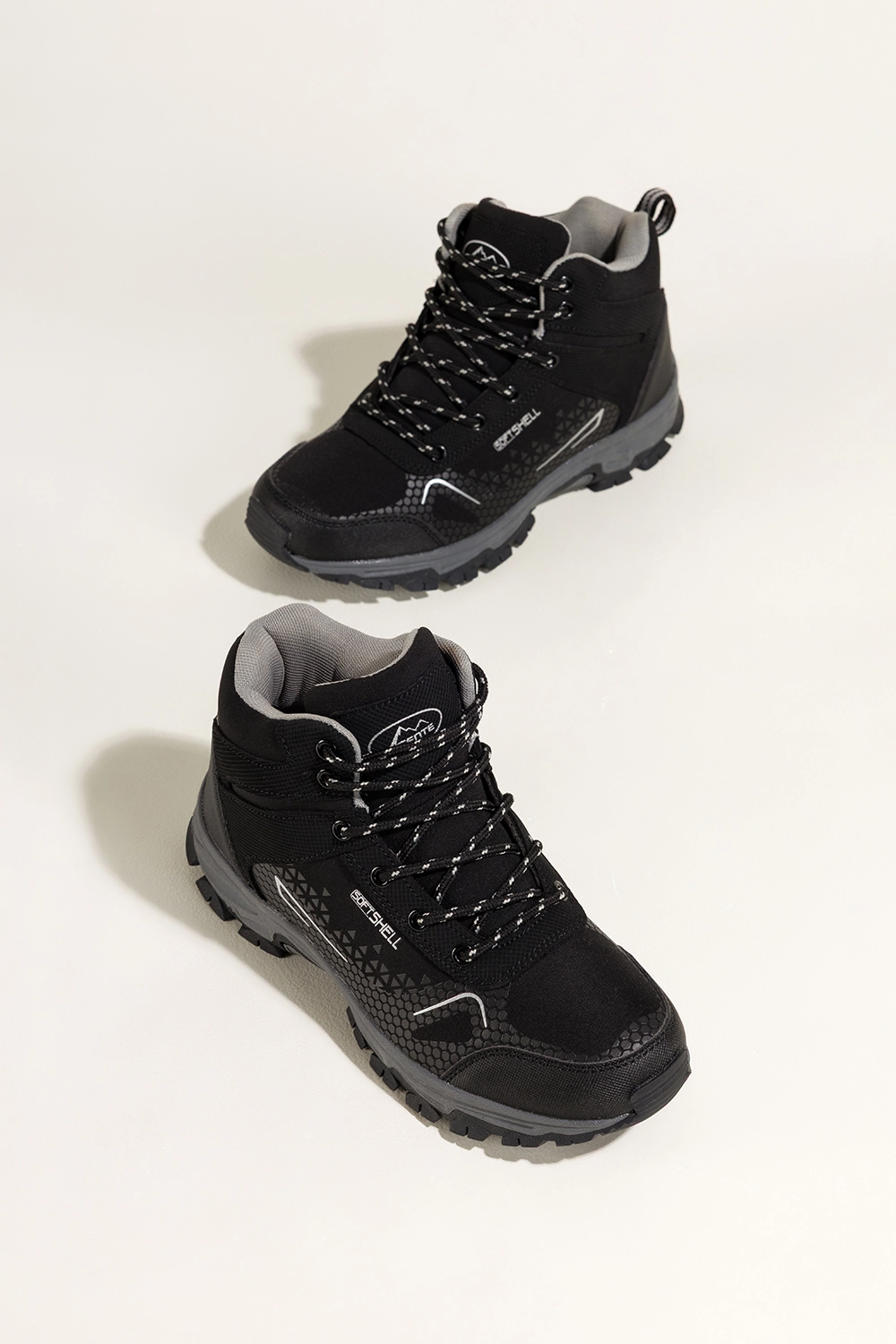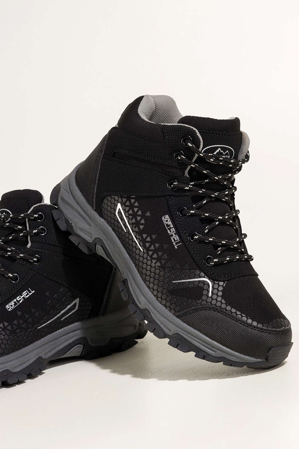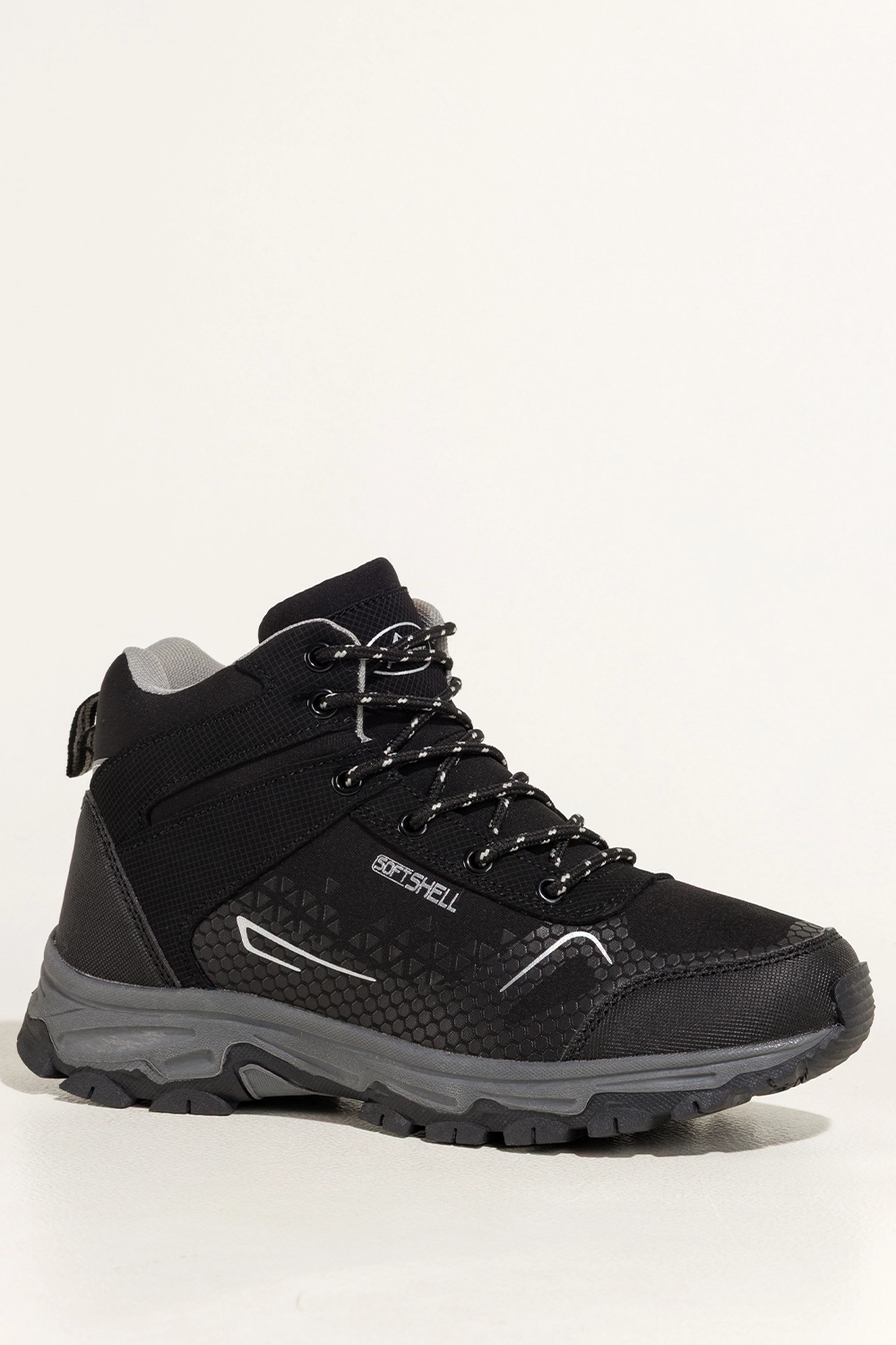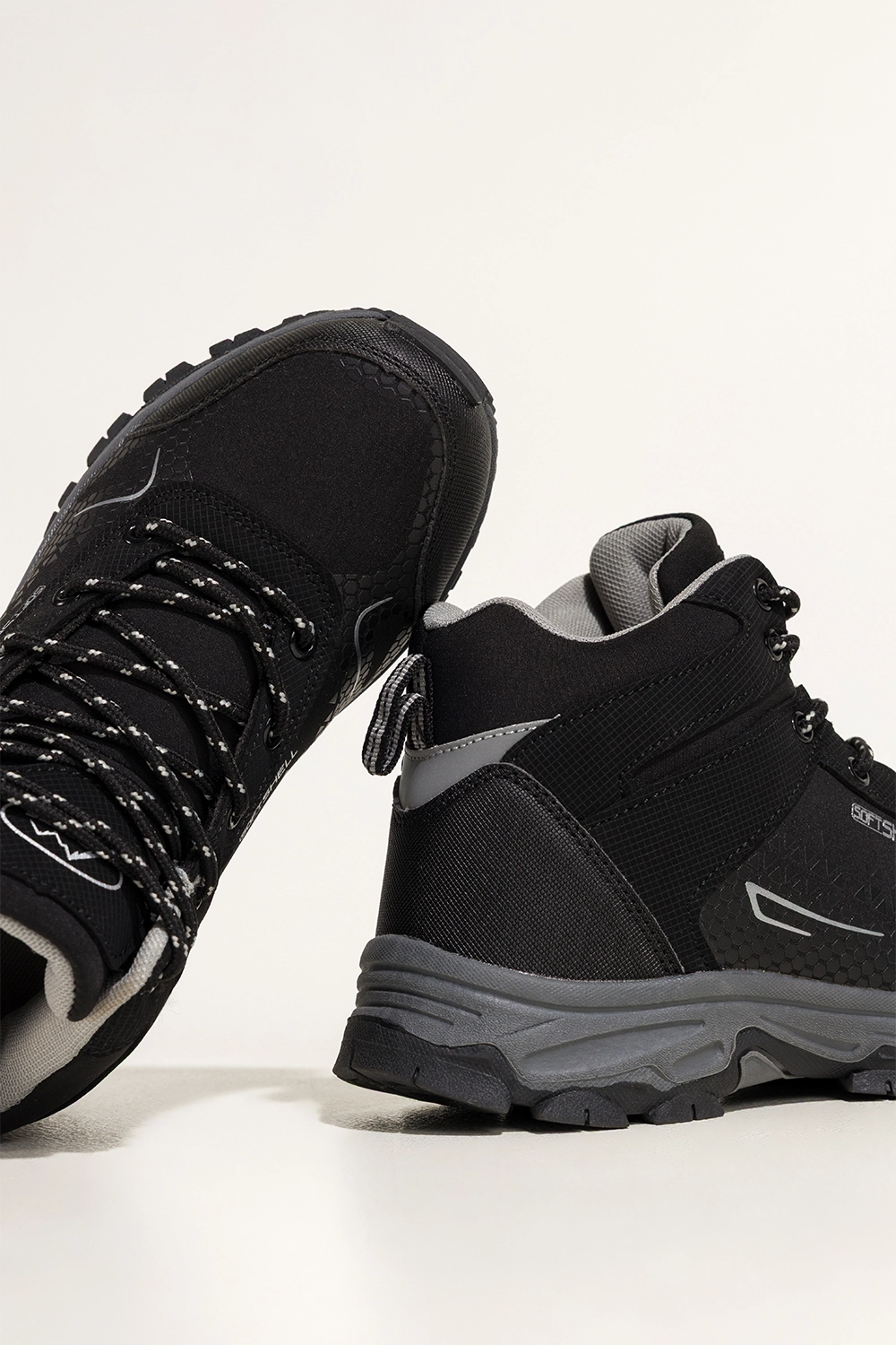 Czarne buty trekkingowe damskie z szarymi dodatkami sznurowane softshell Casu model Y7997-8, zachwycają solidnym wykonaniem z wysokogatunkowej skóry ekologicznej oraz oddychającego materiału softshell. Dzięki miękkiej wkładce tekstylnej zapewniają komfort nawet podczas długich wędrówek, a wysoka cholewka z czarnymi sznurówkami i szarymi akcentami gwarantuje stabilne trzymanie stopy.