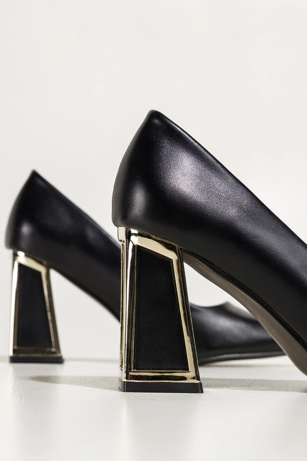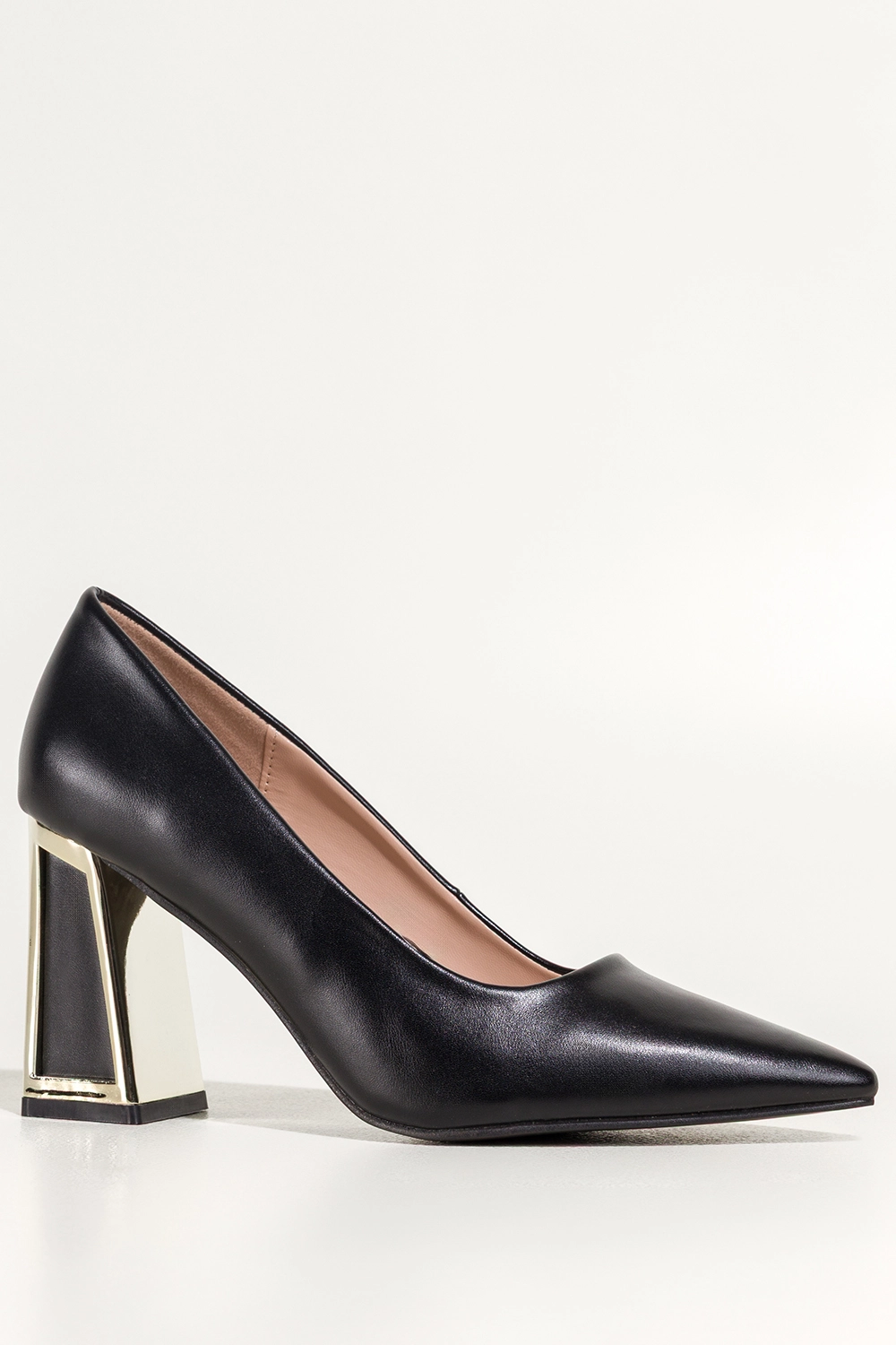 Czarne czółenka damskie na szerokim ozdobnym klocku ze złotymi akcentami Carla N476K, elegancka propozycja w wyrazistej, nowoczesnej odsłonie. Głęboka czerń oraz szpiczasty nosek tworzą klasyczną linię, a ozdobny klocek ze złotymi akcentami dodaje im efektownego, luksusowego charakteru.