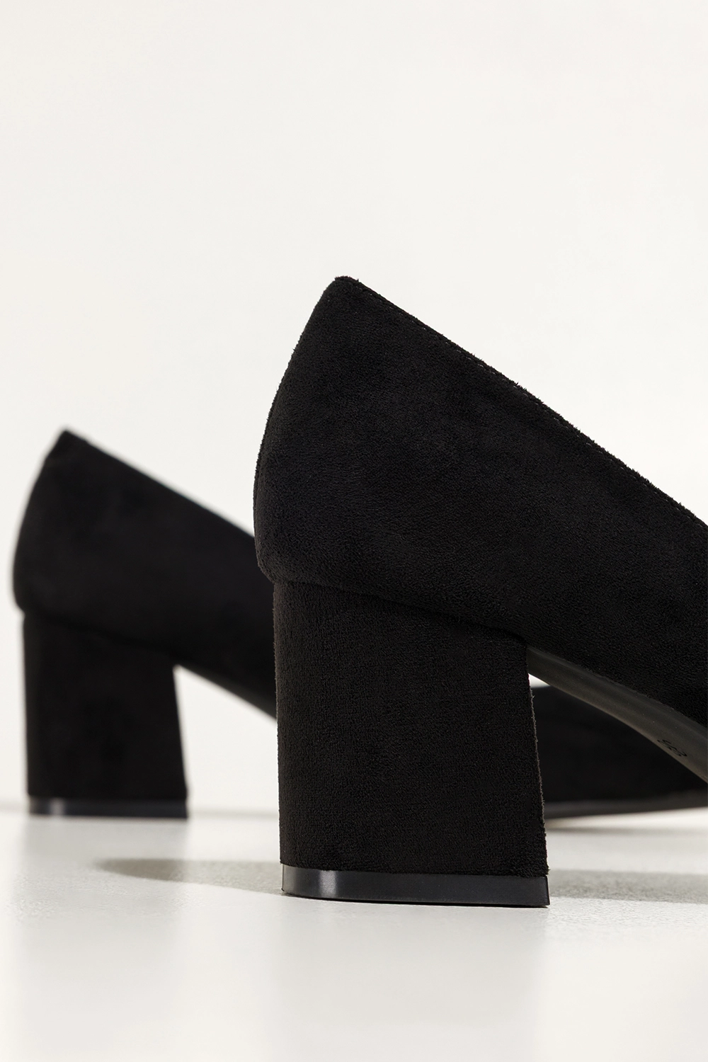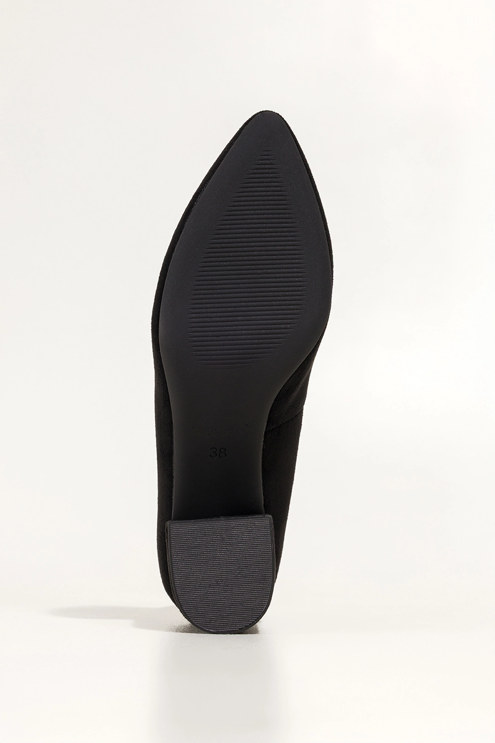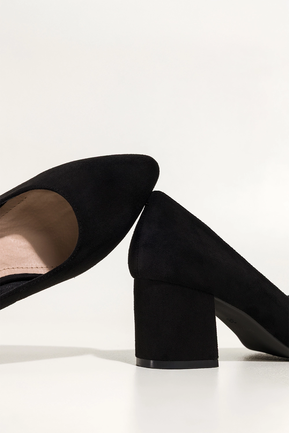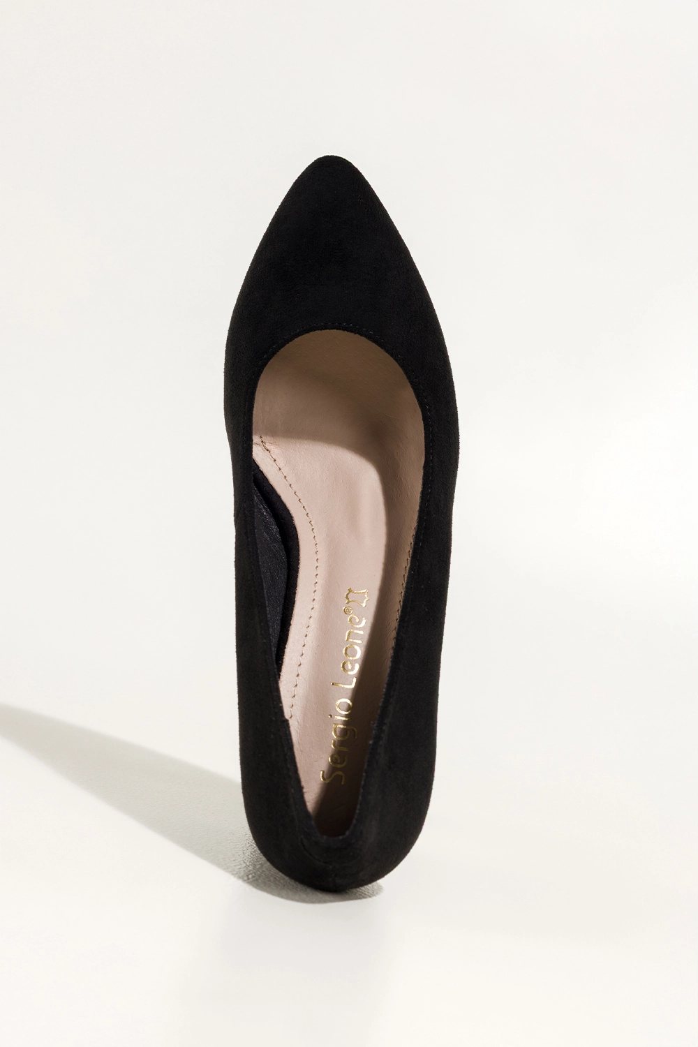 Czarne czółenka damskie Sergio Leone na niskim obcasie skórzana wkładka KY588. Wykonane z wysokogatunkowego zamszu ekologicznego, zachwycają aksamitną fakturą i starannym wykończeniem. Miękka skórzana wkładka dba o wygodę stóp przez cały dzień, nawet przy intensywnym użytkowaniu. Szeroki, stabilny obcas typu słupek o optymalnej wysokości zapewnia doskonałe podparcie i swobodę ruchów, nie rezygnując z kobiecego wyglądu.