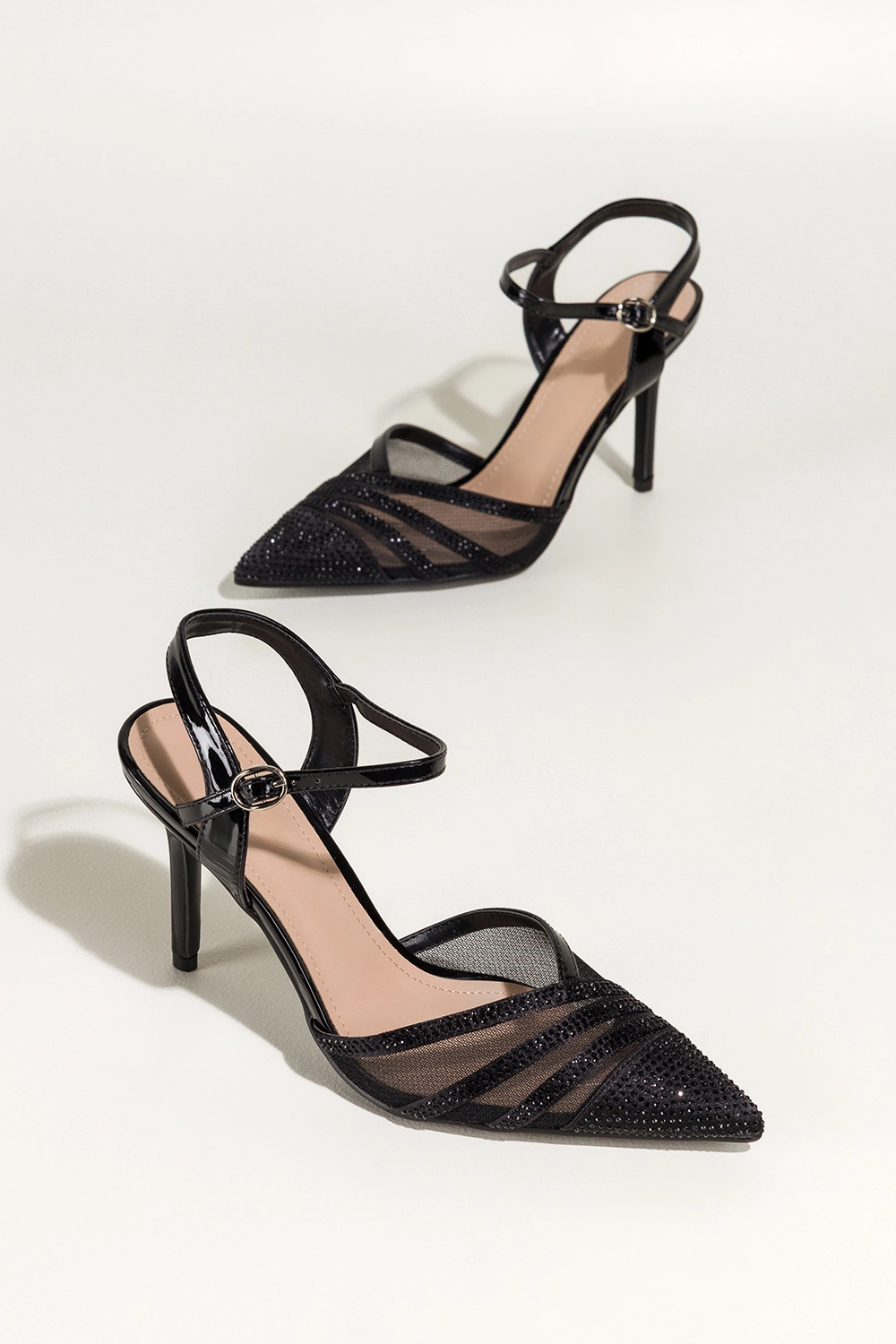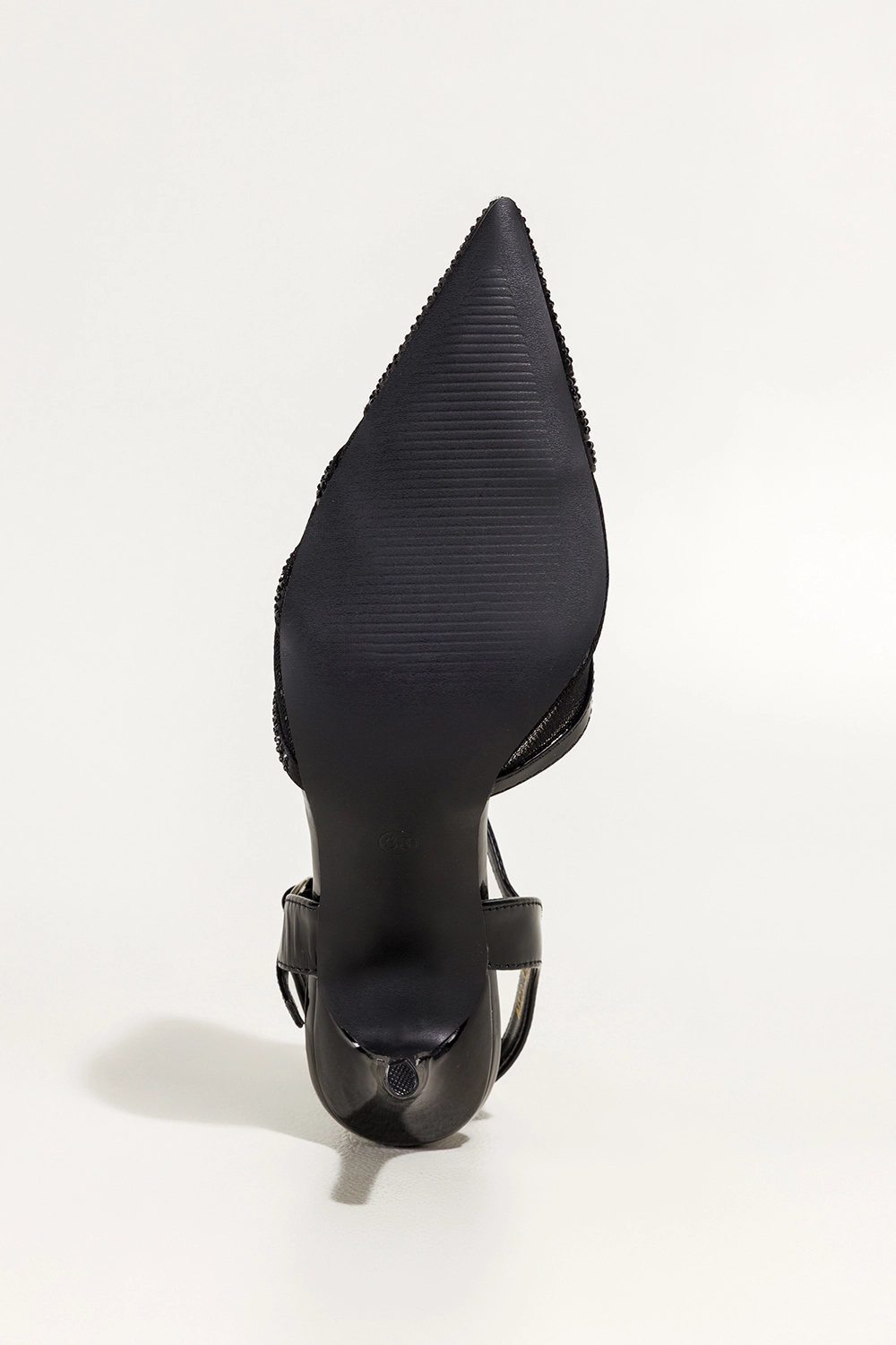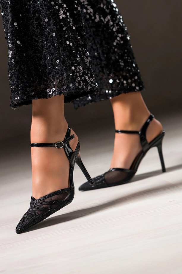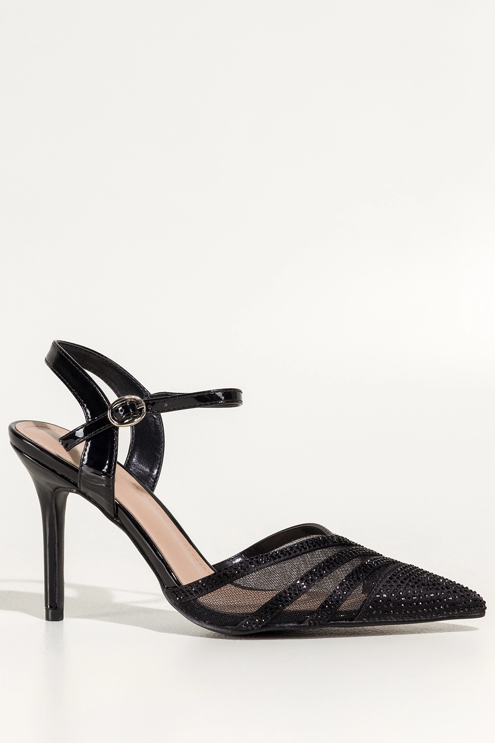 Czarne czółenka damskie szpilki z siateczką ozdobione cyrkoniami odkryta pięta Carla model N876, elegancja, komfort i precyzyjne wykończenie. Wykonane z wysokogatunkowej skóry ekologicznej, zachwycają nie tylko estetyką, ale i trwałością. Miękka wkładka ze skóry ekologicznej zapewnia wygodę nawet podczas długich godzin noszenia, a obcas typu szpilka pokryty lakierowaną skórą dodaje im klasy i nowoczesnego charakteru.