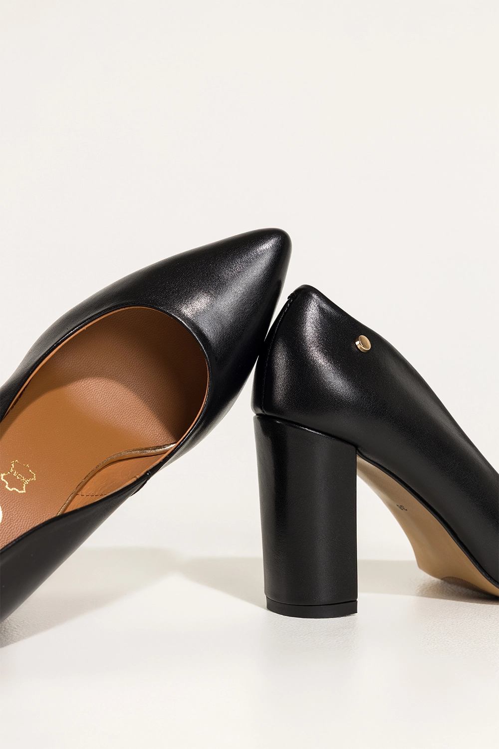 Stylowa elegancja i wyjątkowy detal czyli szpiczasty nosek oraz subtelne złote oczko na cholewce nadają modelowi unikalnego charakteru i szykownego wykończenia. Obcas typu słupek pokryty skórą nie tylko wysmukla sylwetkę, ale też zapewnia stabilność i komfort poruszania się. Ten fason perfekcyjnie wpisuje się zarówno w formalne stylizacje do pracy, jak i wieczorowe wyjścia. Uniwersalna czerń sprawia, że dopasujesz je do niemal każdej kreacji, od klasycznych spodni po eleganckie sukienki.