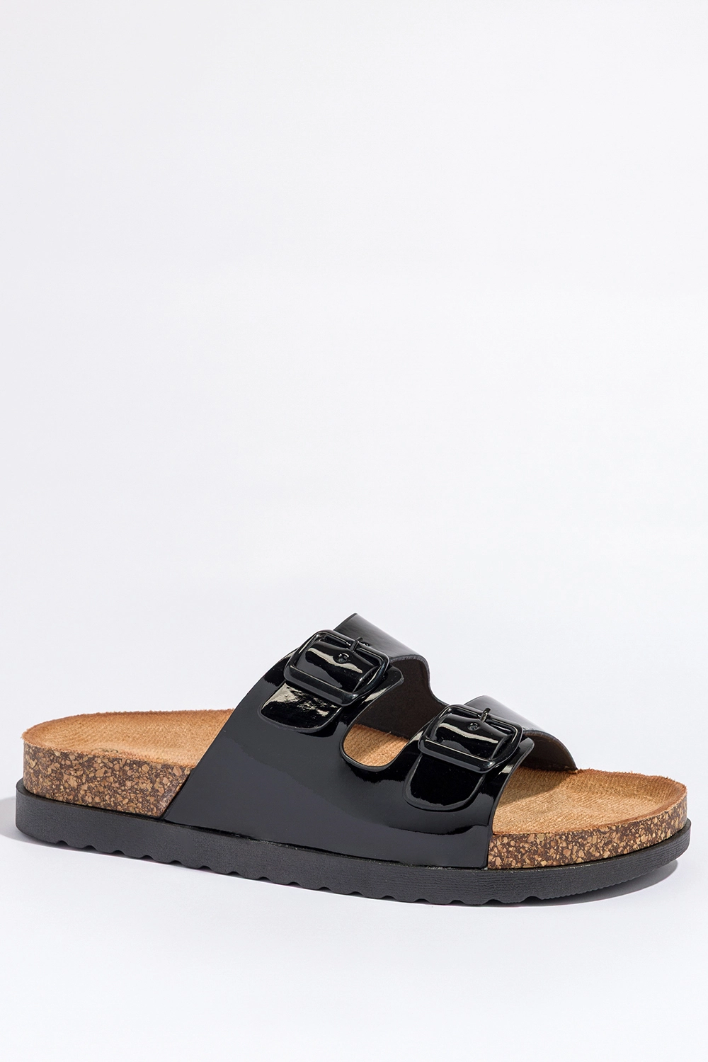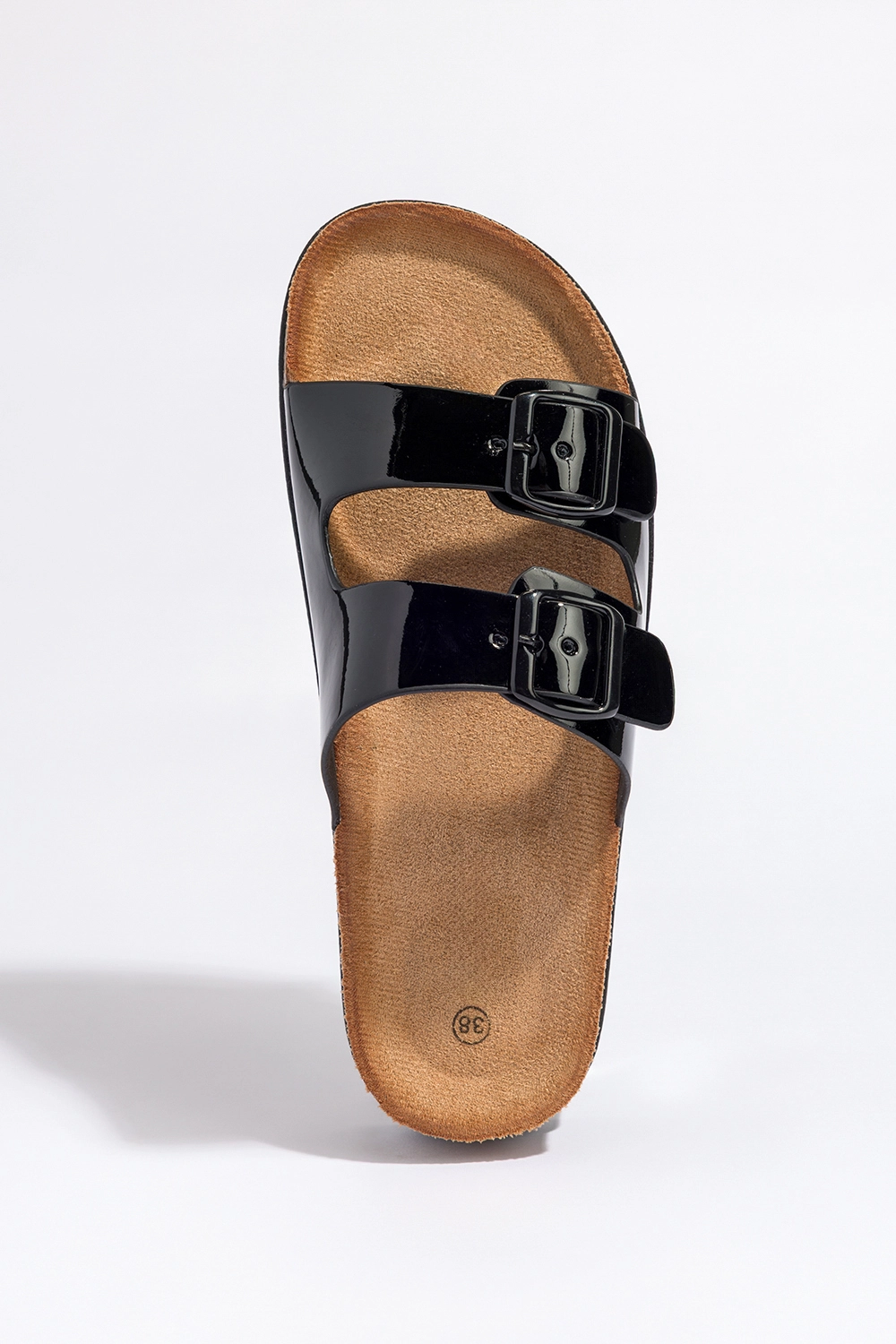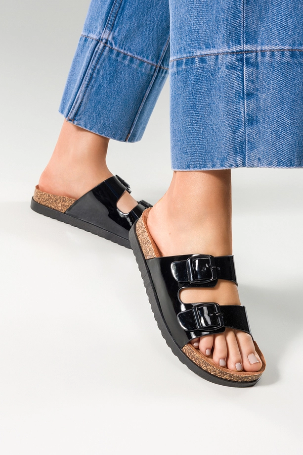 Czarne klapki damskie lakierowane paski z klamrami profilowana korkowa podeszwa Carla model 2441-1 to absolutny must-have dla każdej kobiety, która ceni sobie połączenie stylu, wygody i nowoczesnego designu. Wykonane z wysokogatunkowej lakierowanej skóry ekologicznej, zachwycają połyskującą fakturą i eleganckim wykończeniem. Ten model klapek doskonale wpisuje się w aktualne trendy mody, oferując jednocześnie ponadczasowy wygląd i niezrównany komfort użytkowania. Dzięki profilowanej korkowej podeszwie zapewniają naturalne podparcie stopy, co przekłada się na zdrowie i dobre samopoczucie przez cały dzień. Ten fason to kwintesencja kobiecej swobody – wsuwane, lekkie i niezwykle wygodne. Świetnie sprawdzą się zarówno w miejskim zgiełku, jak i podczas wypoczynku na łonie natury.