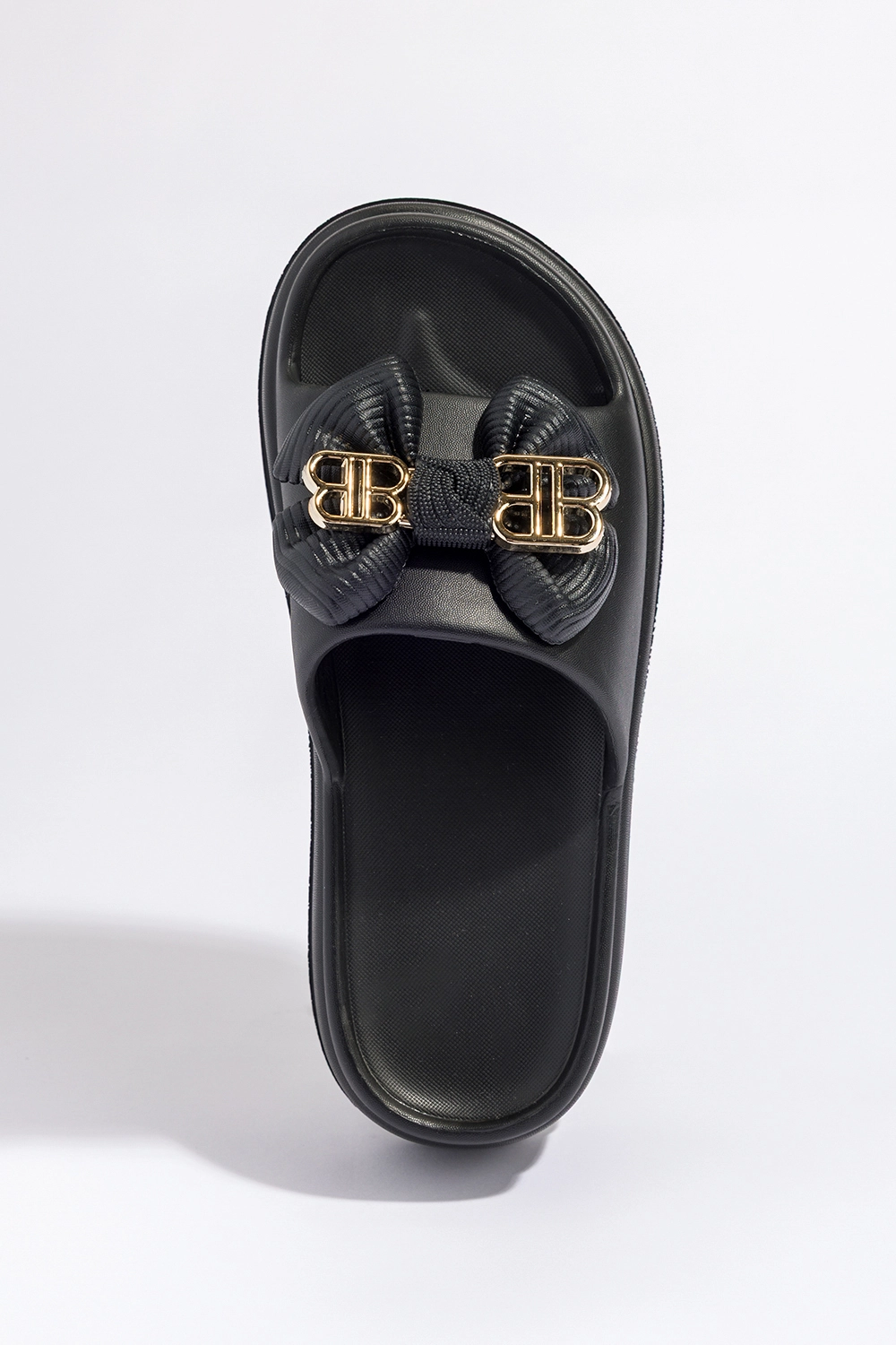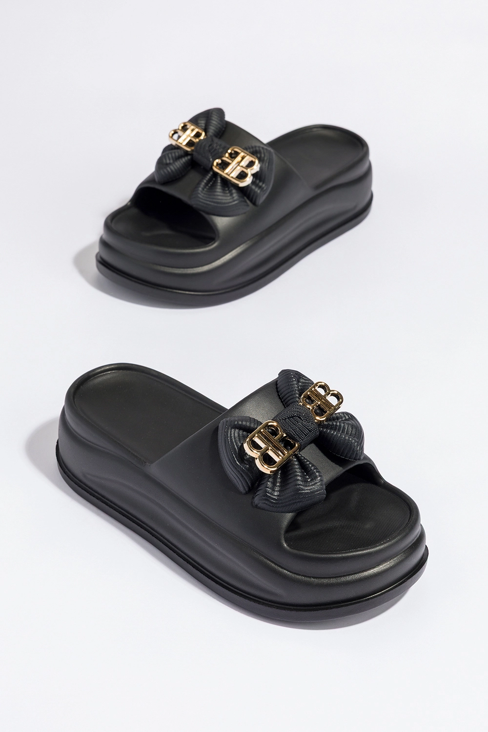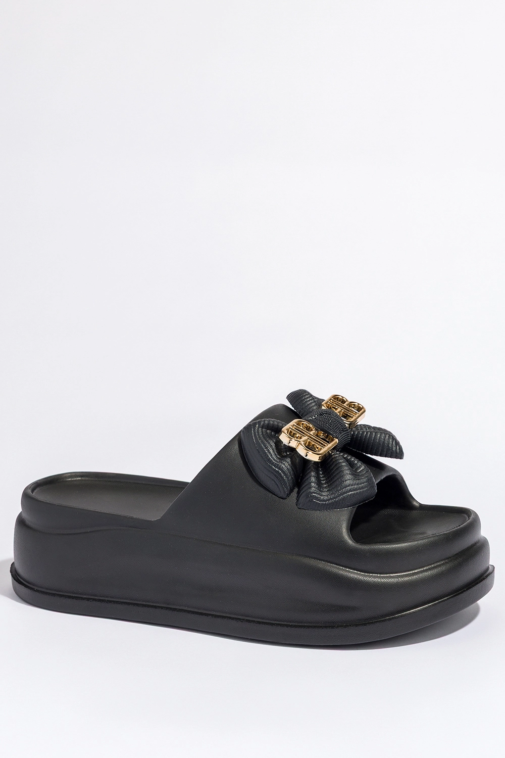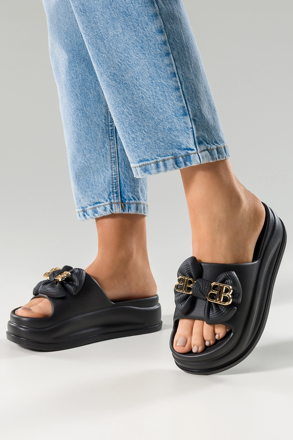 Czarne klapki damskie na piankowej platformie z kokardą i złotymi ozdobami Casu 2445-1