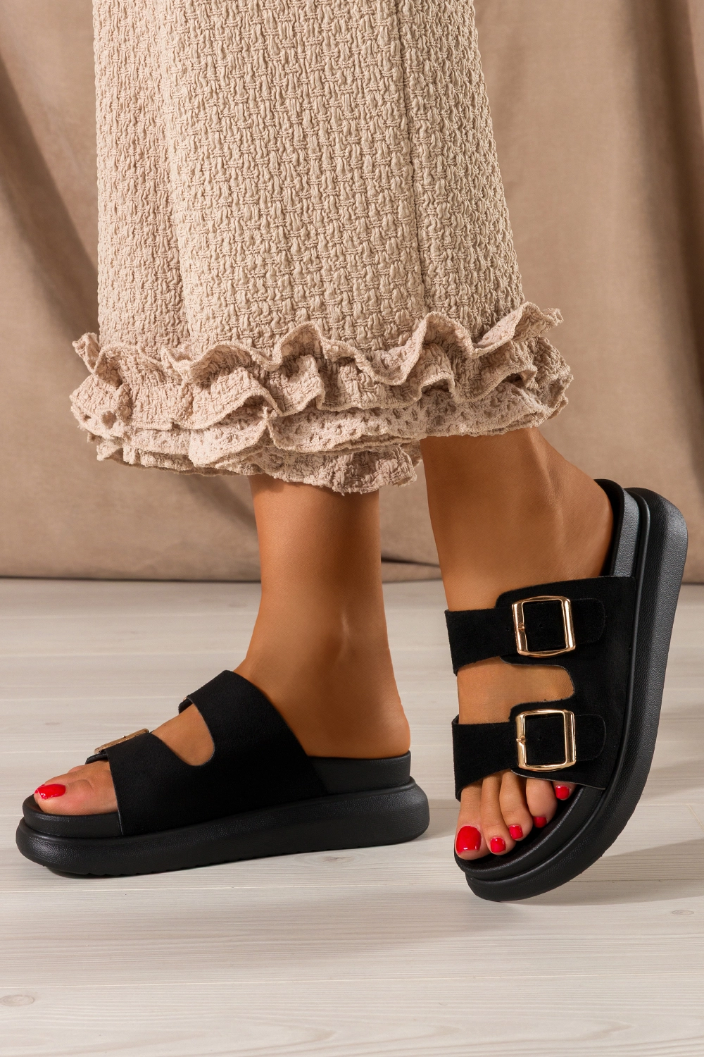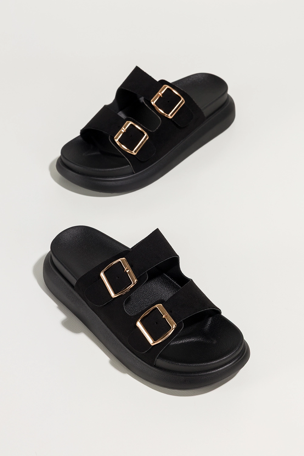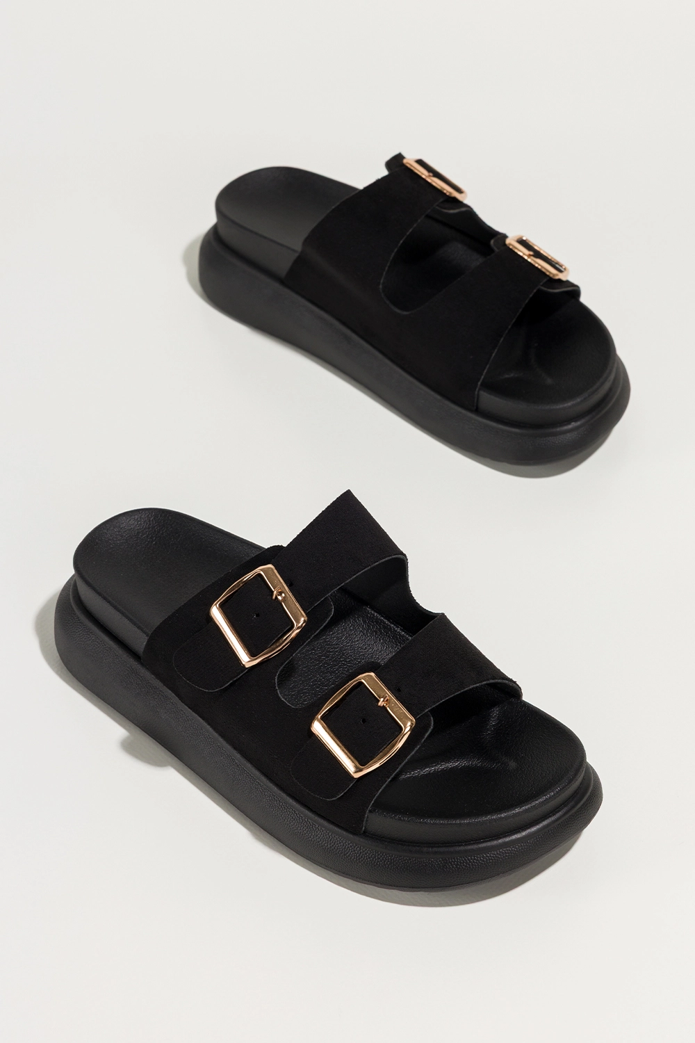Funkcjonalność i unikalne cechy przekładają się bezpośrednio na komfort i zadowolenie z użytkowania. Klapki są nie tylko modne, ale również niezwykle praktyczne – idealne na wakacje, do miasta, na zakupy czy do pracy w cieplejsze dni. Czarna platforma dodaje kilku centymetrów wzrostu, optycznie wysmuklając sylwetkę, a jednocześnie zachowując wygodę typową dla płaskiego obuwia. Dzięki regulowanym paskom ze złotymi klamrami można łatwo dopasować klapki do kształtu stopy, co dodatkowo zwiększa komfort. Materiały zastosowane w produkcie są przyjazne dla środowiska i nie powodują otarć, nawet przy dłuższym użytkowaniu. To produkt, który łączy estetykę z praktycznością – dokładnie to, czego szukają nowoczesne kobiety.
