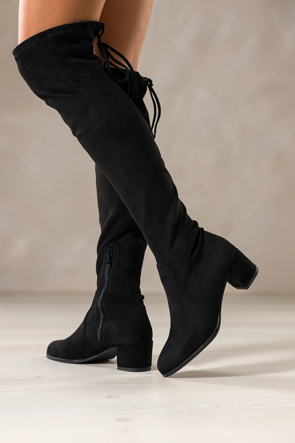Czarne kozaki Sergio Leone za kolano na niskim obcasie elastyczna cholewka z wiązaniem model PA74586, to połączenie luksusu i wygody, które pokochasz od pierwszego kroku. Wykonane z miękkiej, wysokogatunkowej zamszowej skóry ekologicznej, gwarantują nie tylko trwałość, ale i elegancki wygląd. Dzięki elastycznej cholewce perfekcyjnie dopasowują się do nogi, podkreślając jej kształt i zapewniając stabilność podczas chodzenia.