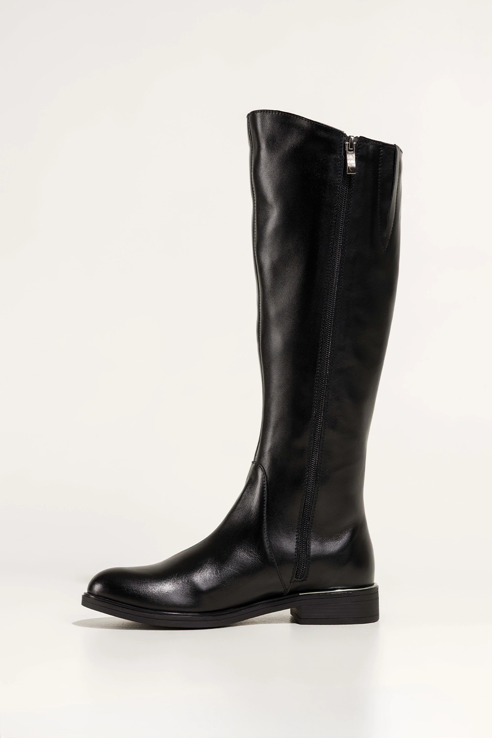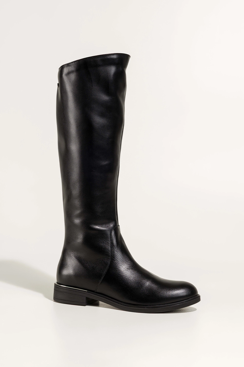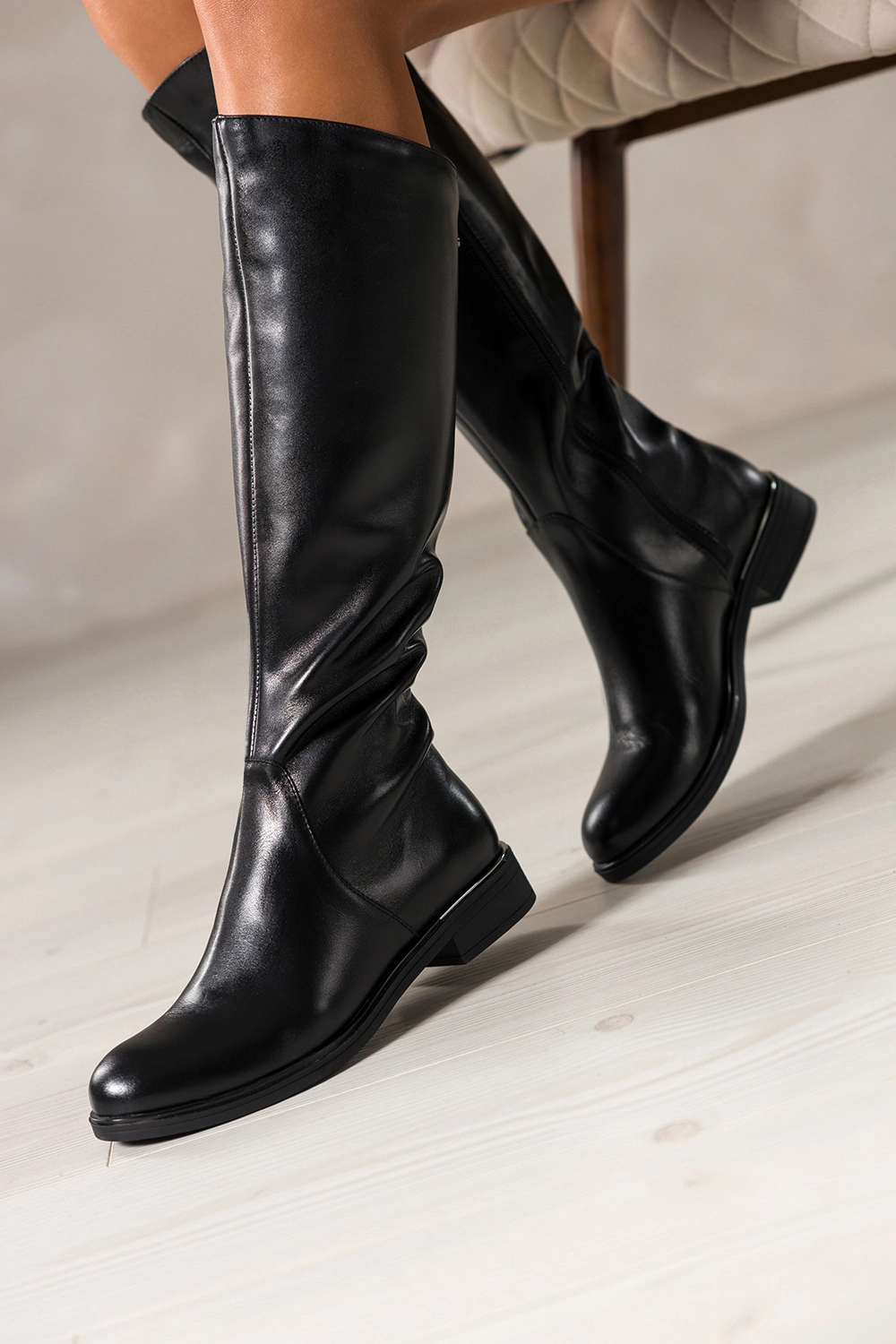 Obcas w formie niskiego, stabilnego klocka ze srebrnym akcentem dodaje niepowtarzalnego charakteru, jednocześnie zapewniając maksymalną stabilność. Subtelna, elastyczna guma w cholewce oraz stalowe oczko w górnej części cholewki nie tylko podkreślają nowoczesny design, ale również ułatwiają dopasowanie do łydki. Zaokrąglony nosek i długość przed kolano gwarantują smukły wygląd nóg oraz pasują do wielu stylizacji, od casualowych jeansów po eleganckie sukienki.