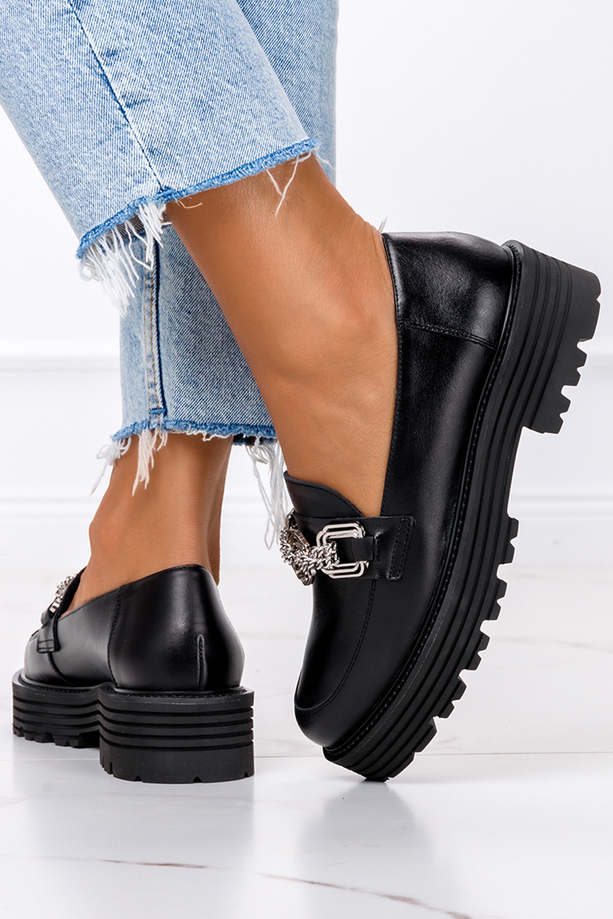 Klasyczna czerń mokasynów na bieżnikowanej platformie sprawia, że są one niezwykle uniwersalne i pasują do wielu stylizacji. Zaokrąglony nosek i subtelne przeszycia na cholewce dodają im elegancji, natomiast bieżnikowana platforma ze żłobieniami nadaje całości nowoczesnego charakteru. Ozdobna srebrna aplikacja na przodzie stanowi modny akcent, który wyróżnia ten model na tle innych. Mokasyny idealnie sprawdzą się zarówno w casualowych, jak i bardziej formalnych stylizacjach. Połącz je z jeansami i marynarką na co dzień lub z sukienką na spotkanie biznesowe – w każdej wersji będą wyglądać perfekcyjnie.