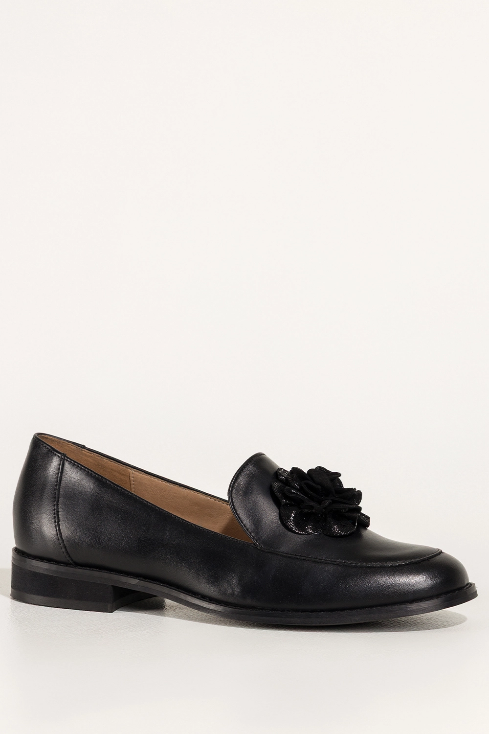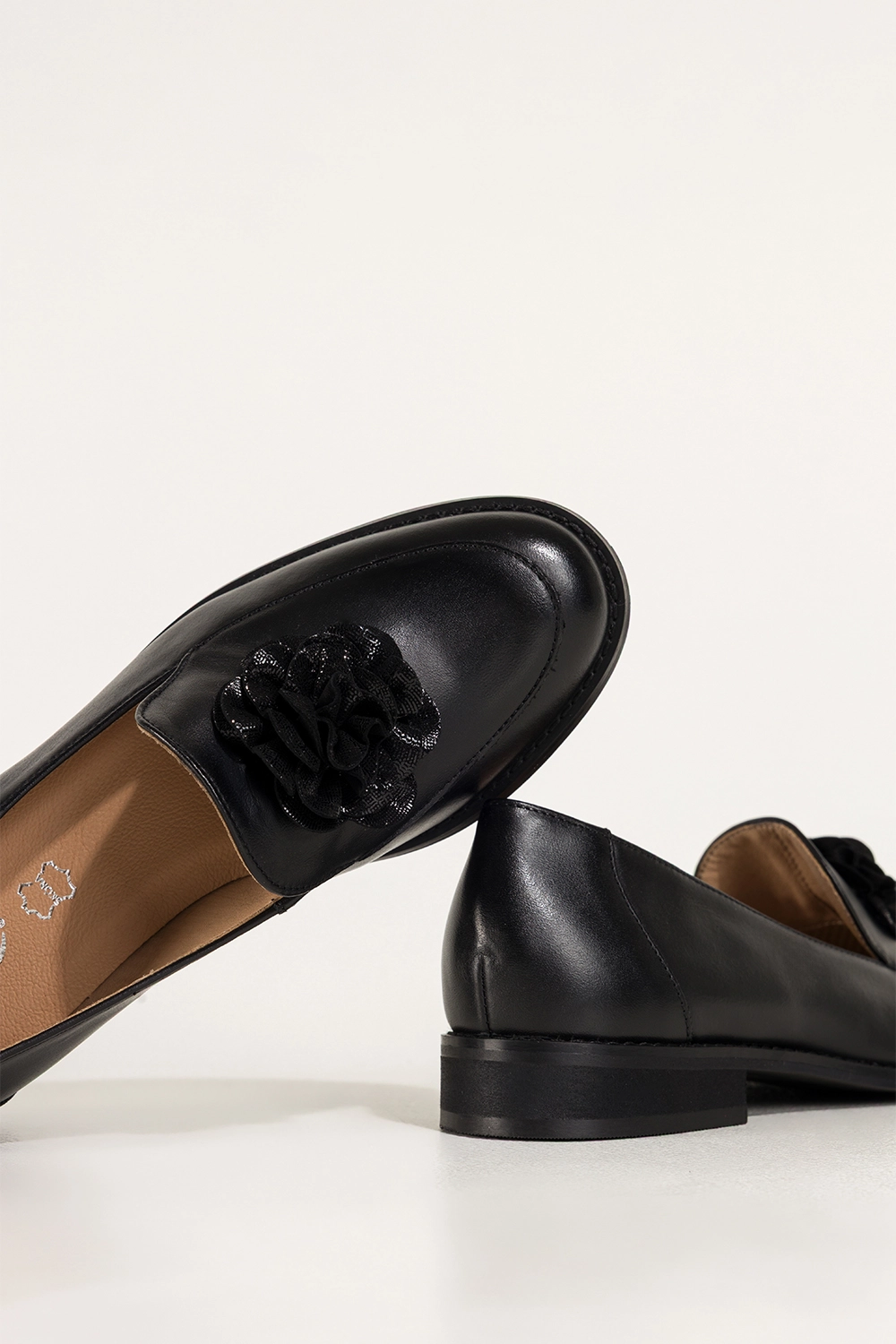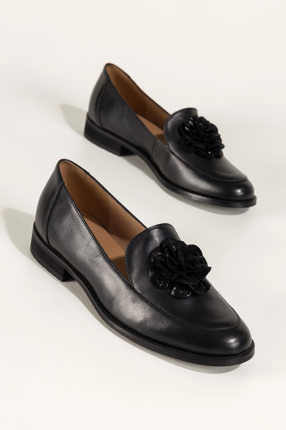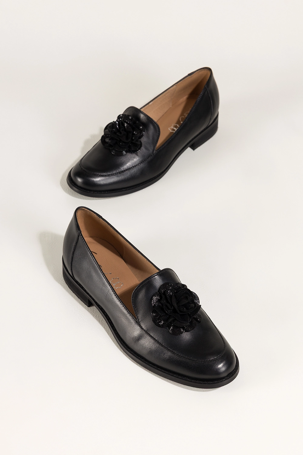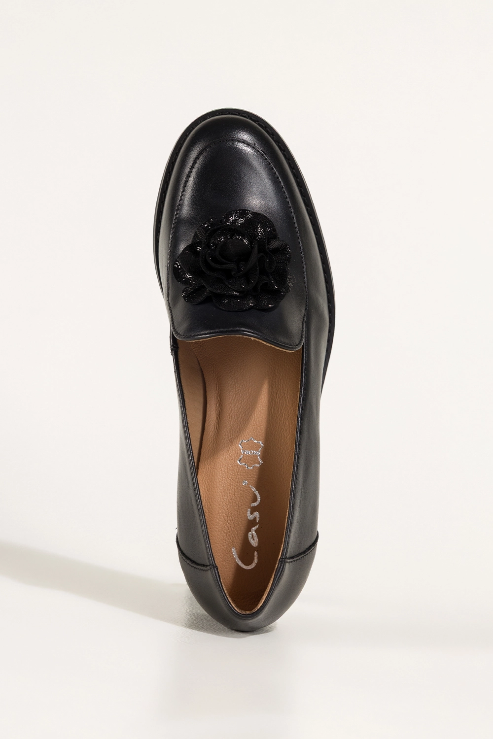 Czarne mokasyny skórzane damskie półbuty płaskie z ozdobnym kwiatem na cholewce PRODUKT POLSKI Casu model 8105, to połączenie elegancji i komfortu. Wyprodukowane z wysokogatunkowej skóry naturalnej. Miękka, skórzana wkładka otula stopę, zapewniając wygodę przez cały dzień, a staranne wykończenie podkreśla dbałość o każdy detal.