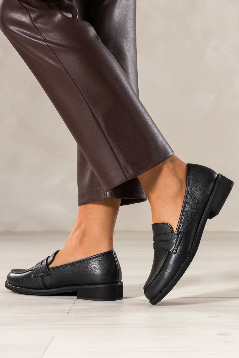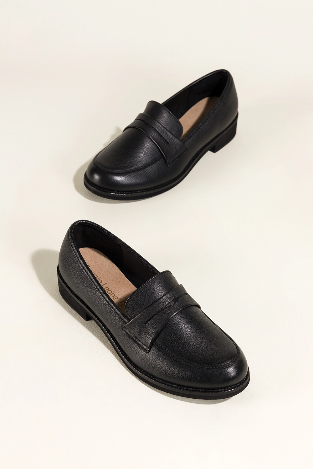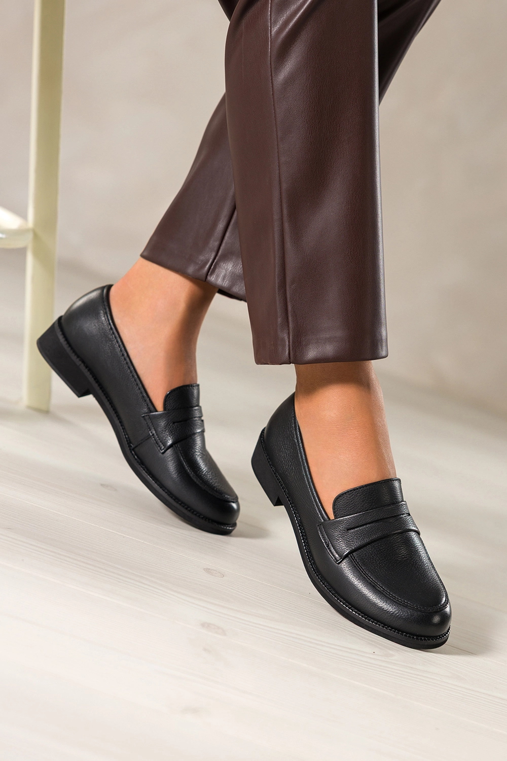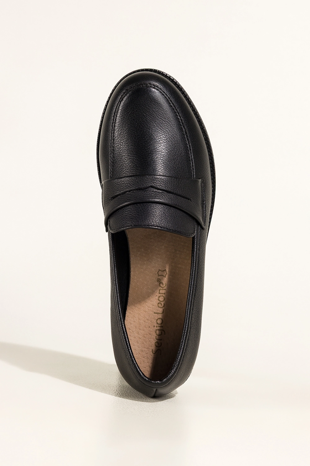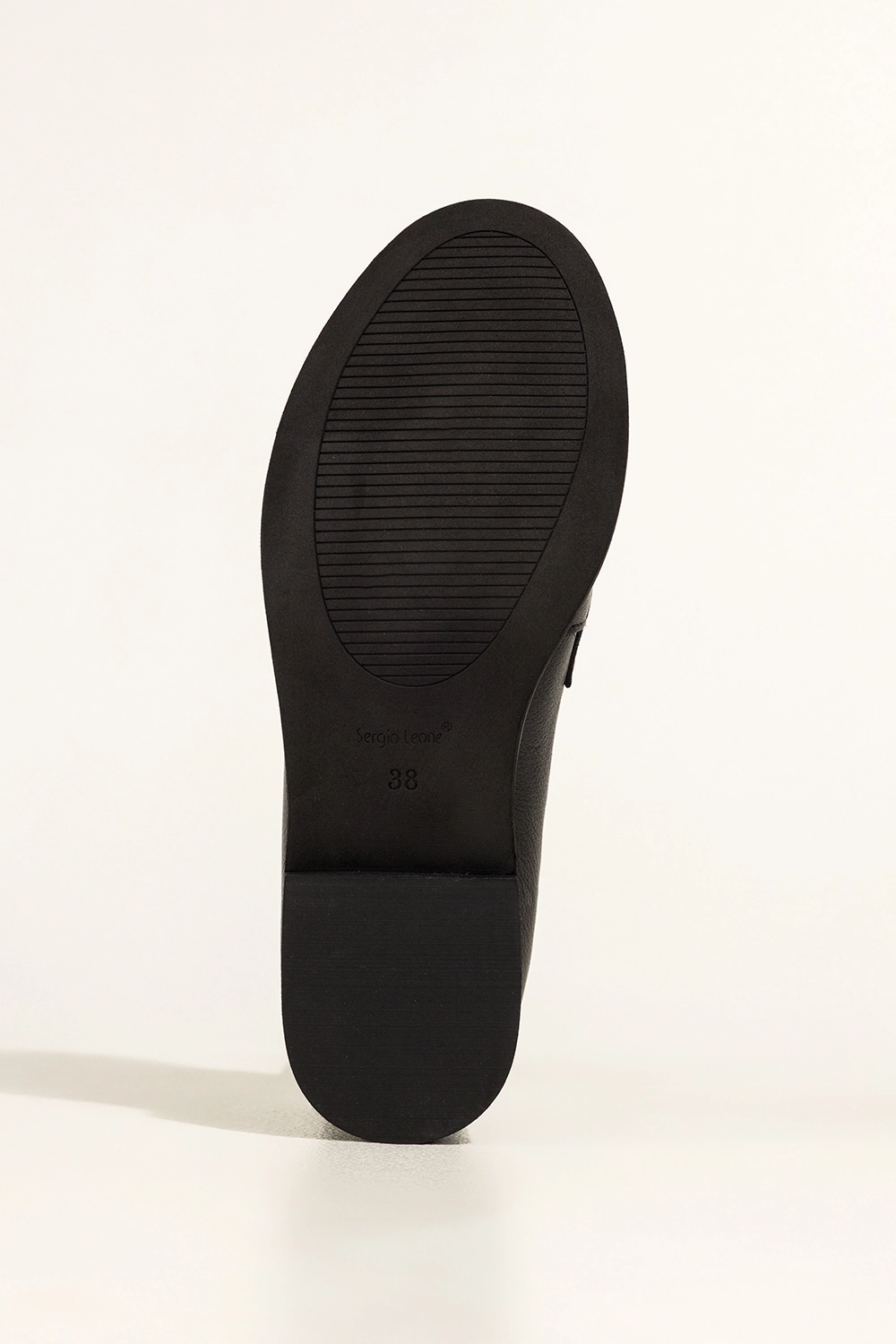 Czarne mokasyny skórzane damskie Sergio Leone na niskim szerokim obcasie ozdobny pasek na cholewce model NP74887-H. Wykonane z miękkiej, wysokogatunkowej skóry naturalnej, zachwycają starannością wykonania i trwałością. Miękka skórzana wkładka dopasowuje się do kształtu stopy, zapewniając całodzienny komfort, nawet przy intensywnym użytkowaniu. Wsuwana konstrukcja gwarantuje łatwość zakładania i wygodę noszenia przez cały dzień.