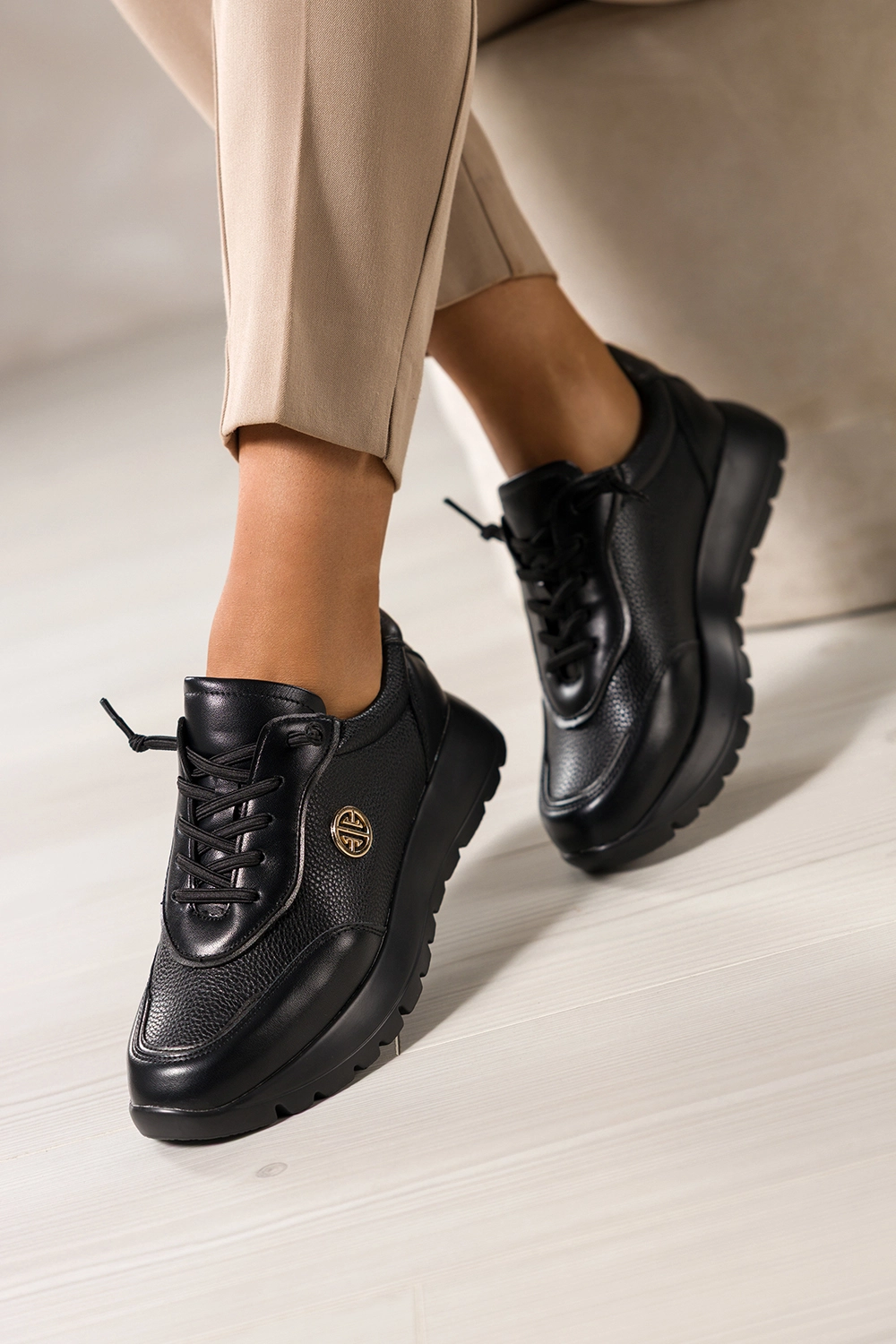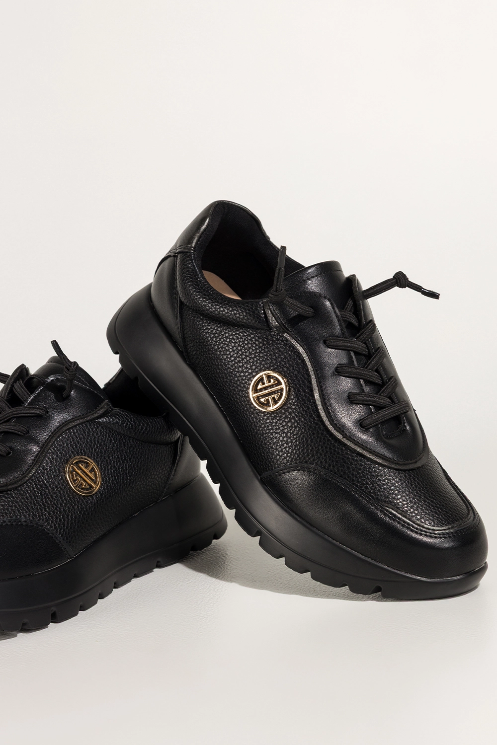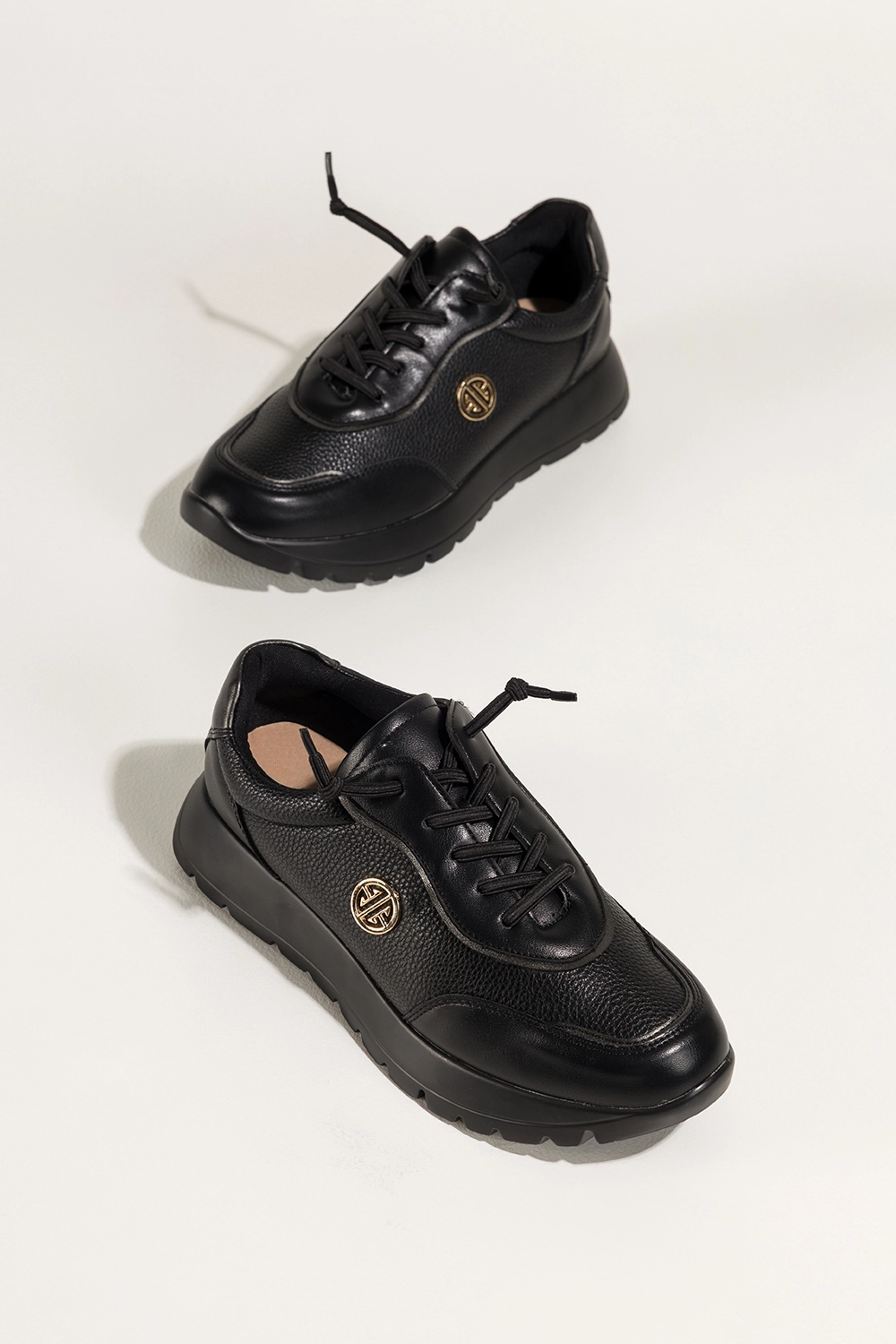 Czarne sneakersy damskie buty sportowe na platformie elastyczne sznurówki złota ozdoba skórzana wkładka Carla model QN0780-8 to połączenie nowoczesnego designu, wygody klasy premium oraz unikalnych detali, które przyciągają wzrok od pierwszego spojrzenia. To idealny wybór dla kobiet, które cenią sobie komfort w miejskim stylu, nie rezygnując przy tym z wyrazistego akcentu modowego. Sneakersy zostały wykonane z wysokogatunkowej skóry ekologicznej, co nie tylko świadczy o trosce o środowisko, ale również gwarantuje trwałość i odporność na codzienne użytkowanie. Zastosowanie miękkiej, skórzanej wkładki poprawia komfort nawet podczas wielogodzinnego chodzenia, sprawiając, że model staje się Twoim niezawodnym towarzyszem każdego dnia. Cechą wyróżniającą ten model jest złota ozdoba na cholewce, która nadaje obuwiu luksusowego charakteru, bez względu na to, czy łączysz je z dresami, dżinsami czy sukienką.