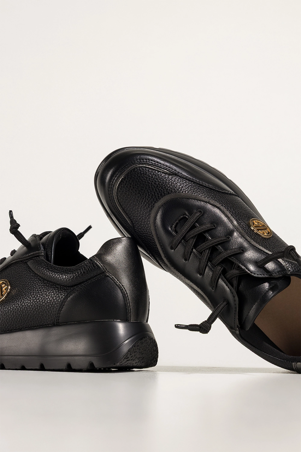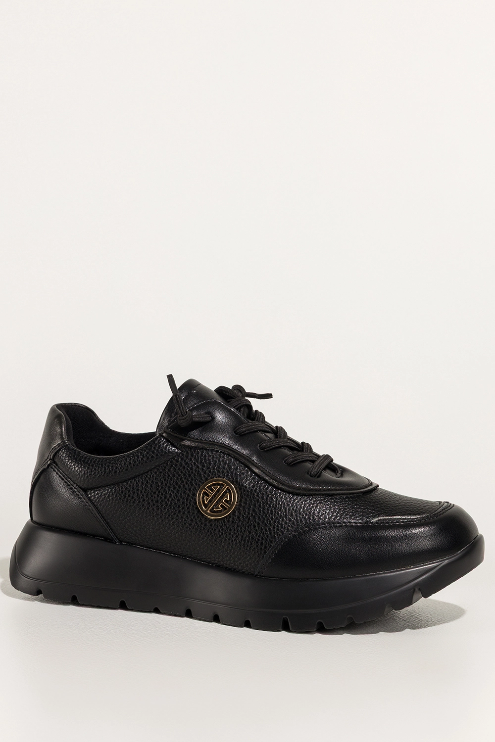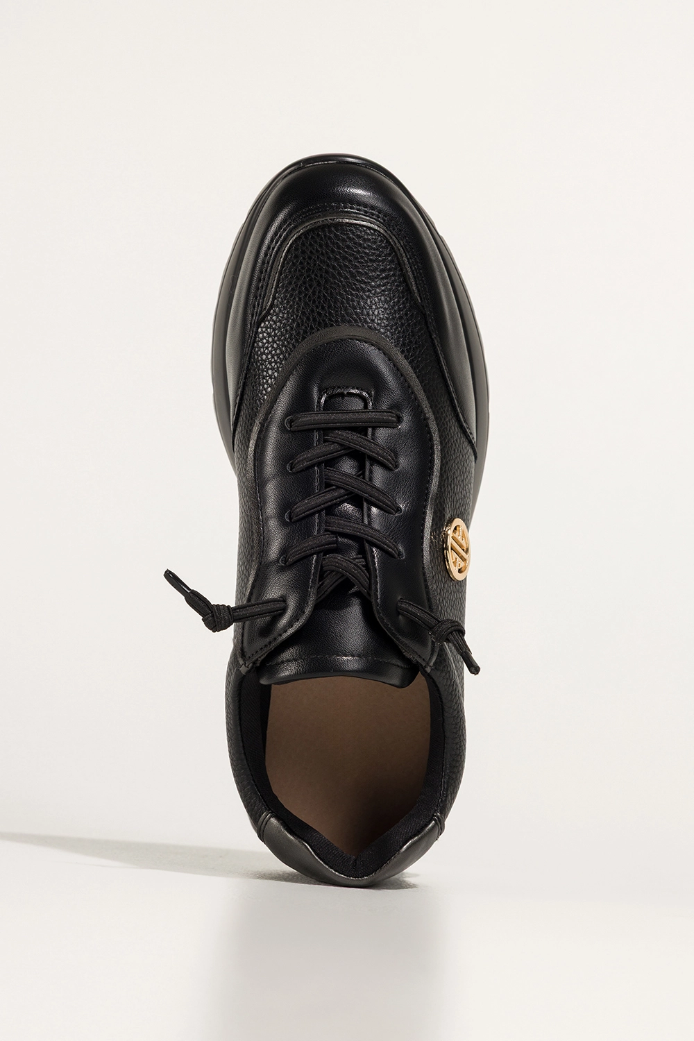 Czarne sneakersy damskie buty sportowe na platformie elastyczne sznurówki złota ozdoba skórzana wkładka Carla model QN0780-8 to połączenie nowoczesnego designu, wygody klasy premium oraz unikalnych detali, które przyciągają wzrok od pierwszego spojrzenia. To idealny wybór dla kobiet, które cenią sobie komfort w miejskim stylu, nie rezygnując przy tym z wyrazistego akcentu modowego. Sneakersy zostały wykonane z wysokogatunkowej skóry ekologicznej, co nie tylko świadczy o trosce o środowisko, ale również gwarantuje trwałość i odporność na codzienne użytkowanie. Zastosowanie miękkiej, skórzanej wkładki poprawia komfort nawet podczas wielogodzinnego chodzenia, sprawiając, że model staje się Twoim niezawodnym towarzyszem każdego dnia. Cechą wyróżniającą ten model jest złota ozdoba na cholewce, która nadaje obuwiu luksusowego charakteru, bez względu na to, czy łączysz je z dresami, dżinsami czy sukienką.
