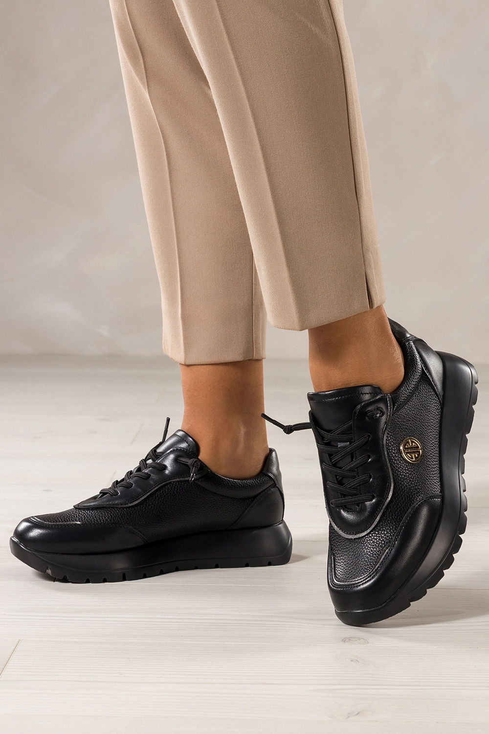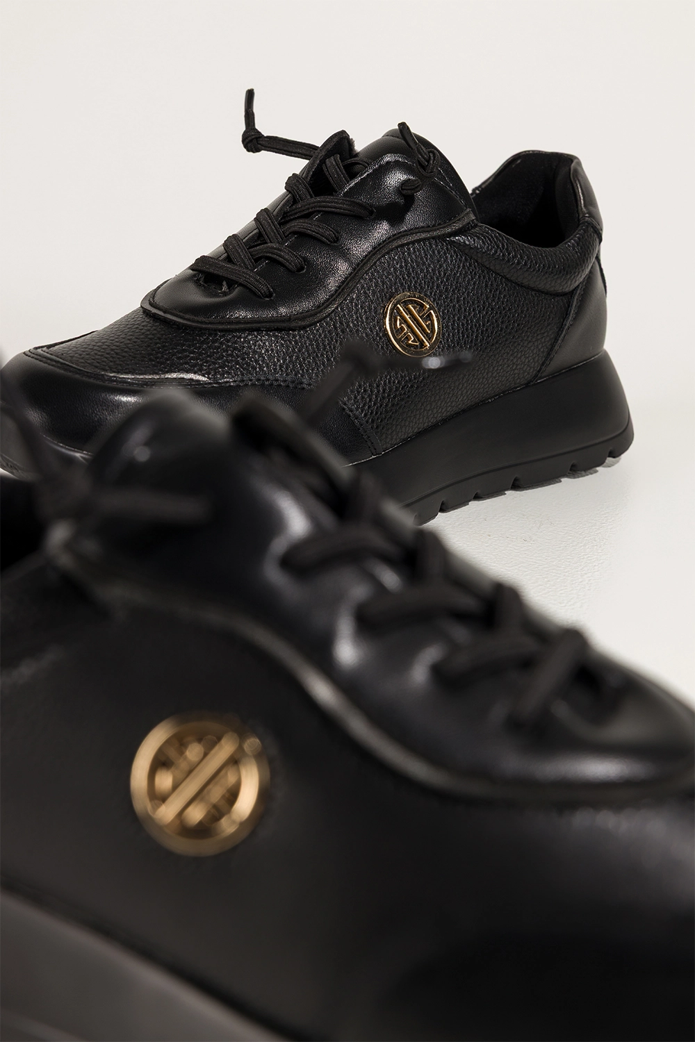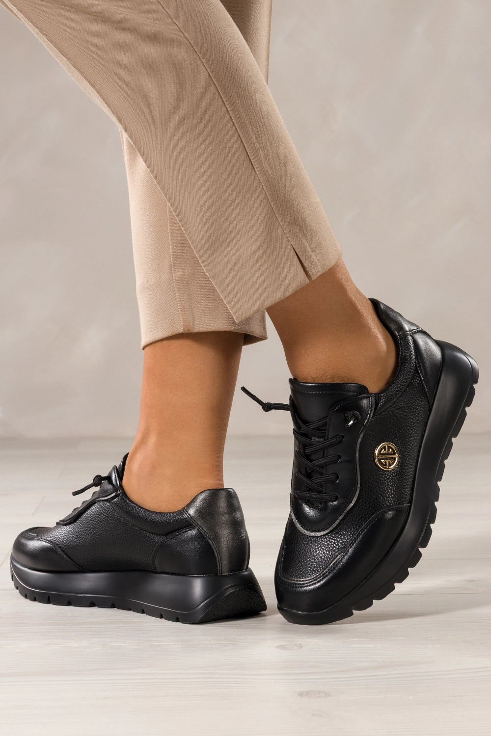 Czarne sneakersy damskie buty sportowe na platformie elastyczne sznurówki złota ozdoba skórzana wkładka Carla QN0780-8