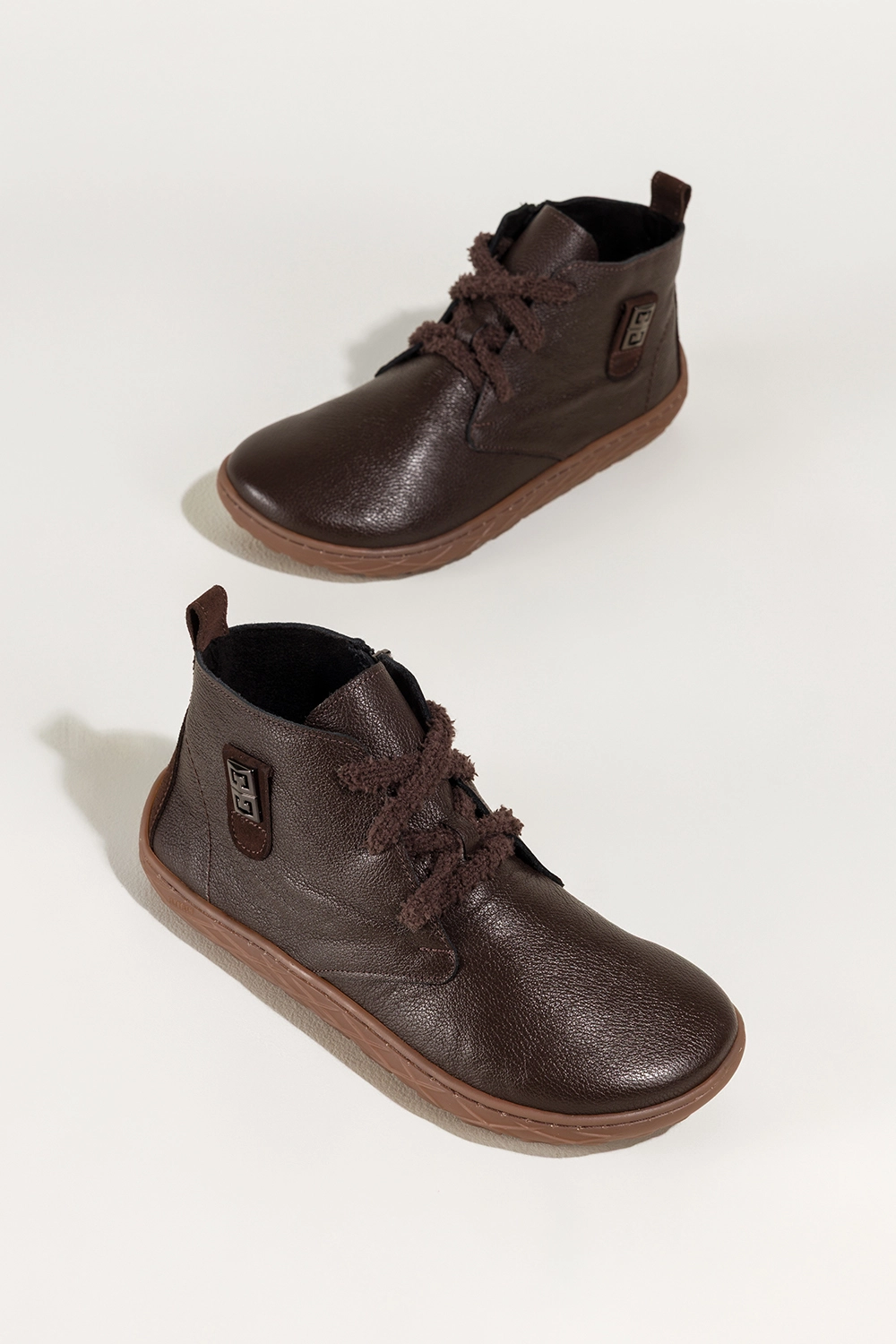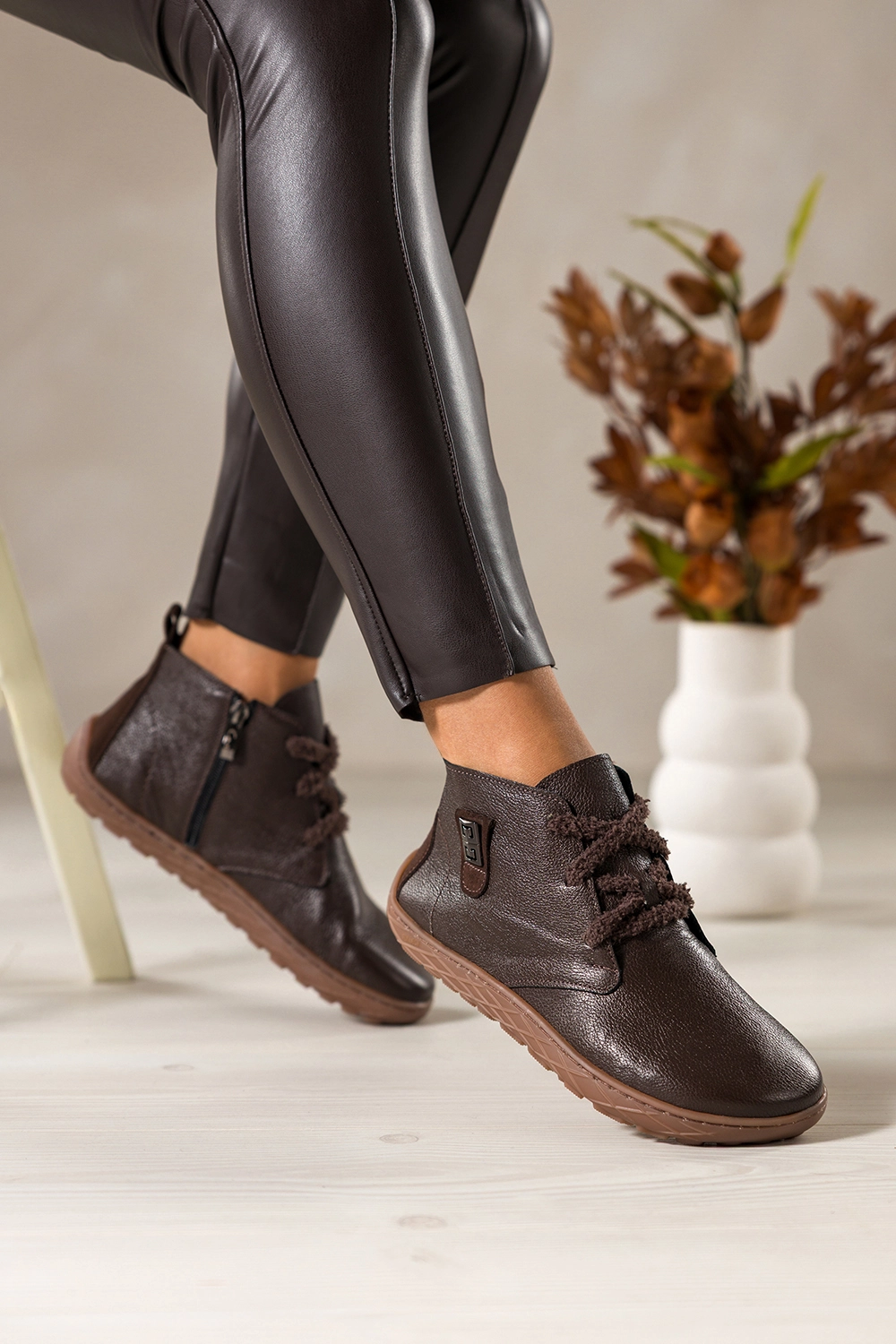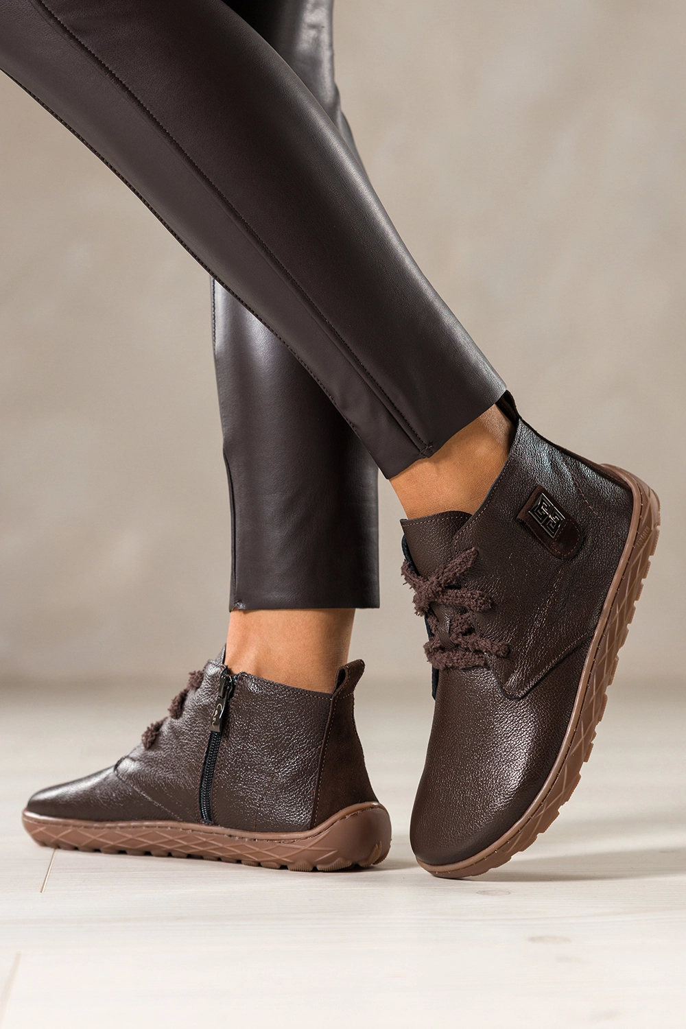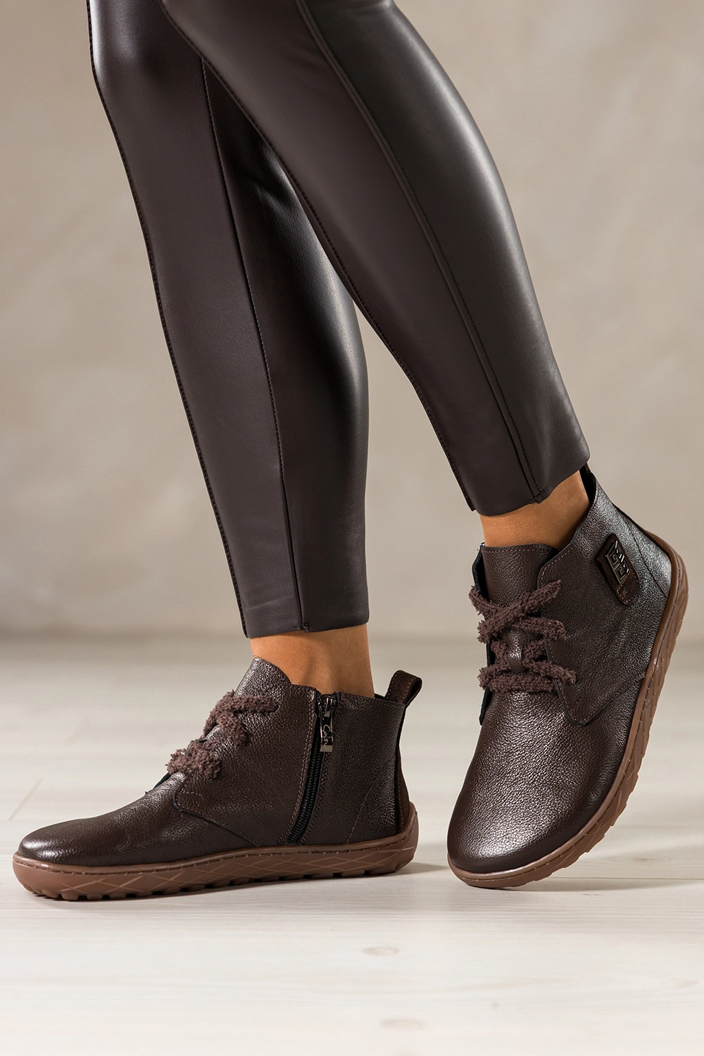 Czekoladowe botki barefoot skórzane damskie szerokie na elastycznej płaskiej podeszwie czarna ozdoba puszyste sznurówki PRODUKT POLSKI Casu model 69928. Wykonane z wysokogatunkowej, miękkiej skóry naturalnej, gwarantują maksymalny komfort noszenia, idealne dopasowanie do szerokiej stopy oraz pełną swobodę ruchu. Elastyczna płaska podeszwa i szeroki, zaokrąglony nosek wspierają naturalny sposób chodzenia, co czyni te botki nie tylko stylowymi, ale i zdrowymi dla stóp.