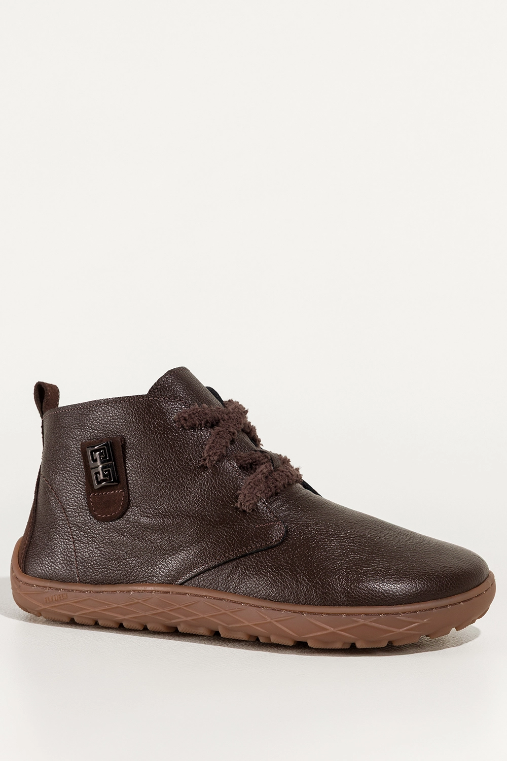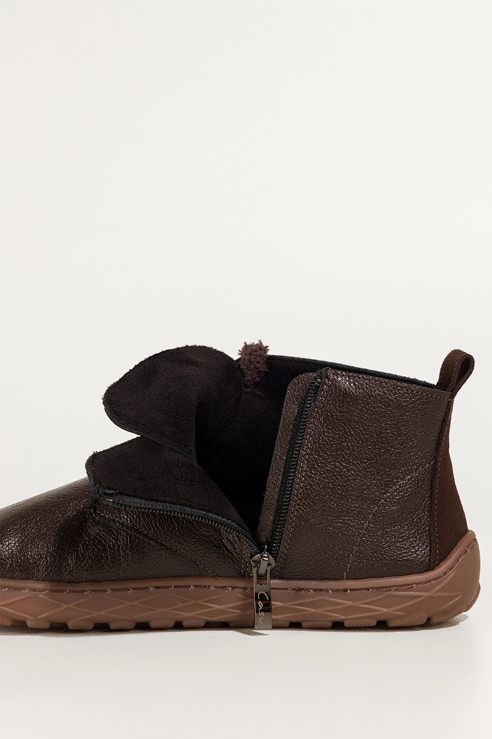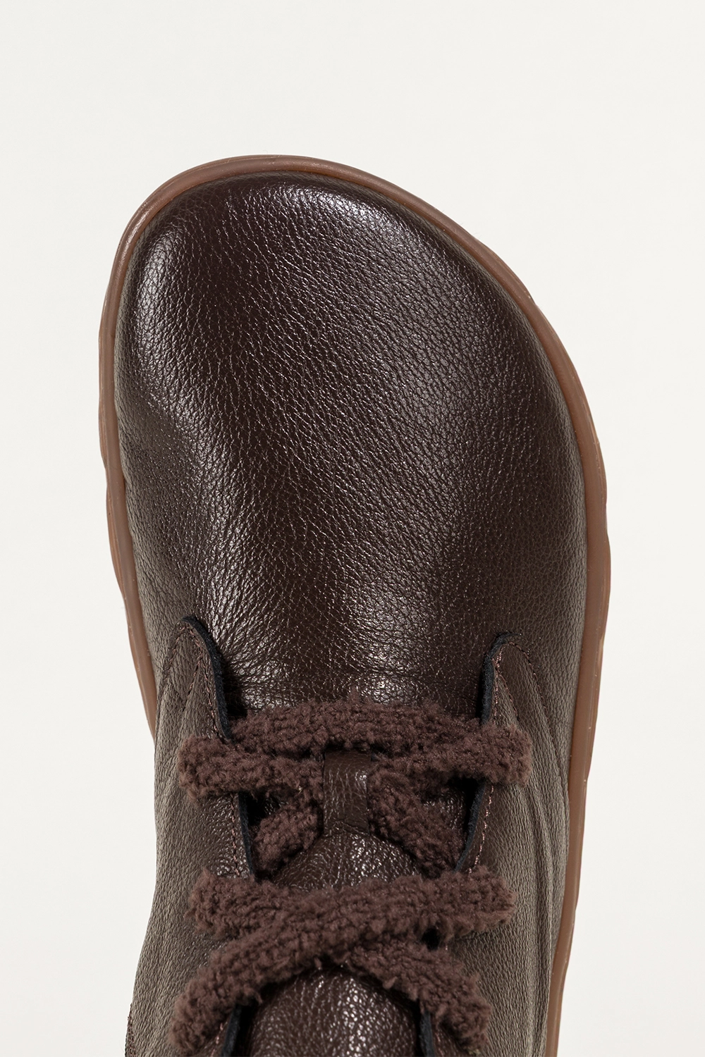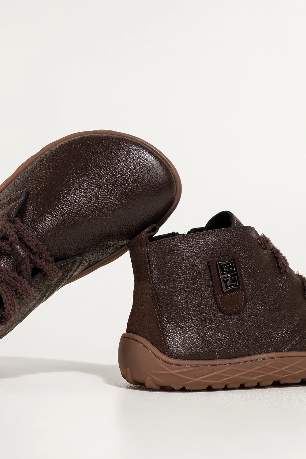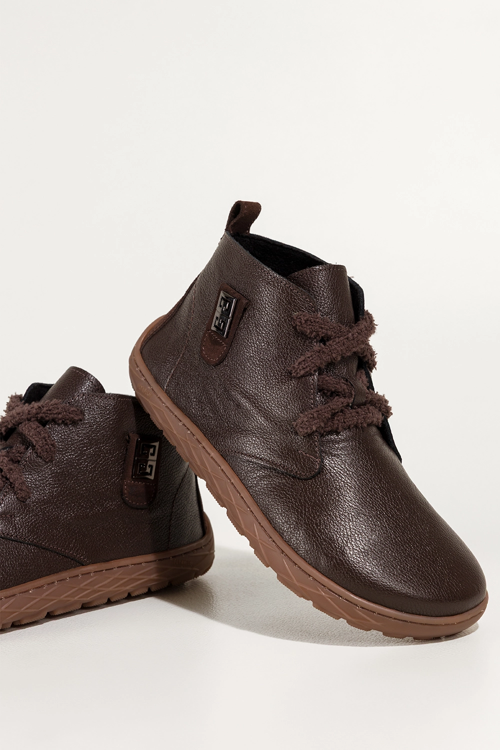 Czekoladowe botki barefoot skórzane damskie szerokie na elastycznej płaskiej podeszwie czarna ozdoba puszyste sznurówki PRODUKT POLSKI Casu model 69928. Wykonane z wysokogatunkowej, miękkiej skóry naturalnej, gwarantują maksymalny komfort noszenia, idealne dopasowanie do szerokiej stopy oraz pełną swobodę ruchu. Elastyczna płaska podeszwa i szeroki, zaokrąglony nosek wspierają naturalny sposób chodzenia, co czyni te botki nie tylko stylowymi, ale i zdrowymi dla stóp.
