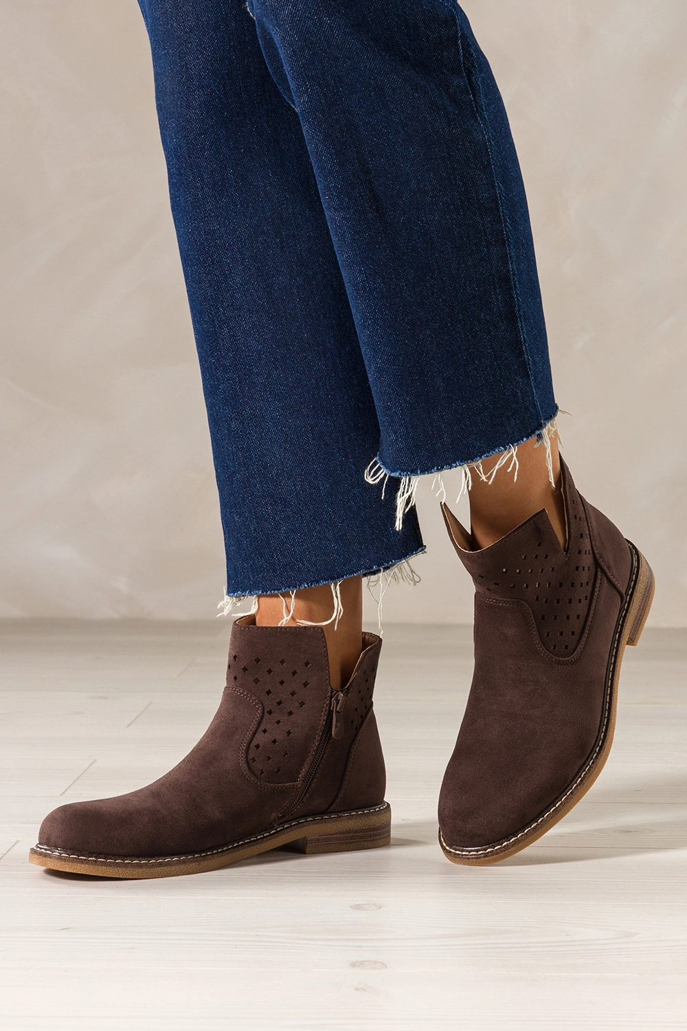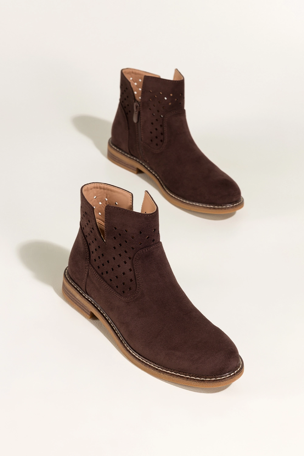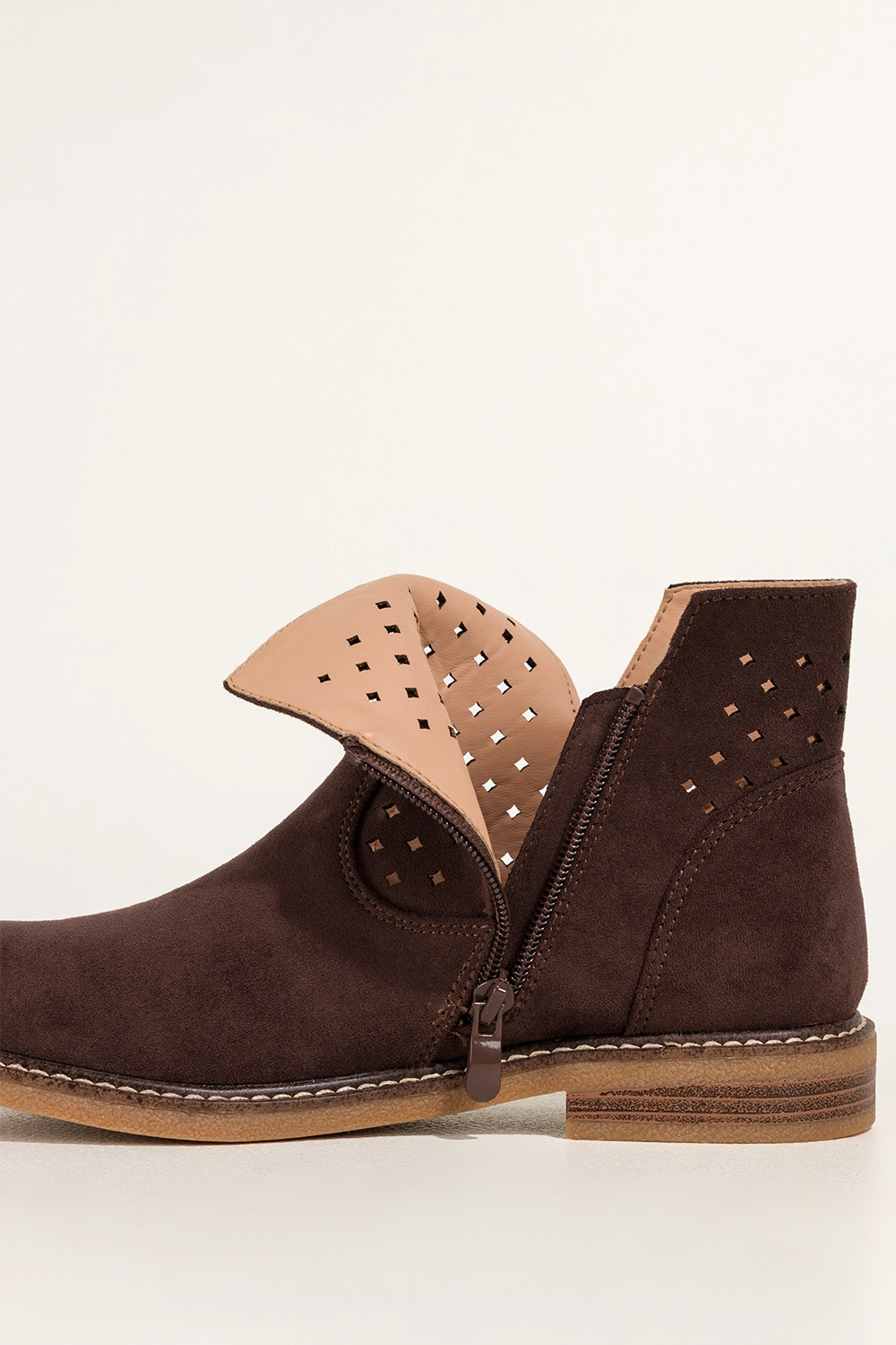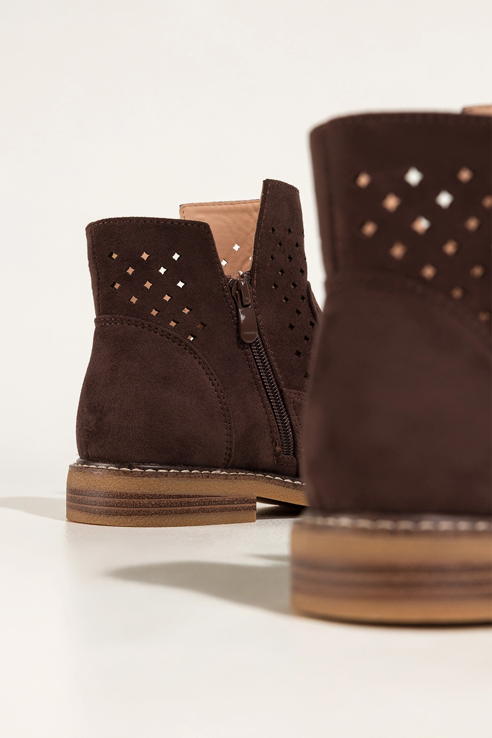 Czekoladowe botki damskie ażurowe na płaskiej podeszwie z przeszyciami wycięta cholewka Carla model Z7094-8. Wykonane z wysokogatunkowej, miękkiej zamszowej skóry ekologicznej, gwarantują trwałość i przyjemność noszenia przez cały dzień. Miękka wkładka ze skóry ekologicznej otula stopę komfortem, eliminując uczucie zmęczenia. Lekka płaska podeszwa z dekoracyjnym przeszyciem nie tylko stabilizuje krok, ale dodaje subtelnego uroku całości. Botki zapinane są na zamek, co zapewnia szybkie zakładanie i idealne dopasowanie.