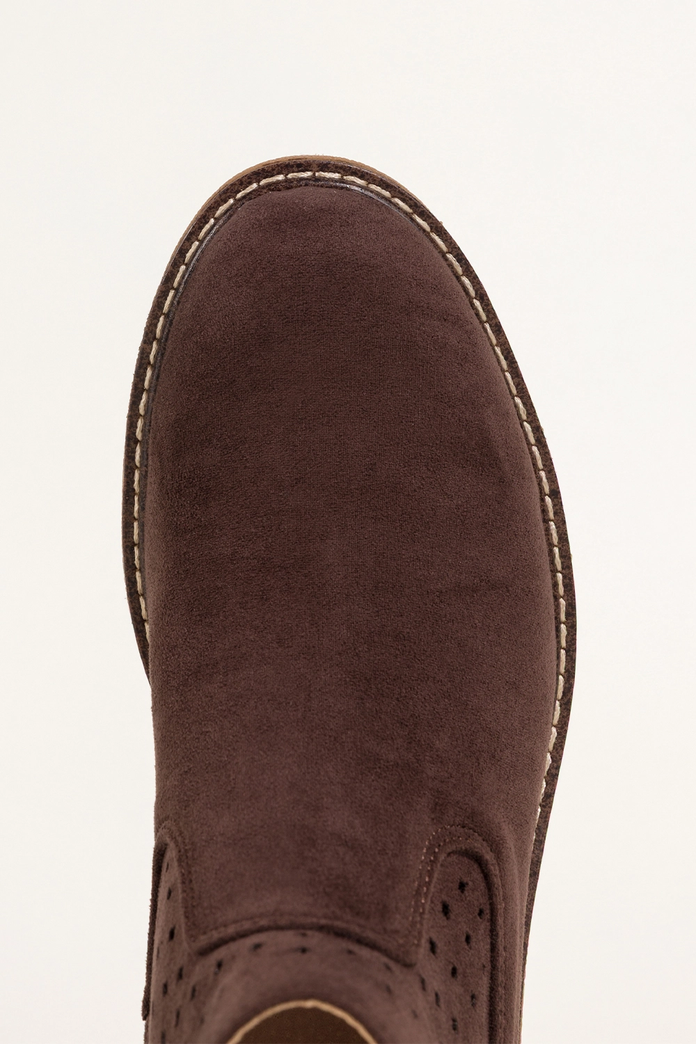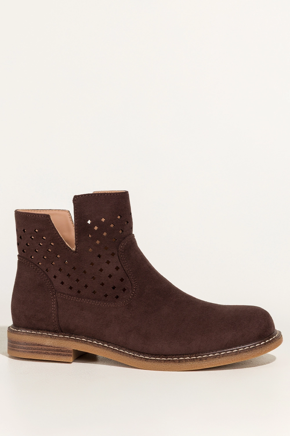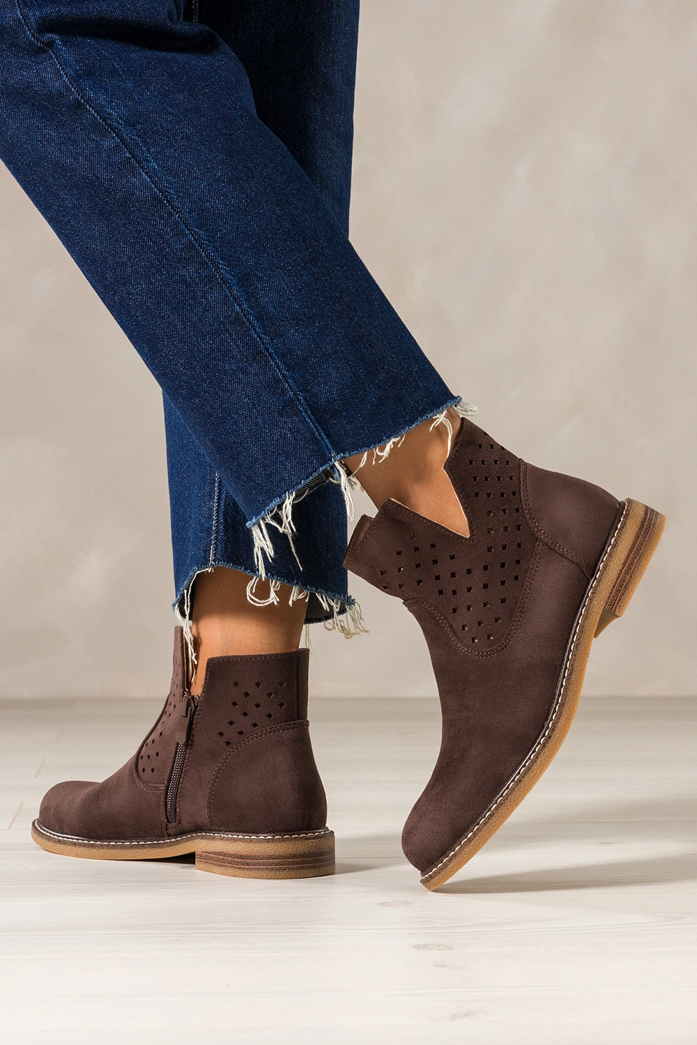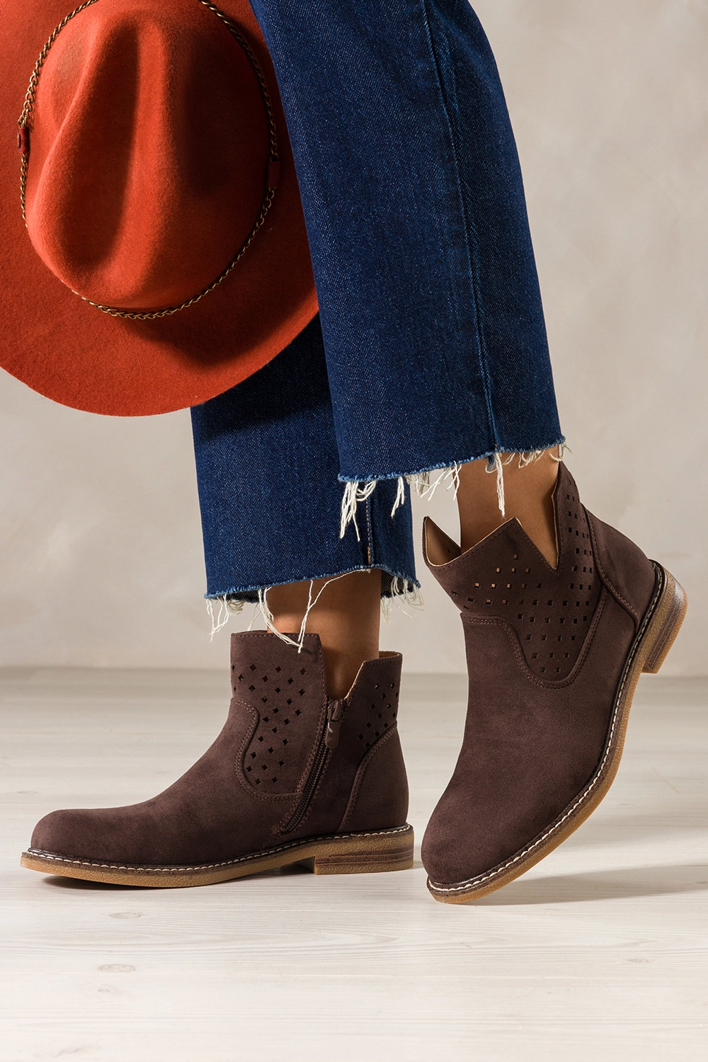 Czekoladowe botki damskie ażurowe na płaskiej podeszwie z przeszyciami wycięta cholewka Carla model Z7094-8. Wykonane z wysokogatunkowej, miękkiej zamszowej skóry ekologicznej, gwarantują trwałość i przyjemność noszenia przez cały dzień. Miękka wkładka ze skóry ekologicznej otula stopę komfortem, eliminując uczucie zmęczenia. Lekka płaska podeszwa z dekoracyjnym przeszyciem nie tylko stabilizuje krok, ale dodaje subtelnego uroku całości. Botki zapinane są na zamek, co zapewnia szybkie zakładanie i idealne dopasowanie.