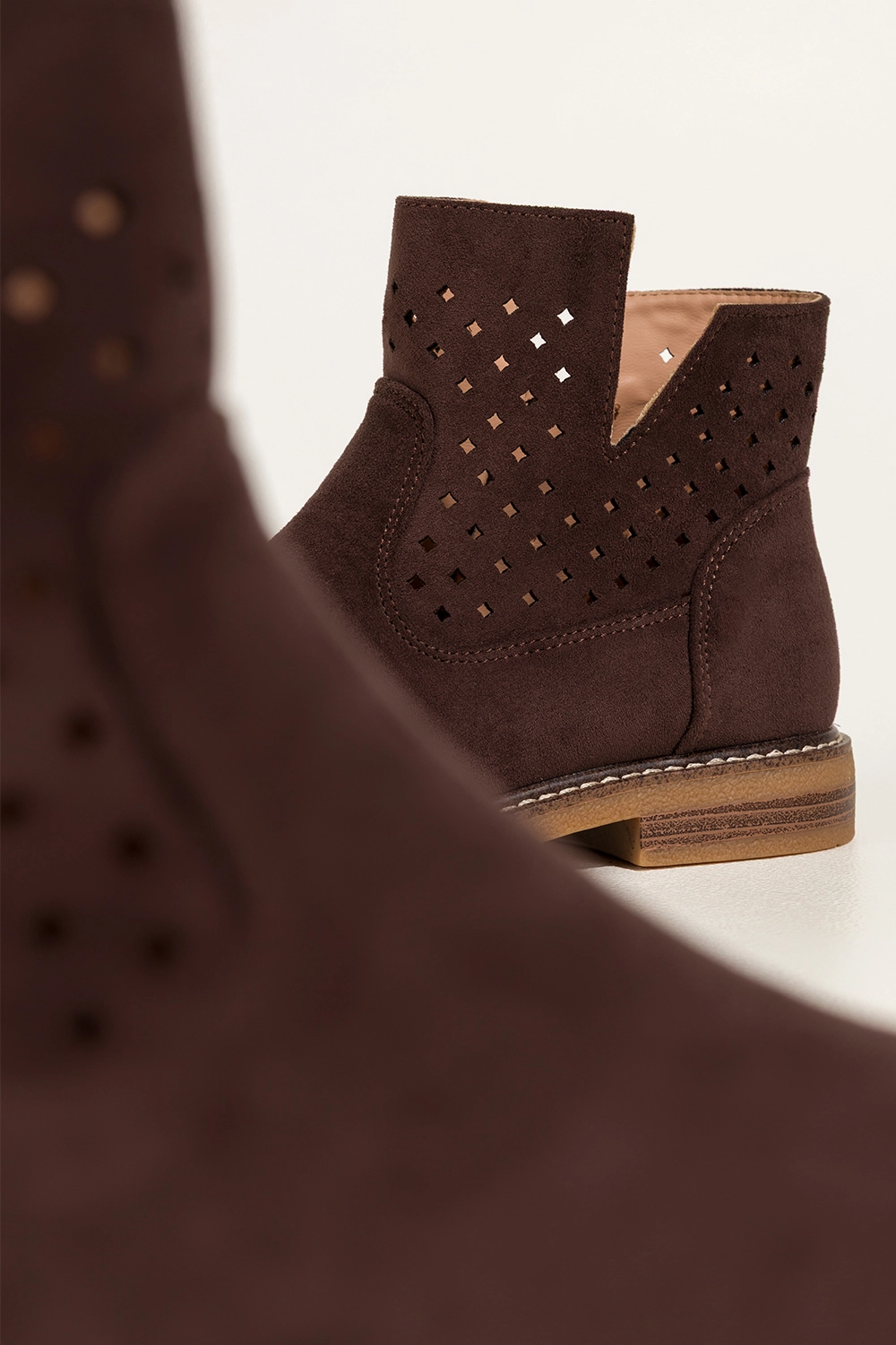 Czekoladowe botki damskie ażurowe na płaskiej podeszwie z przeszyciami wycięta cholewka Carla Z7094-8