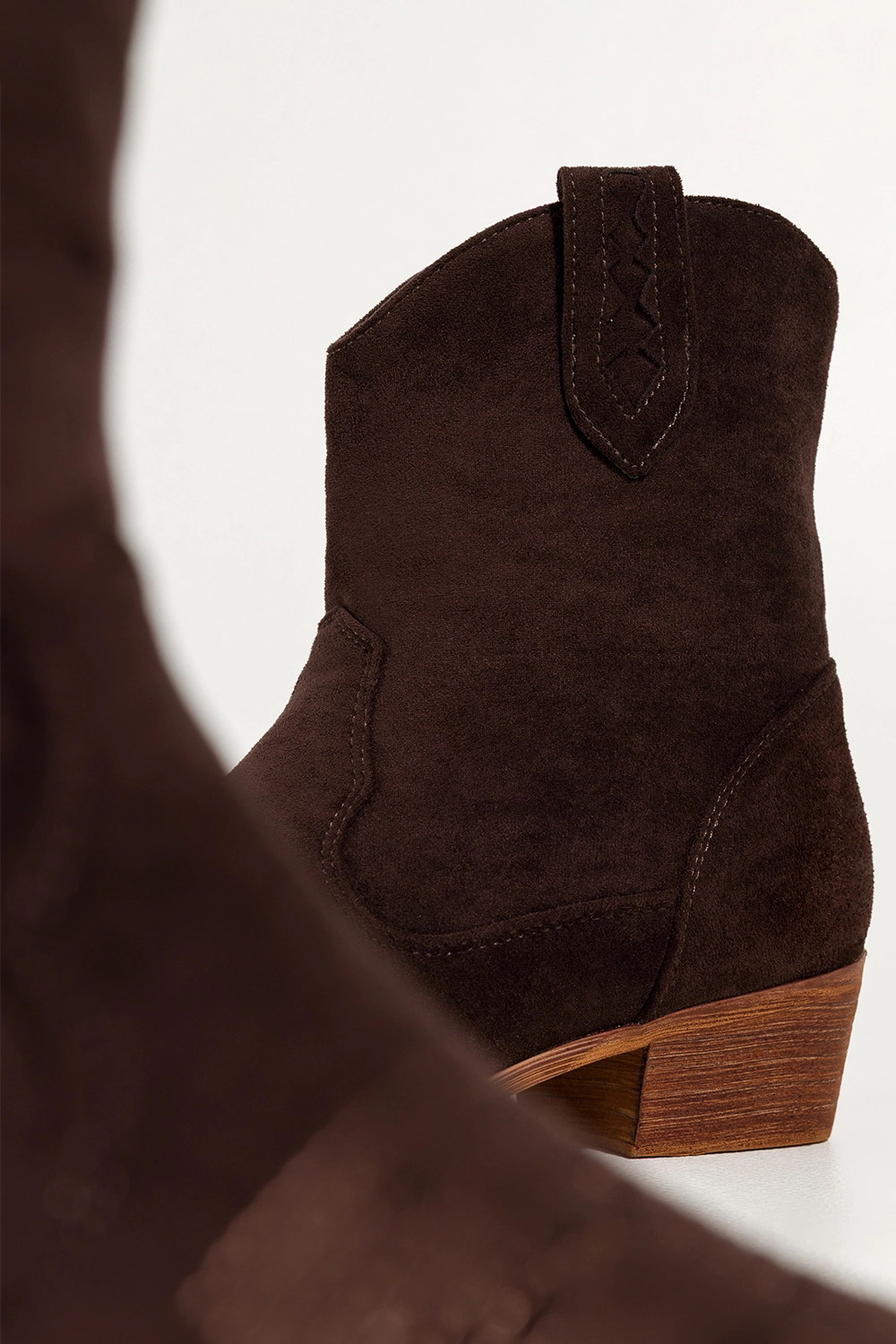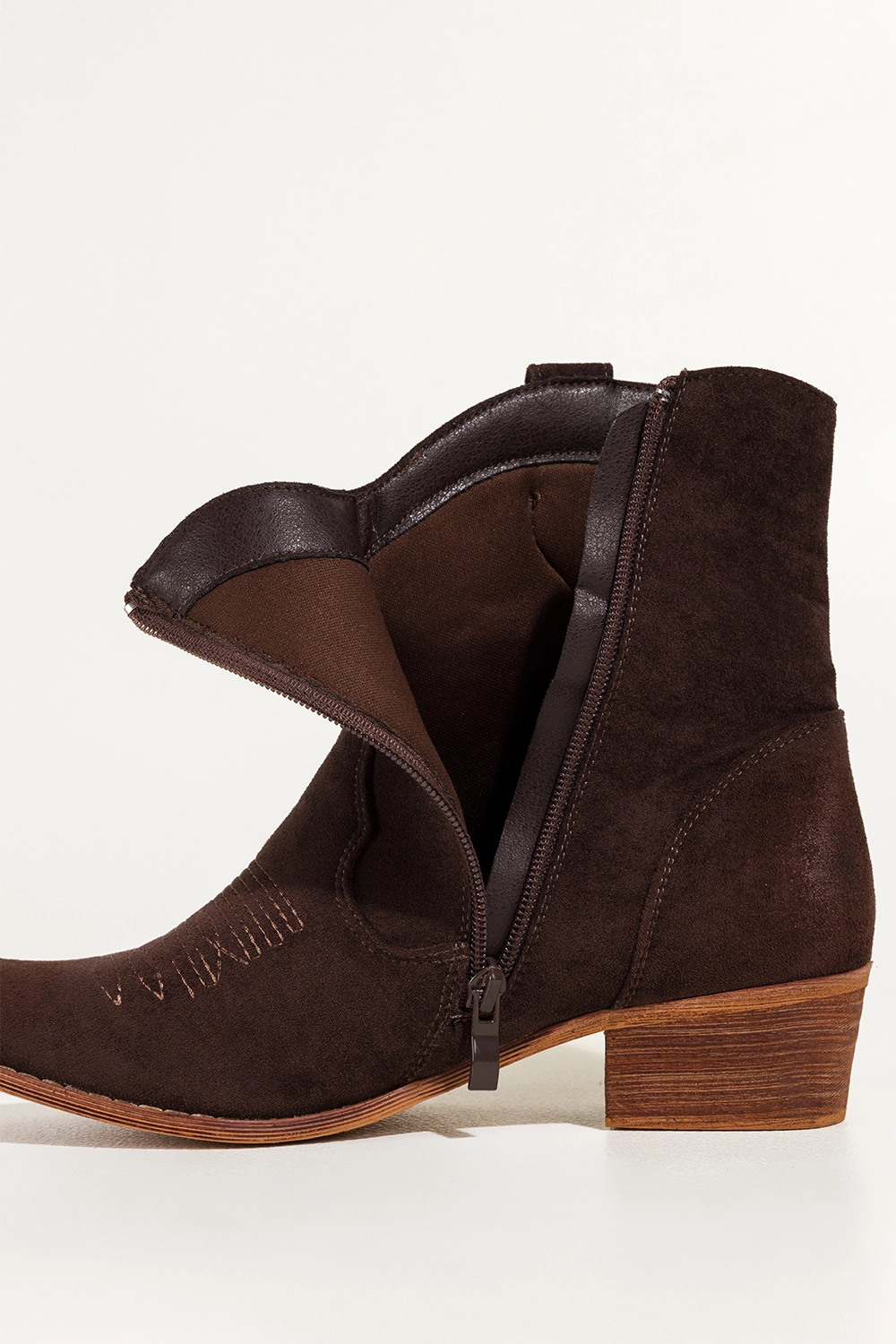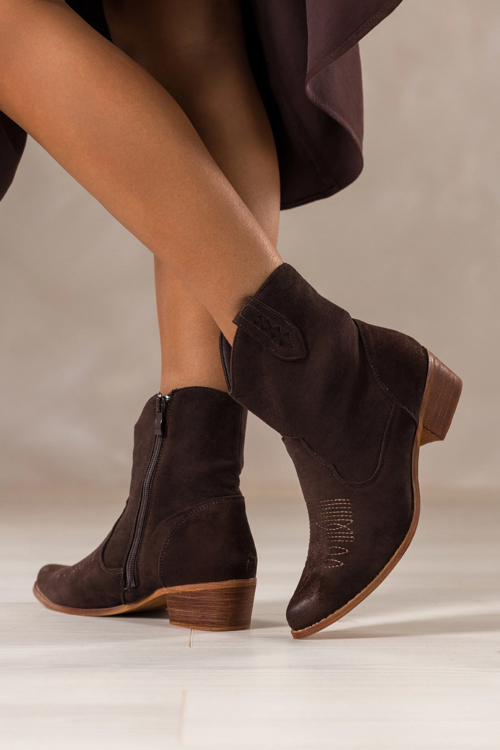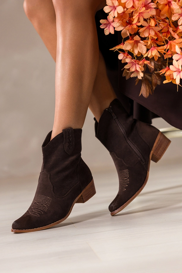 Czekoladowe botki damskie kowbojki na ściętym klocku cholewka z ozdobnymi przeszyciami skórzana wkładka Carla model XBN970-11. Cholewka z miękkiego, przyjemnego w dotyku zamszu ekologicznego z dekoracyjnymi przeszyciami prezentuje się niezwykle stylowo i elegancko. Wnętrze buta zostało wykończone oddychającym materiałem, a naturalna skórzana wkładka zapewnia idealne dopasowanie i wygodę nawet przez cały dzień.