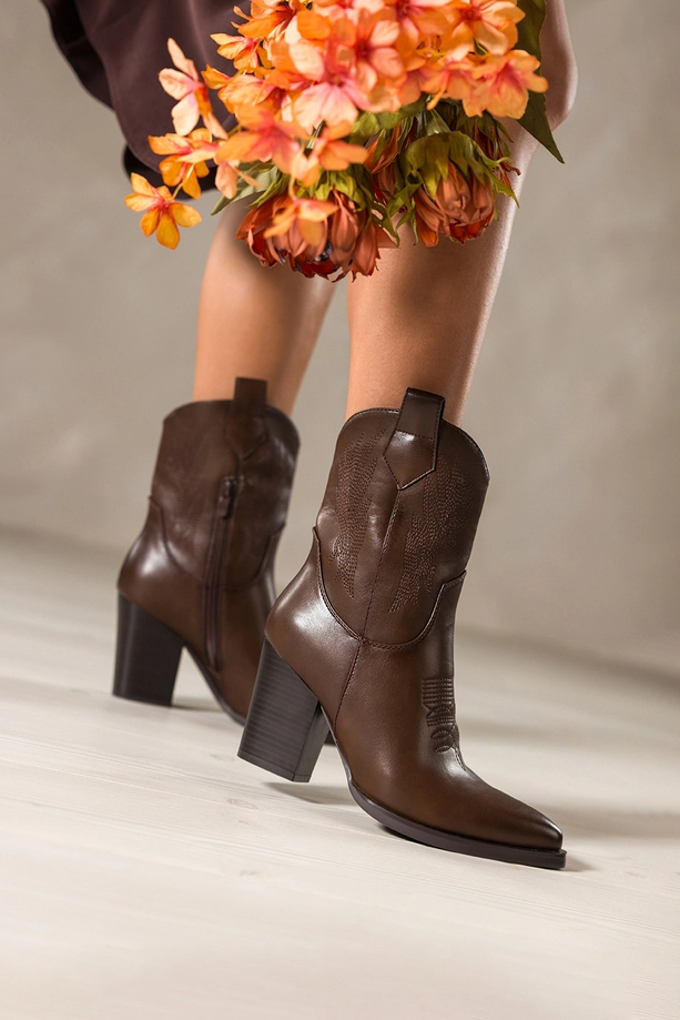 Te oryginalne botki z haftowaną cholewką i modnym wycięciem idealnie wpisują się w trend boho i country chic. Dzięki czekoladowemu odcieniowi i szpiczastemu noskowi zyskują niebanalny wygląd, który łatwo dopasujesz zarówno do zwiewnych sukienek, jak i jeansów z oversizową koszulą. Ścięty obcas typu klocek dodaje sylwetce lekkości, jednocześnie gwarantując stabilność i wygodę na każdym kroku.