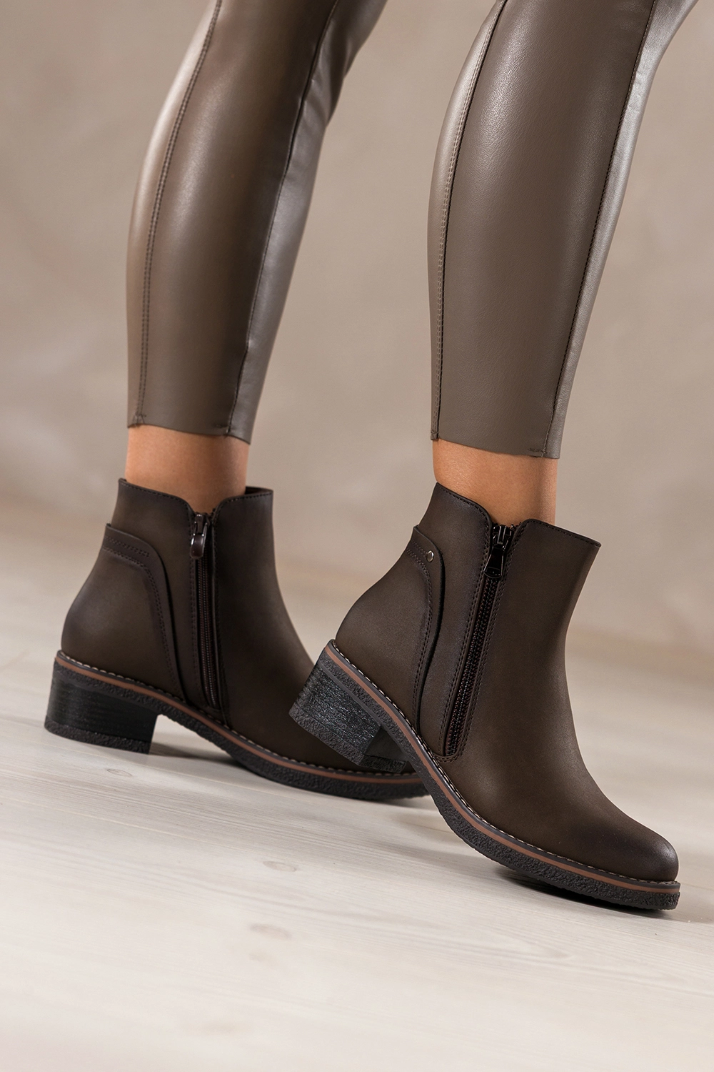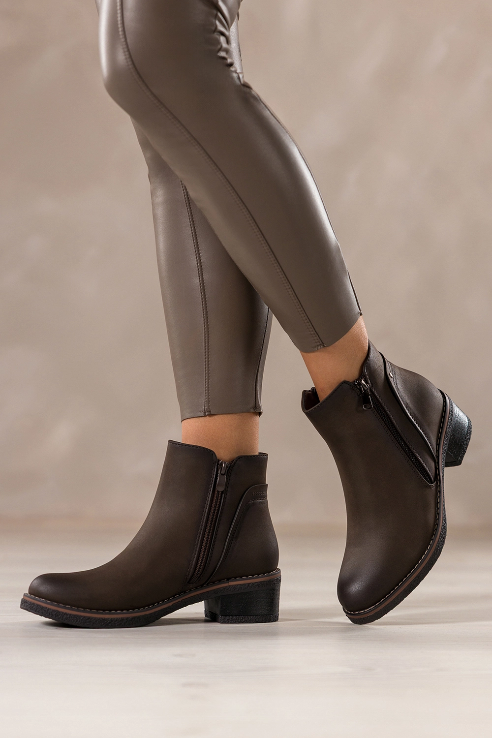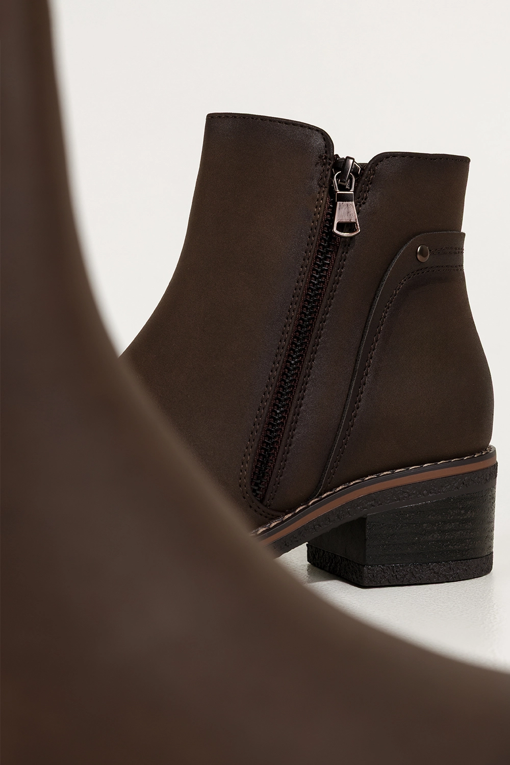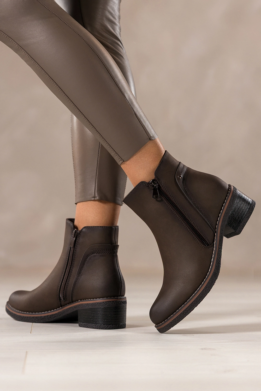 Zachwycają głębokim czekoladowym kolorem, który doskonale wpisuje się w jesienno-zimowe stylizacje. Ich uniwersalny fason z zaokrąglonym noskiem oraz niskim, stabilnym obcasem typu klocek dodaje sylwetce lekkości i zapewnia wygodę podczas chodzenia. Ozdobny zamek na cholewce nie tylko przyciąga wzrok, ale również nadaje całości modnego, nowoczesnego charakteru. Botki doskonale komponują się zarówno z eleganckim płaszczem, jak i codziennym lookiem z jeansami czy swetrem. To idealny wybór do pracy, na zakupy czy spotkanie z przyjaciółmi.