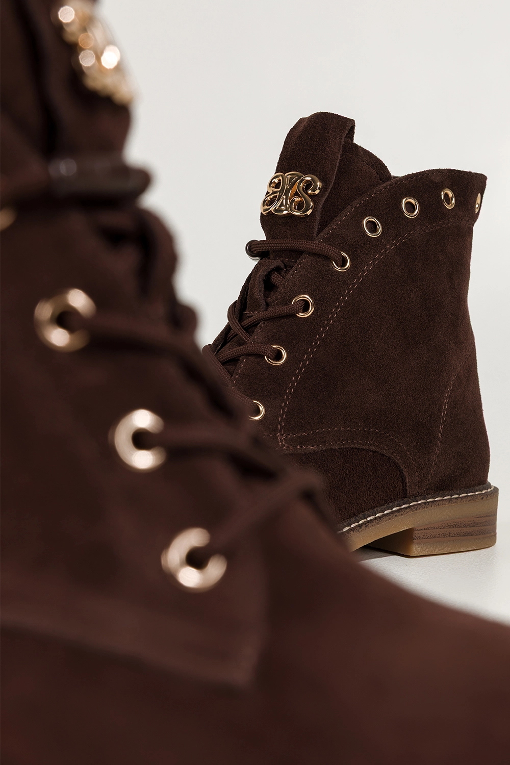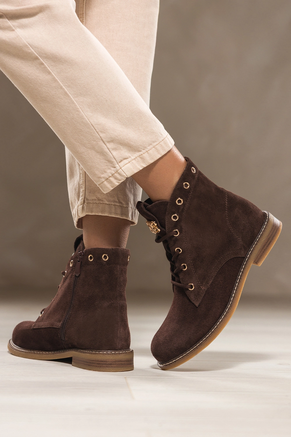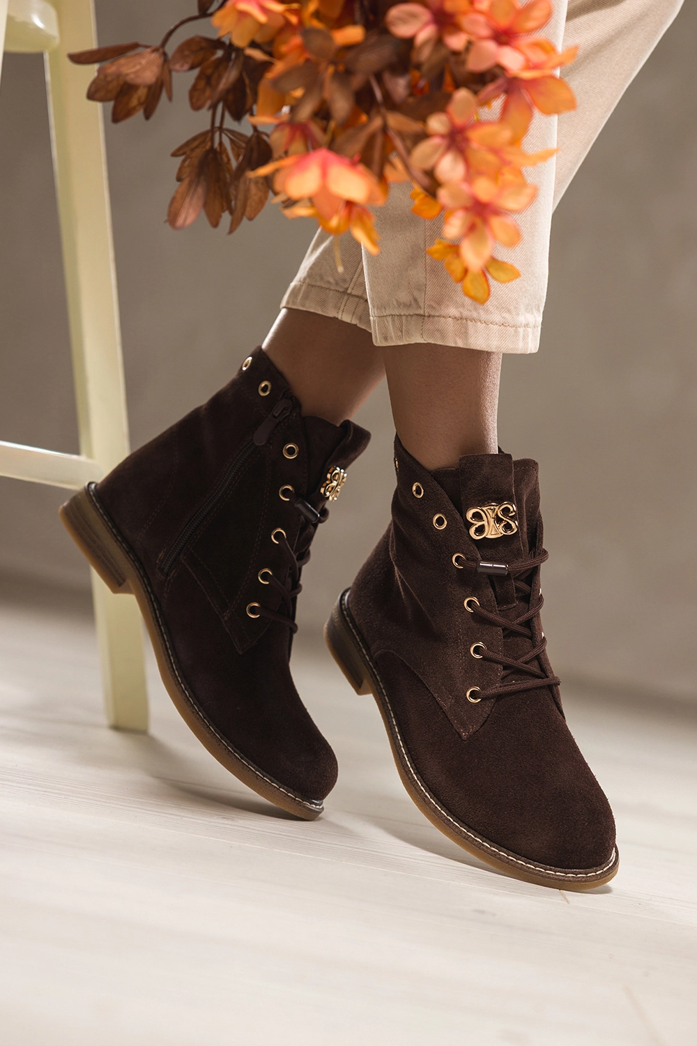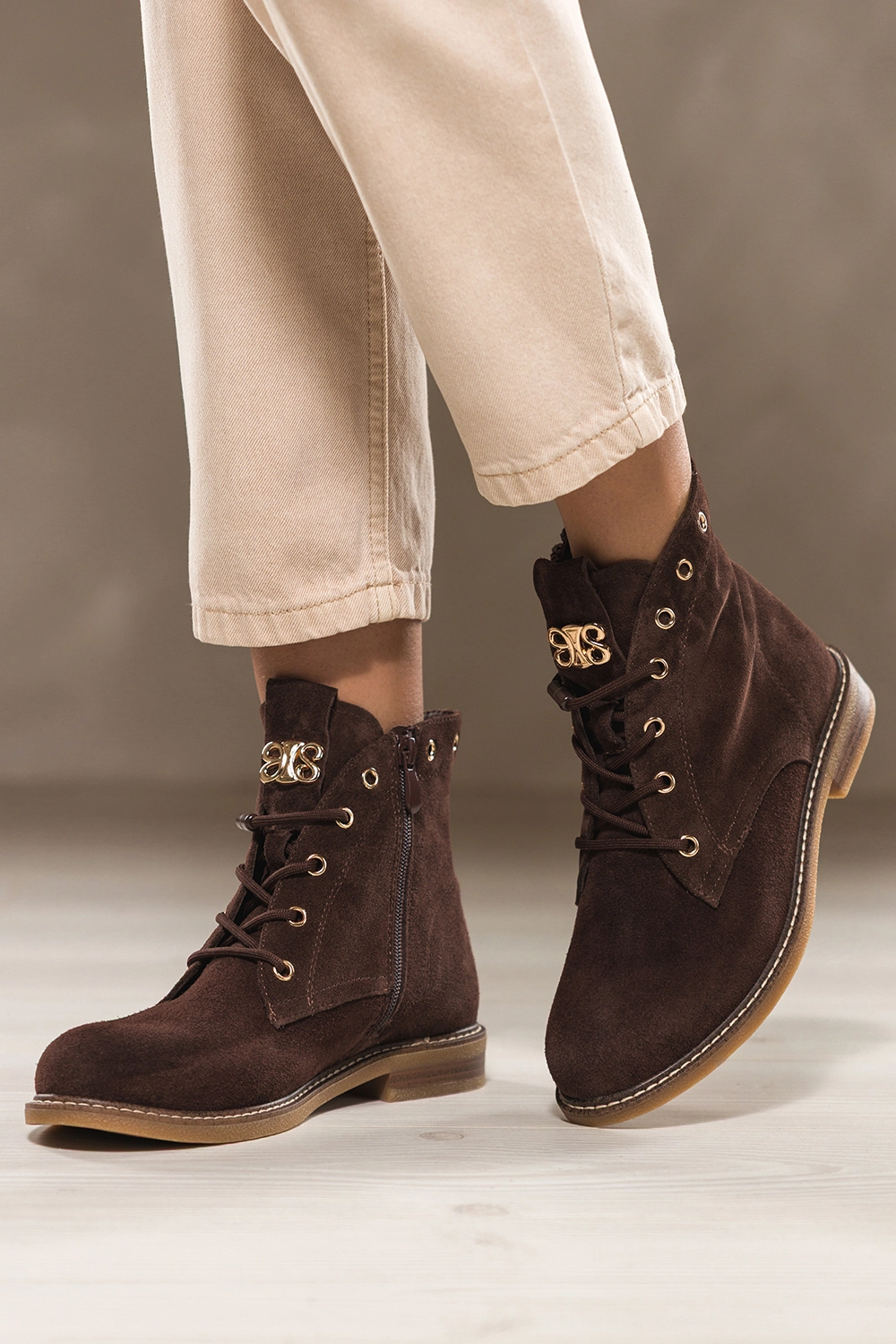 Czekoladowe botki damskie skórzane płaska podeszwa z przeszyciami złota ozdoba na języku nity sznurowane Carla model B194-7. Wykonane z miękkiej, wysokogatunkowej skóry zamszowej, zachwycają precyzyjnym wykończeniem i trwałością. Wnętrze wyłożone delikatnym materiałem oraz miękka skórzana wkładka zapewniają wygodę noszenia przez cały dzień. Stylowy, zaokrąglony nosek oraz złote detale w postaci ozdoby na języku i nitów nadają butom wyrafinowanego charakteru. Płaska podeszwa z przeszyciami i niski obcas typu klocek gwarantują stabilność i subtelną elegancję.
