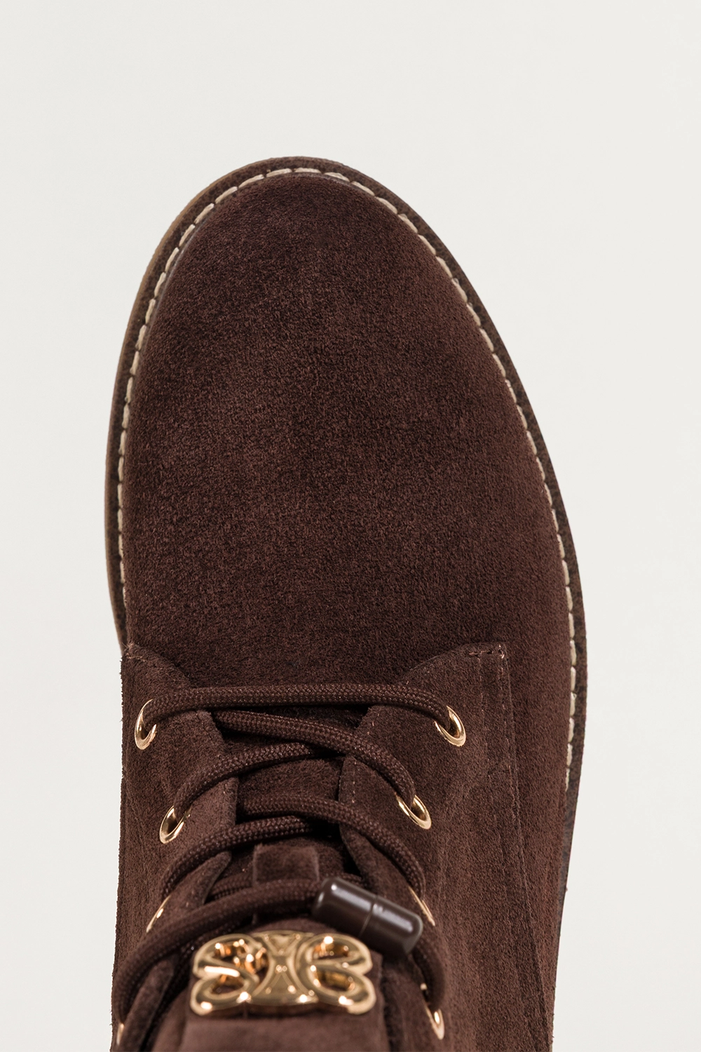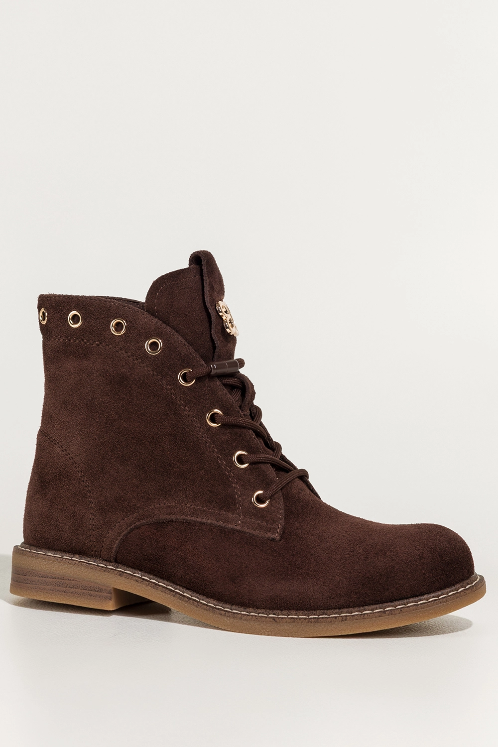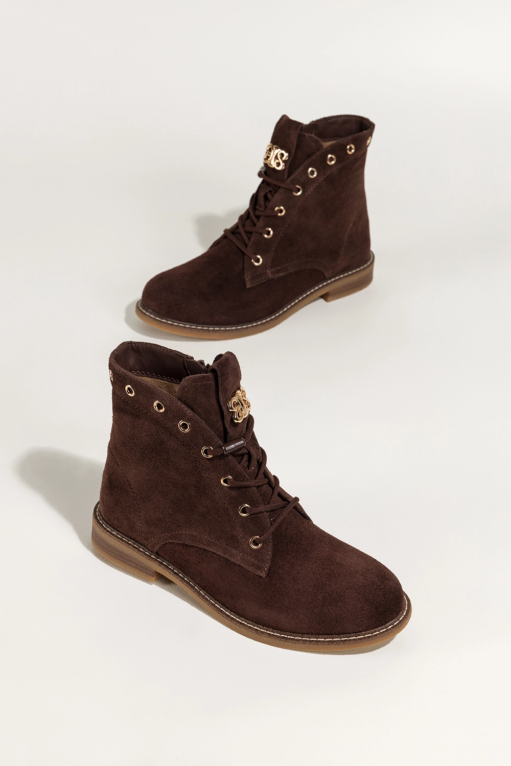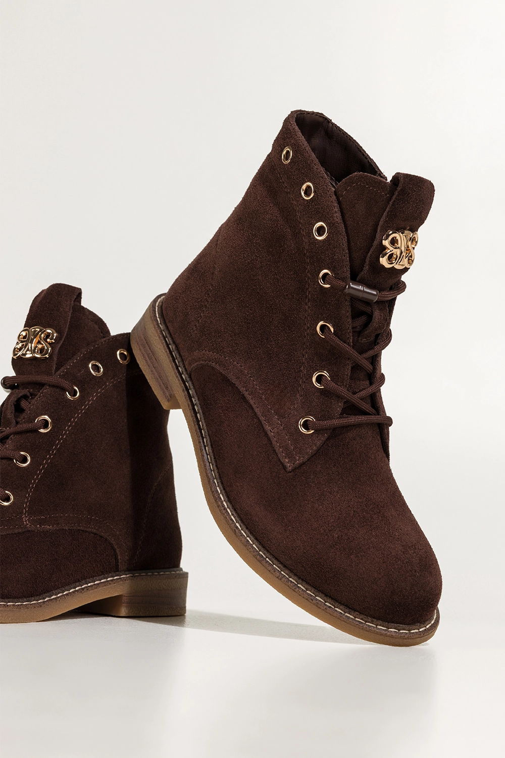 Czekoladowe botki damskie skórzane płaska podeszwa z przeszyciami złota ozdoba na języku nity sznurowane Carla model B194-7. Wykonane z miękkiej, wysokogatunkowej skóry zamszowej, zachwycają precyzyjnym wykończeniem i trwałością. Wnętrze wyłożone delikatnym materiałem oraz miękka skórzana wkładka zapewniają wygodę noszenia przez cały dzień. Stylowy, zaokrąglony nosek oraz złote detale w postaci ozdoby na języku i nitów nadają butom wyrafinowanego charakteru. Płaska podeszwa z przeszyciami i niski obcas typu klocek gwarantują stabilność i subtelną elegancję.