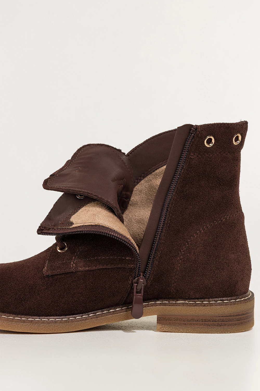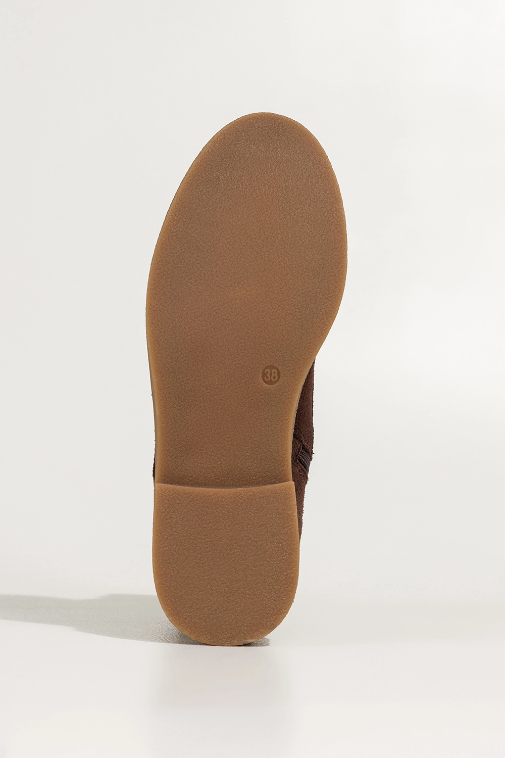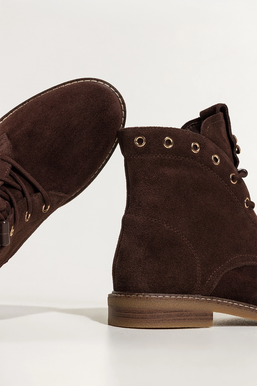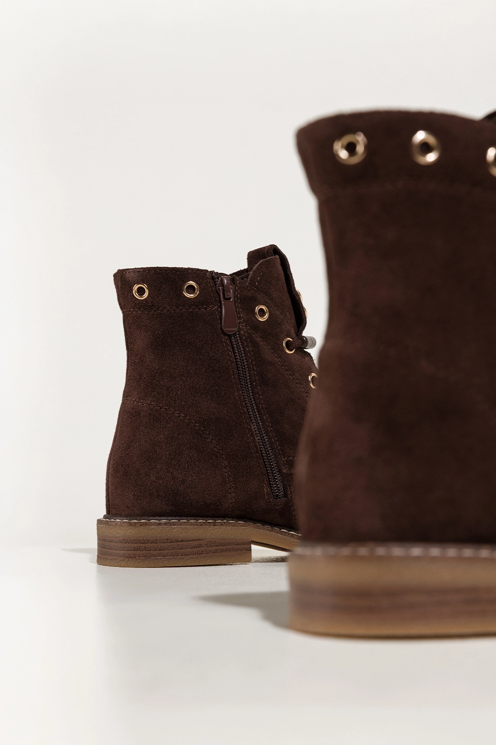 Czekoladowe botki damskie skórzane płaska podeszwa z przeszyciami złota ozdoba na języku nity sznurowane Carla model B194-7. Wykonane z miękkiej, wysokogatunkowej skóry zamszowej, zachwycają precyzyjnym wykończeniem i trwałością. Wnętrze wyłożone delikatnym materiałem oraz miękka skórzana wkładka zapewniają wygodę noszenia przez cały dzień. Stylowy, zaokrąglony nosek oraz złote detale w postaci ozdoby na języku i nitów nadają butom wyrafinowanego charakteru. Płaska podeszwa z przeszyciami i niski obcas typu klocek gwarantują stabilność i subtelną elegancję.