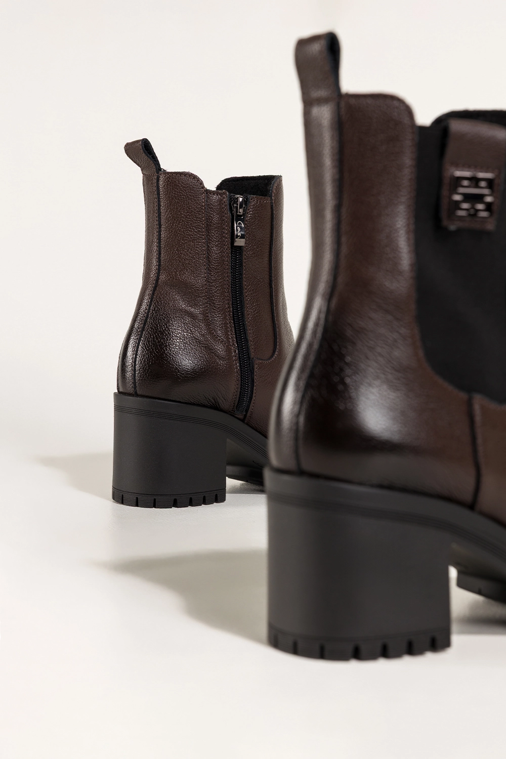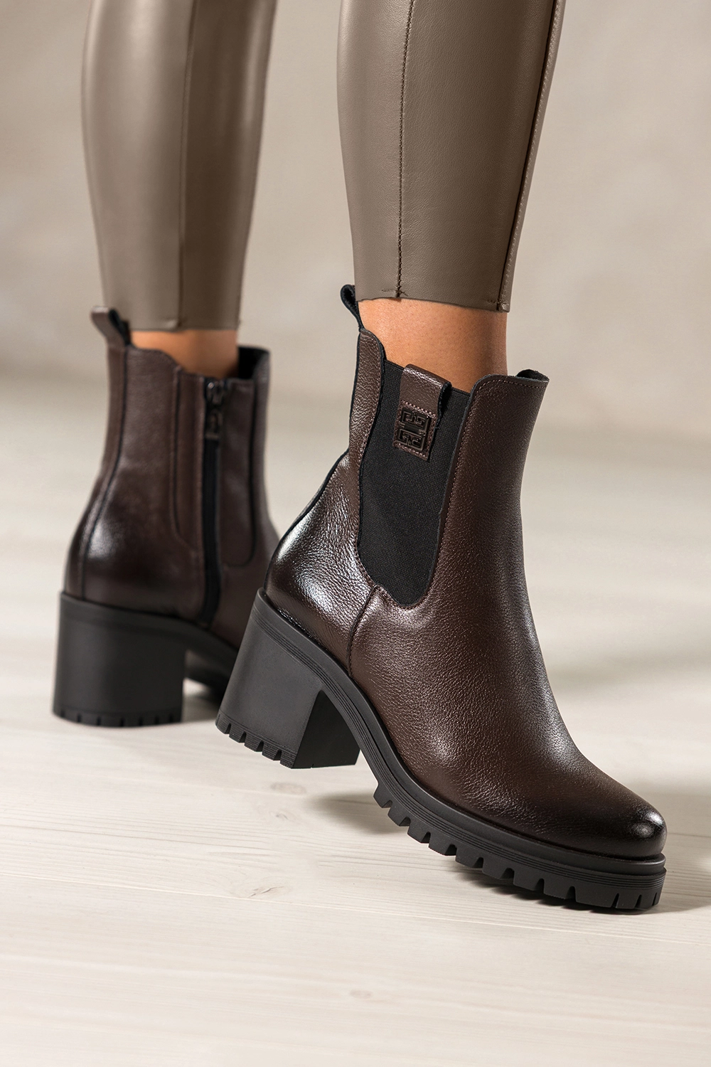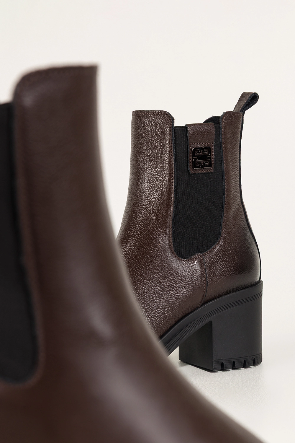 Dzięki czarnej gumie w cholewce botki idealnie dopasowują się do nogi, a stalowa ozdoba dodaje im wyrazistego charakteru. Ten model doskonale uzupełni zarówno codzienne, jak i bardziej eleganckie stylizacje, od klasycznych jeansów po sukienki midi. Ich głęboki, czekoladowy odcień jest niezwykle uniwersalny i łatwy do zestawienia z innymi kolorami garderoby, dzięki czemu stanowią niezastąpiony element jesienno-zimowej kolekcji.