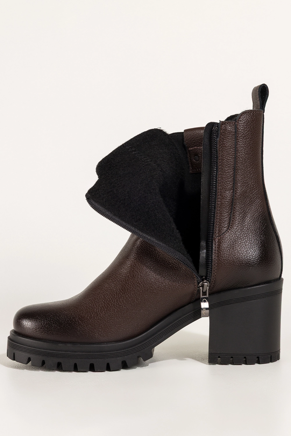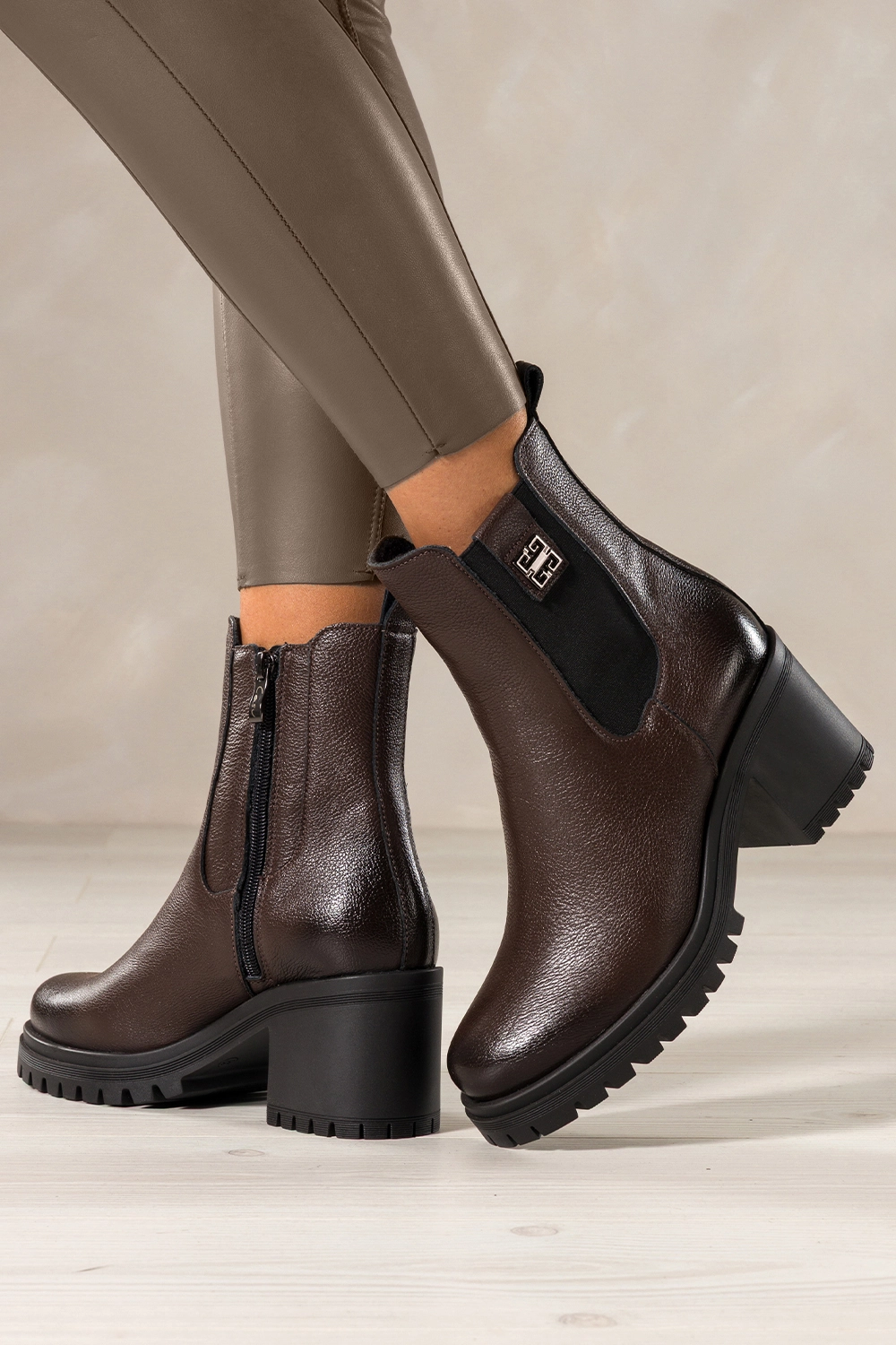 Czekoladowe botki skórzane damskie bieżnikowany obcas i platforma guma w cholewce stalowa ozdoba PRODUKT POLSKI Casu model 39505, to wyjątkowe połączenie elegancji i funkcjonalności. Wykonane z wysokogatunkowej skóry naturalnej, gwarantują nie tylko trwałość, ale też komfort noszenia przez cały dzień. Miękka wkładka z materiału oraz ocieplenie kocem obuwniczym sprawiają, że botki idealnie sprawdzają się nawet w chłodniejsze dni, zapewniając przy tym przyjemne ciepło i wygodę. Zaokrąglony nosek i szeroki obcas z bieżnikiem oferują stabilność oraz modny, a zarazem praktyczny wygląd.