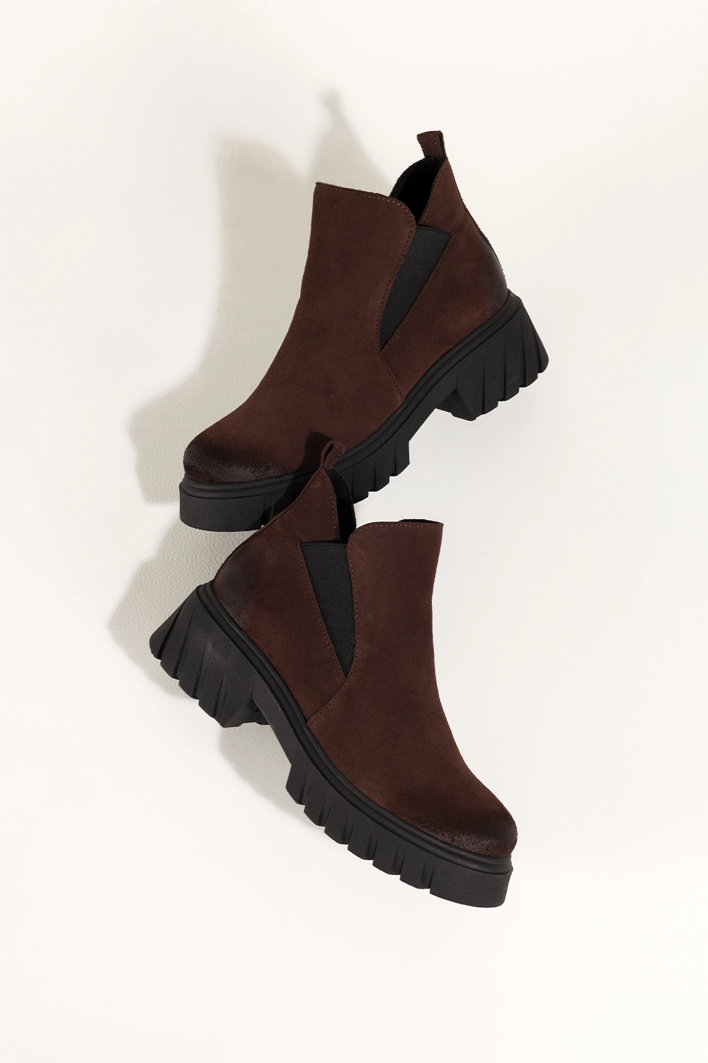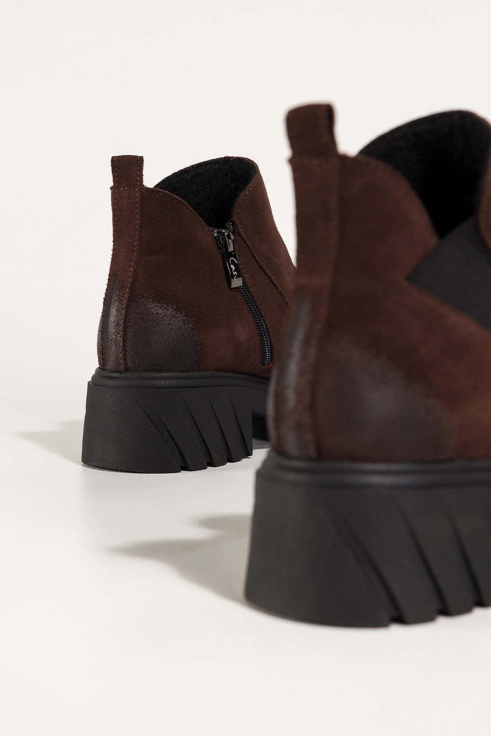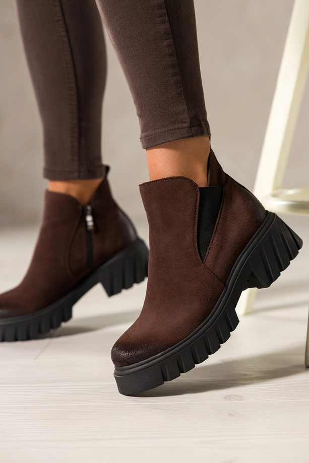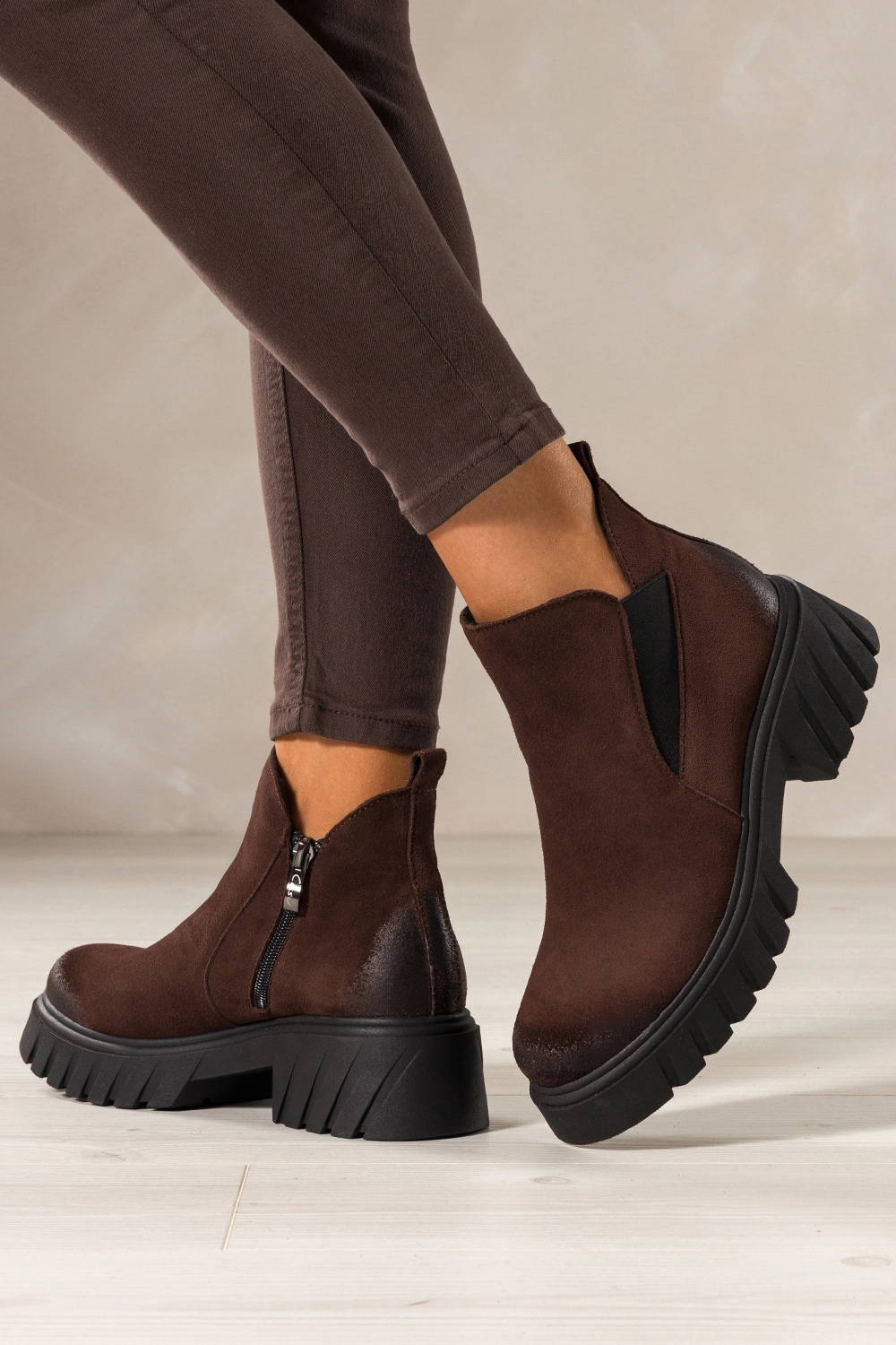 Czekoladowe botki skórzane damskie na bieżnikowanej platformie guma w cholewce PRODUKT POLSKI Casu 39512, to idealne połączenie elegancji, wygody i solidnego wykonania. Uszyte z wysokogatunkowej skóry zamszowej, zachwycają miękką fakturą i wytrzymałością na codzienne użytkowanie. Wnętrze ocieplone przyjemnym w dotyku kocem obuwniczym gwarantuje ciepło nawet w najchłodniejsze dni, a miękka wkładka z materiału zapewnia wygodę przez cały dzień. Solidna bieżnikowana platforma zwiększa stabilność, amortyzuje wstrząsy i dodaje charakteru każdej stylizacji.