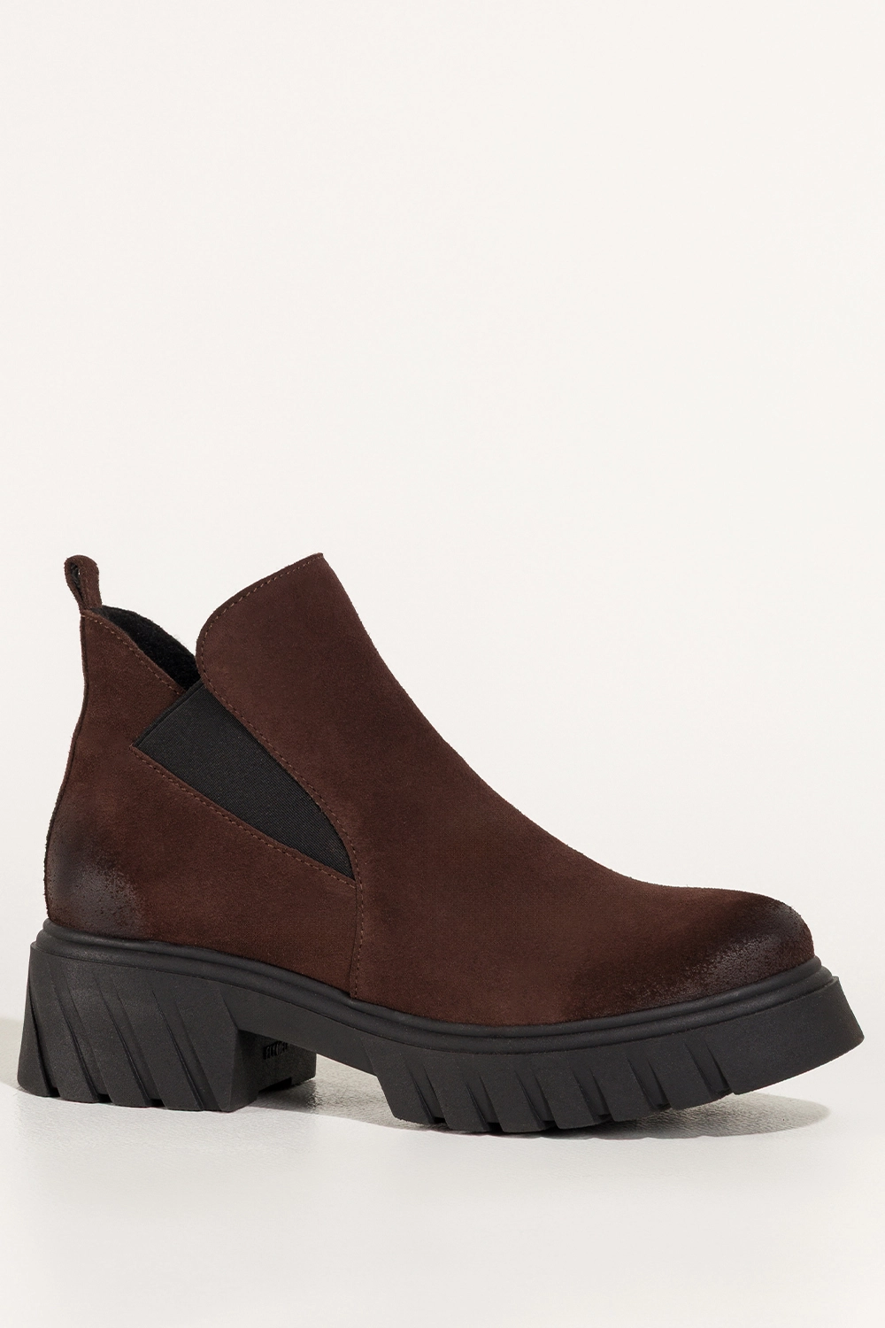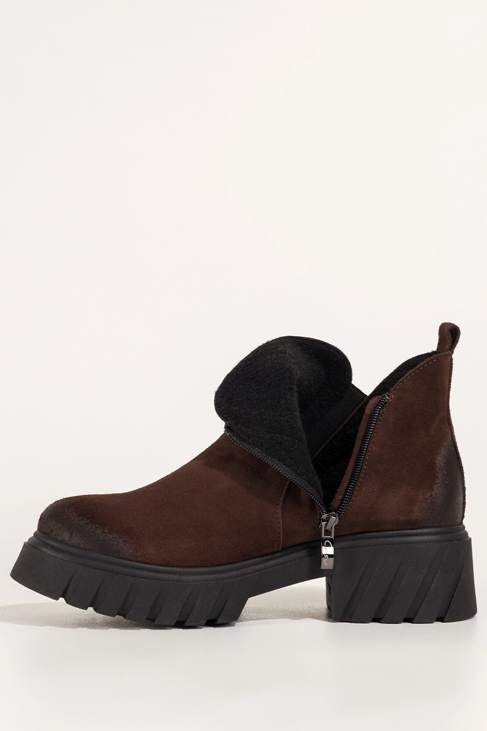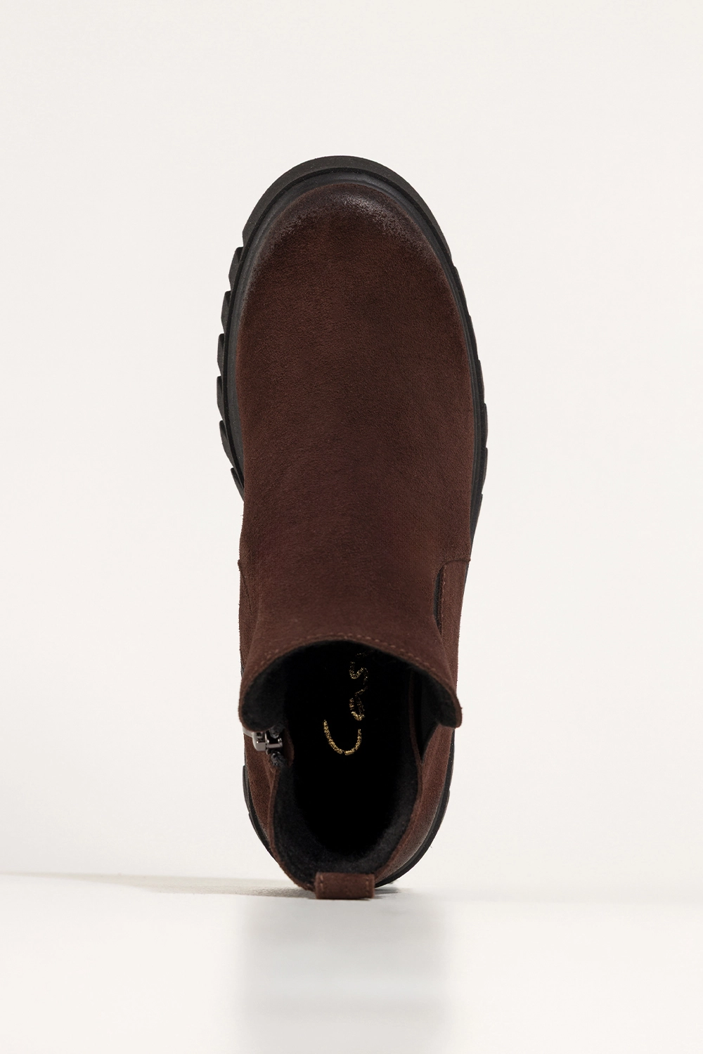 Czekoladowe botki skórzane damskie na bieżnikowanej platformie guma w cholewce PRODUKT POLSKI Casu 39512, to idealne połączenie elegancji, wygody i solidnego wykonania. Uszyte z wysokogatunkowej skóry zamszowej, zachwycają miękką fakturą i wytrzymałością na codzienne użytkowanie. Wnętrze ocieplone przyjemnym w dotyku kocem obuwniczym gwarantuje ciepło nawet w najchłodniejsze dni, a miękka wkładka z materiału zapewnia wygodę przez cały dzień. Solidna bieżnikowana platforma zwiększa stabilność, amortyzuje wstrząsy i dodaje charakteru każdej stylizacji.