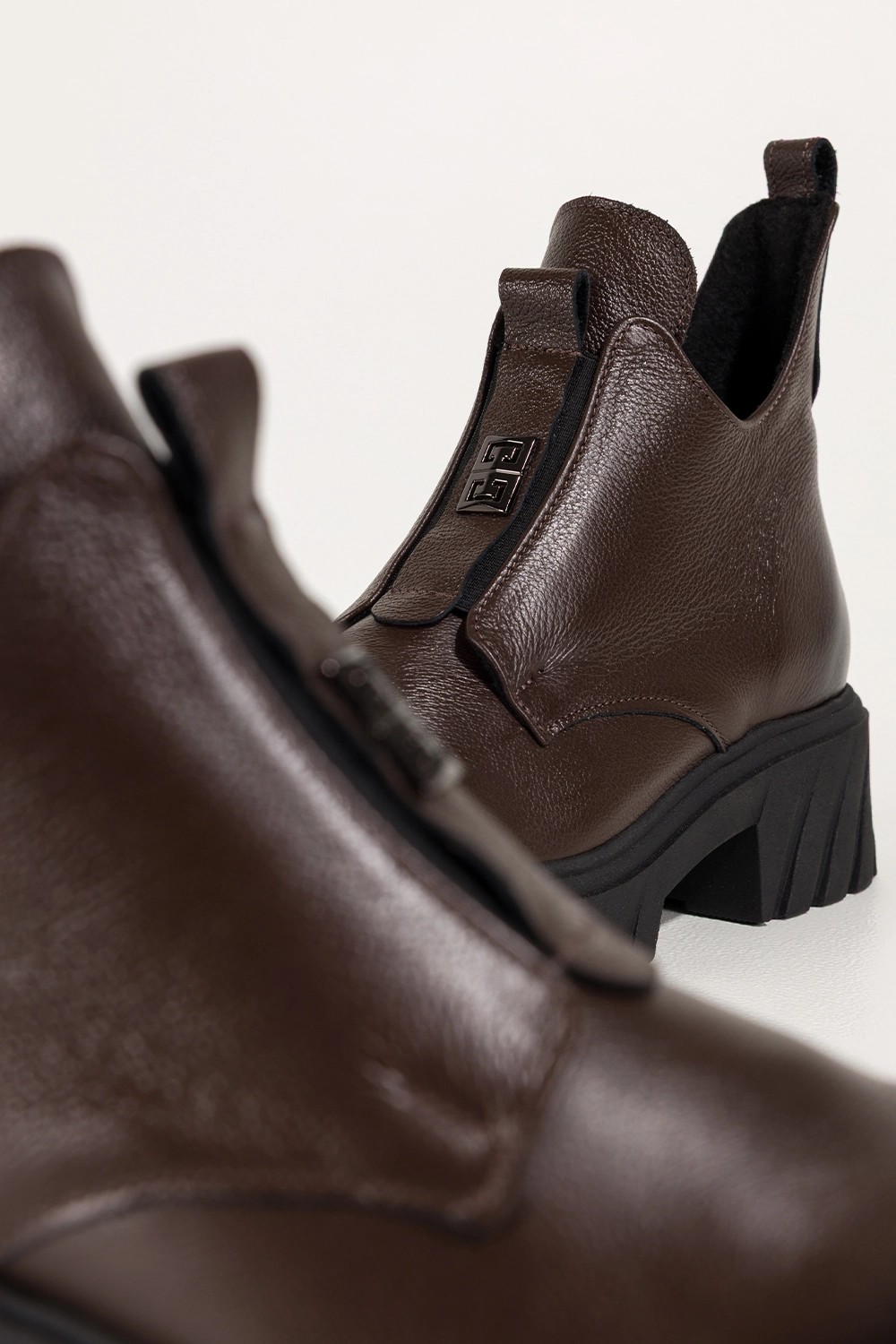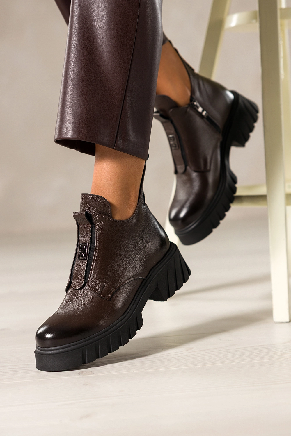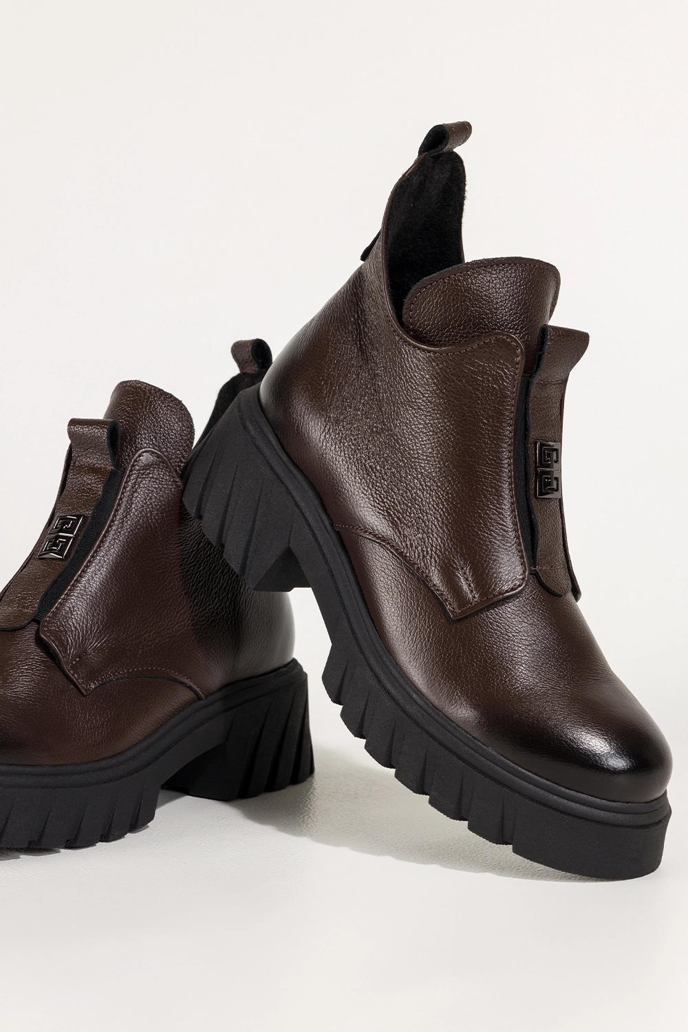 Stylowe wycięcia w cholewce oraz elastyczna guma z przodu, ozdobiona stalowym detalem, tworzą odważny, a jednocześnie elegancki look. Te botki świetnie komponują się zarówno z dopasowanymi jeansami, jak i zwiewnymi sukienkami, nadając stylizacji wyrazistego charakteru. Czekoladowy odcień skóry to modny wybór, który pasuje do niemal każdej kolorystyki garderoby.