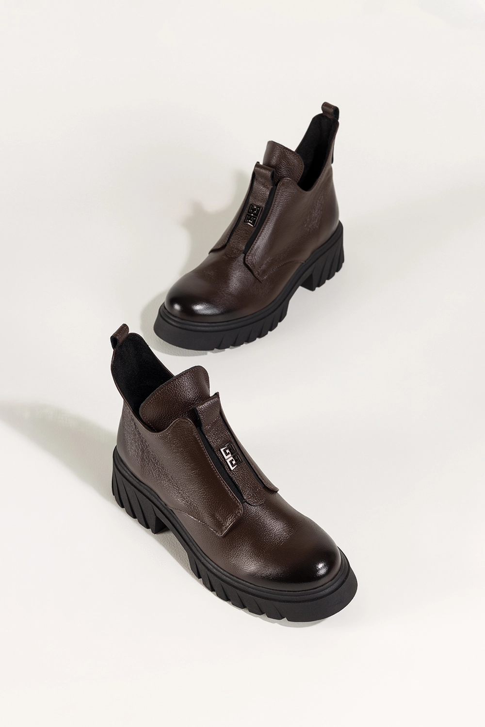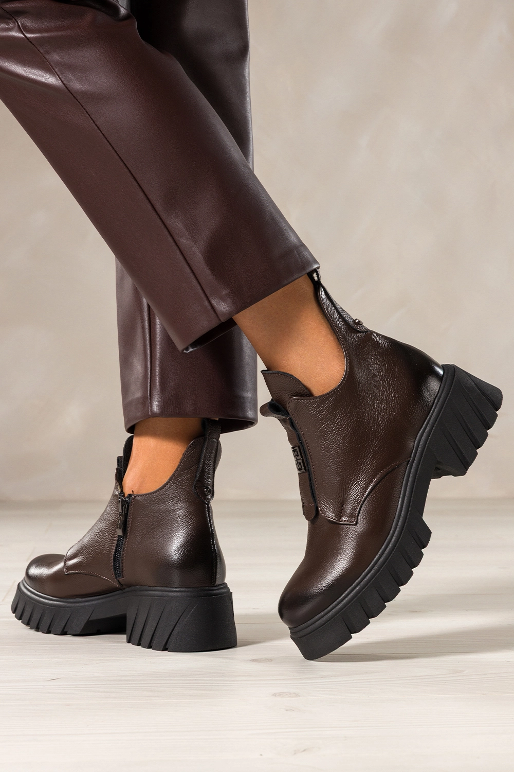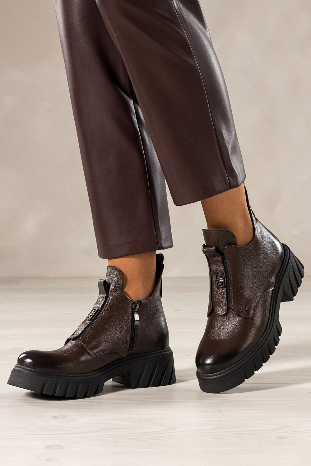 Stylowe wycięcia w cholewce oraz elastyczna guma z przodu, ozdobiona stalowym detalem, tworzą odważny, a jednocześnie elegancki look. Te botki świetnie komponują się zarówno z dopasowanymi jeansami, jak i zwiewnymi sukienkami, nadając stylizacji wyrazistego charakteru. Czekoladowy odcień skóry to modny wybór, który pasuje do niemal każdej kolorystyki garderoby.