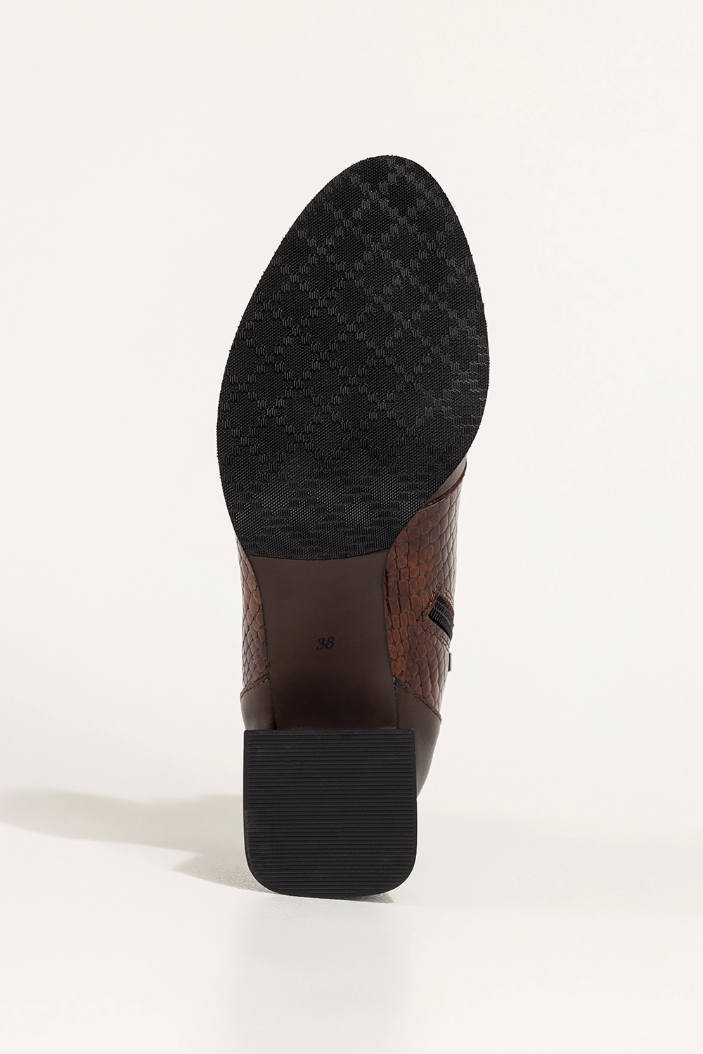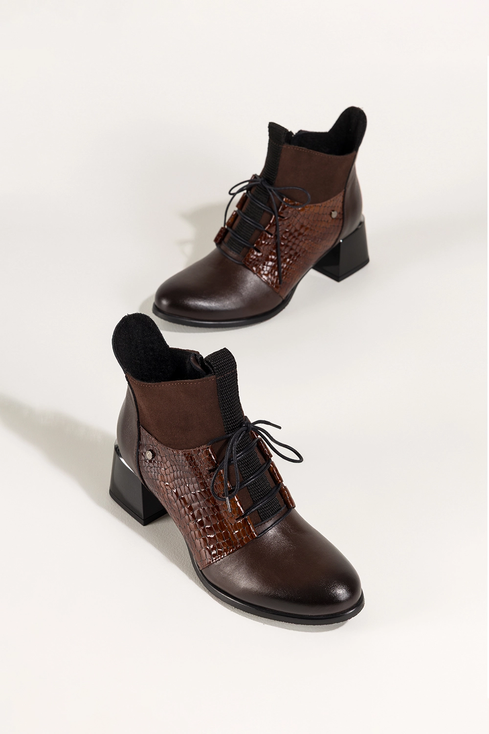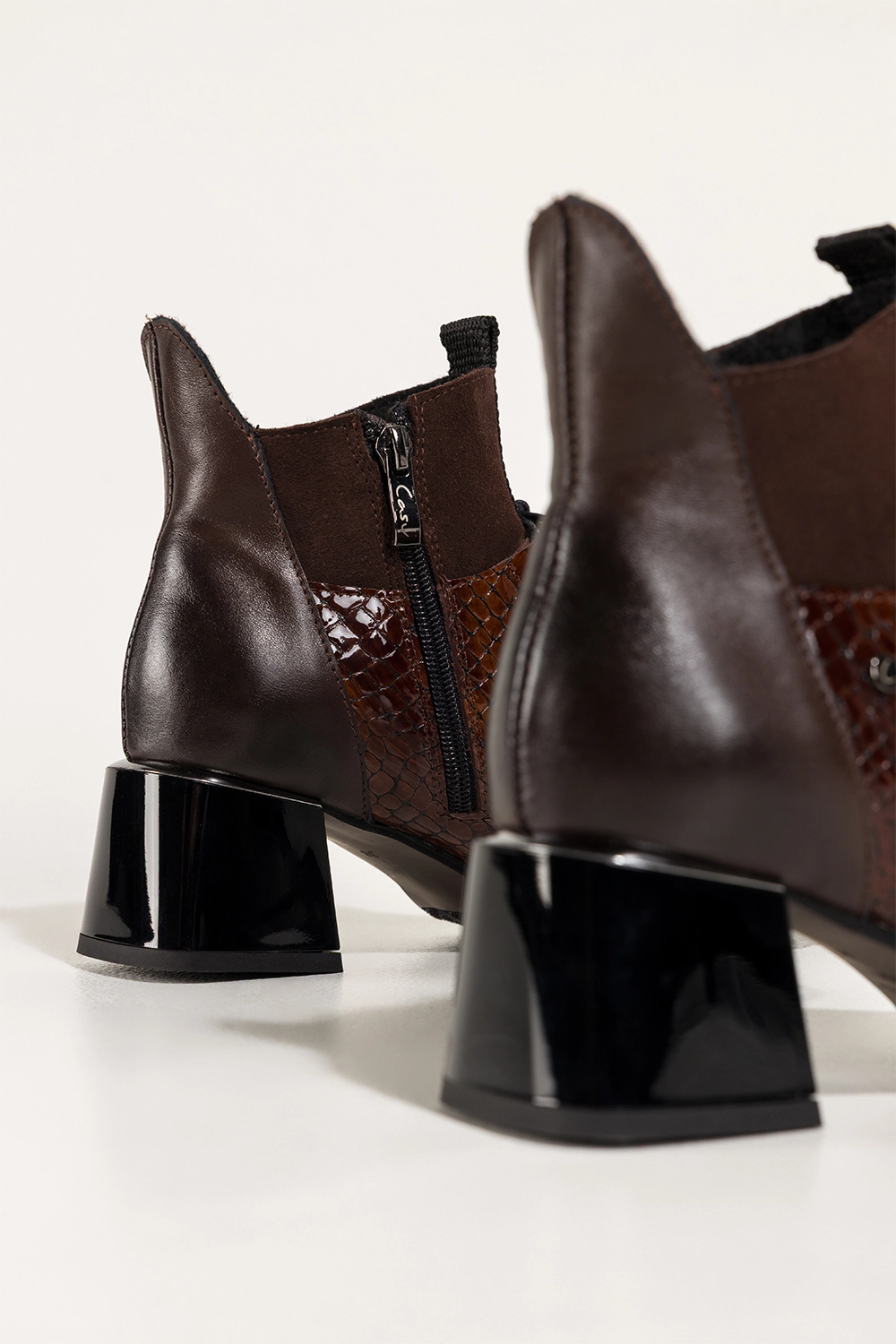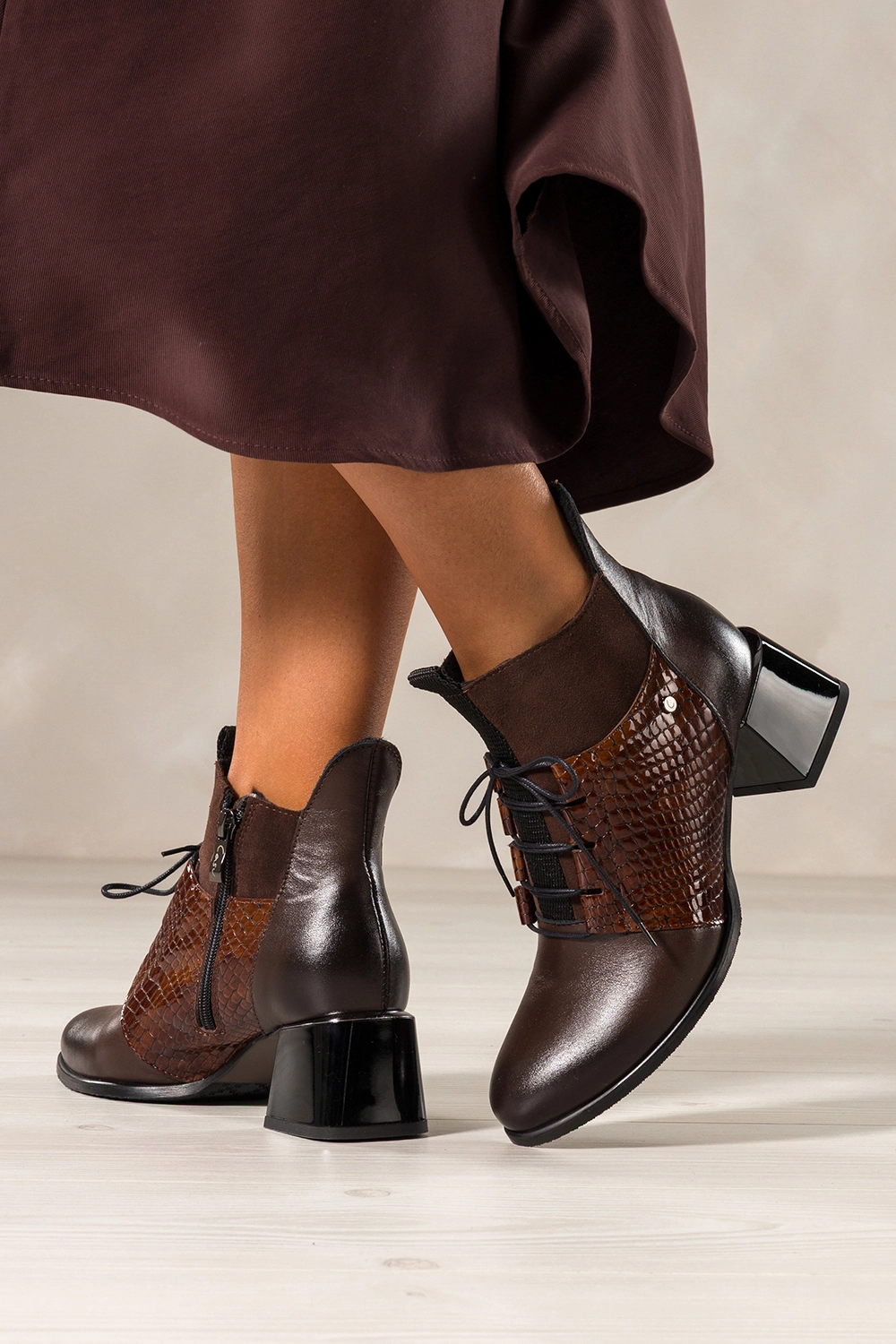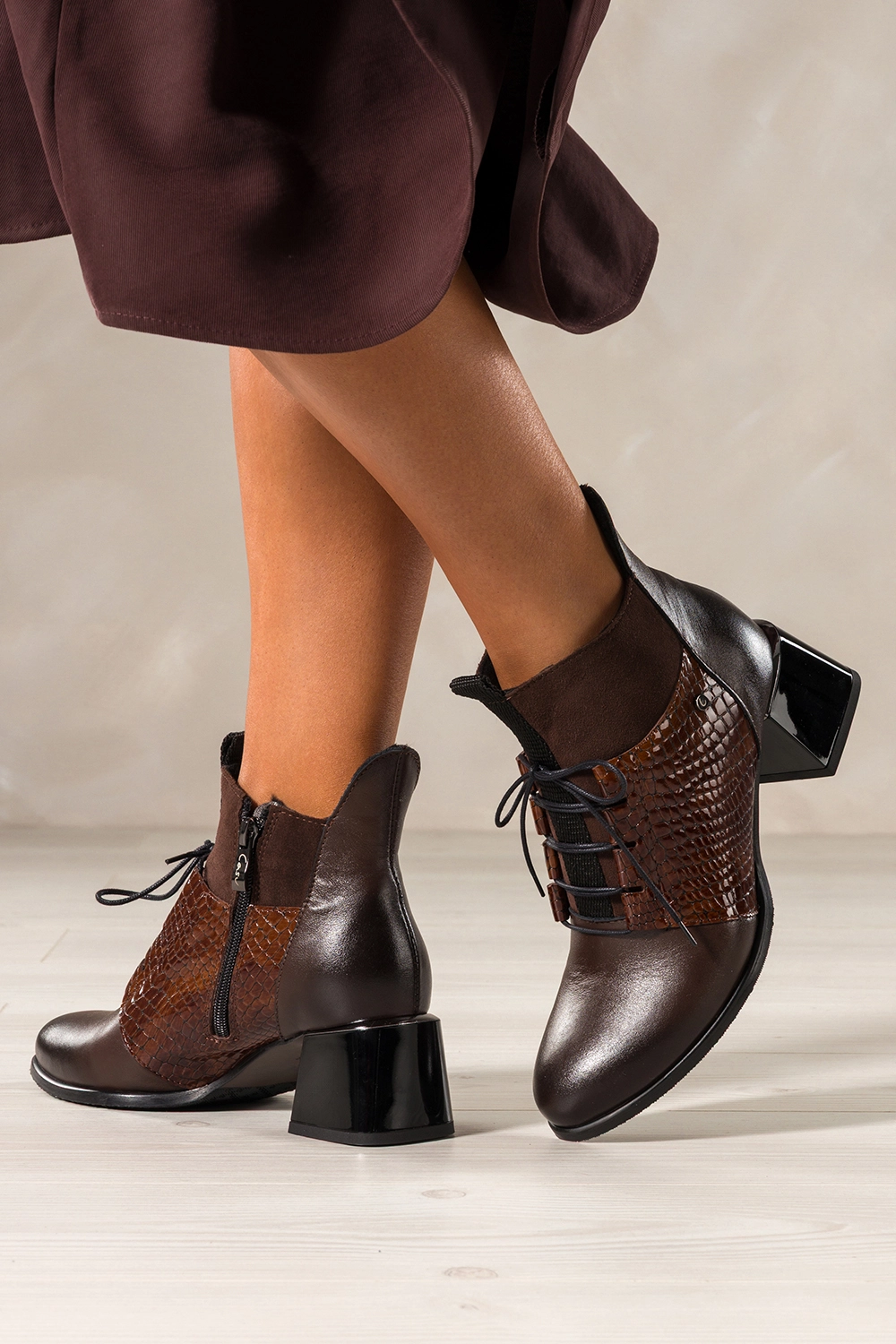 Te wyjątkowe botki przyciągają uwagę dzięki lakierowanej wstawce ze wzorem wężowym, która nadaje całości niepowtarzalnego charakteru. Obcas typu klocek ze srebrnym akcentem podkreśla nowoczesny, ale wciąż kobiecy design. Czekoladowy odcień skóry doskonale komponuje się z jesienno-zimowymi stylizacjami, pasując zarówno do jeansów, jak i eleganckich sukienek czy wełnianych płaszczy. To obuwie stworzone z myślą o kobietach, które cenią sobie połączenie klasy z wyrazistym akcentem.