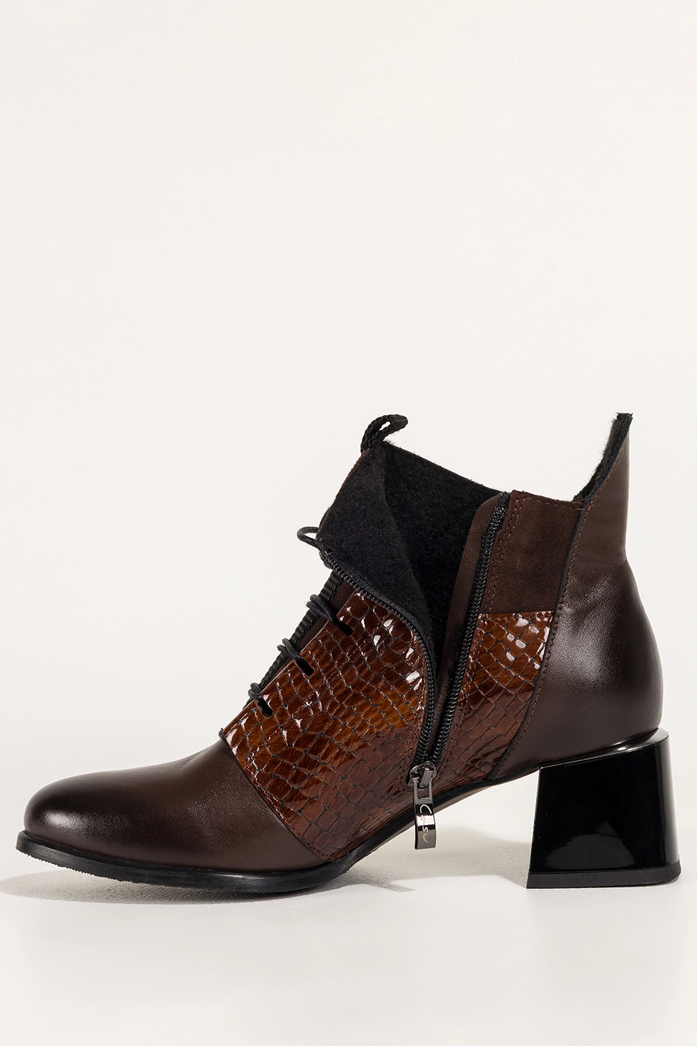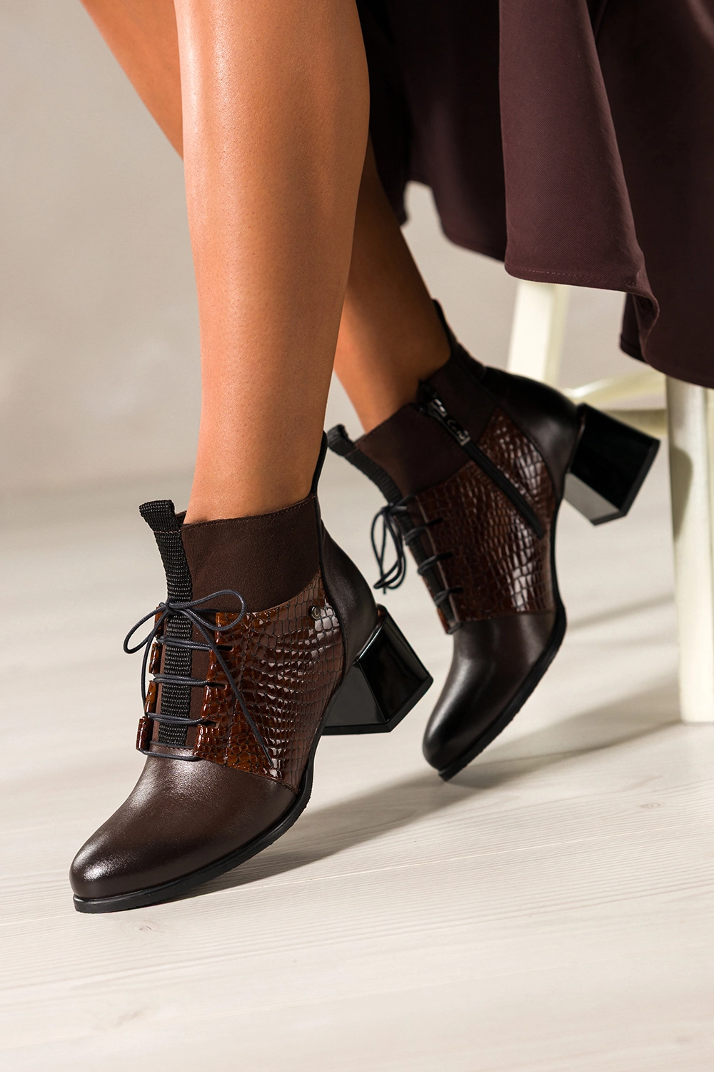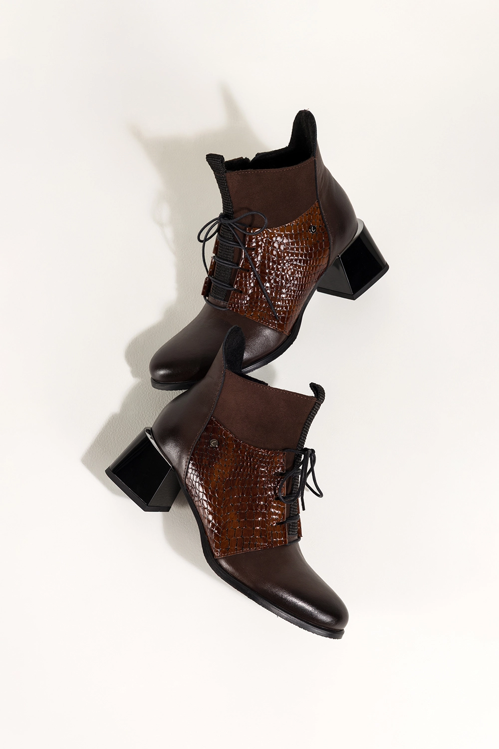Czekoladowe botki skórzane damskie na ozdobnym klocku lakierowane wstawki z wzorem wężowym sznurowane PRODUKT POLSKI Casu model 39496, to kwintesencja luksusu w codziennym wydaniu. Wykonane z miękkiej, wysokogatunkowej skóry naturalnej, oferują nie tylko trwałość, ale też niebywały komfort użytkowania. Wewnętrzne ocieplenie z koca obuwniczego otula stopy ciepłem, sprawiając, że są idealne na chłodniejsze dni. Solidna konstrukcja, zaokrąglony nosek oraz wygodny zamek z boku zapewniają wygodę i łatwość zakładania.