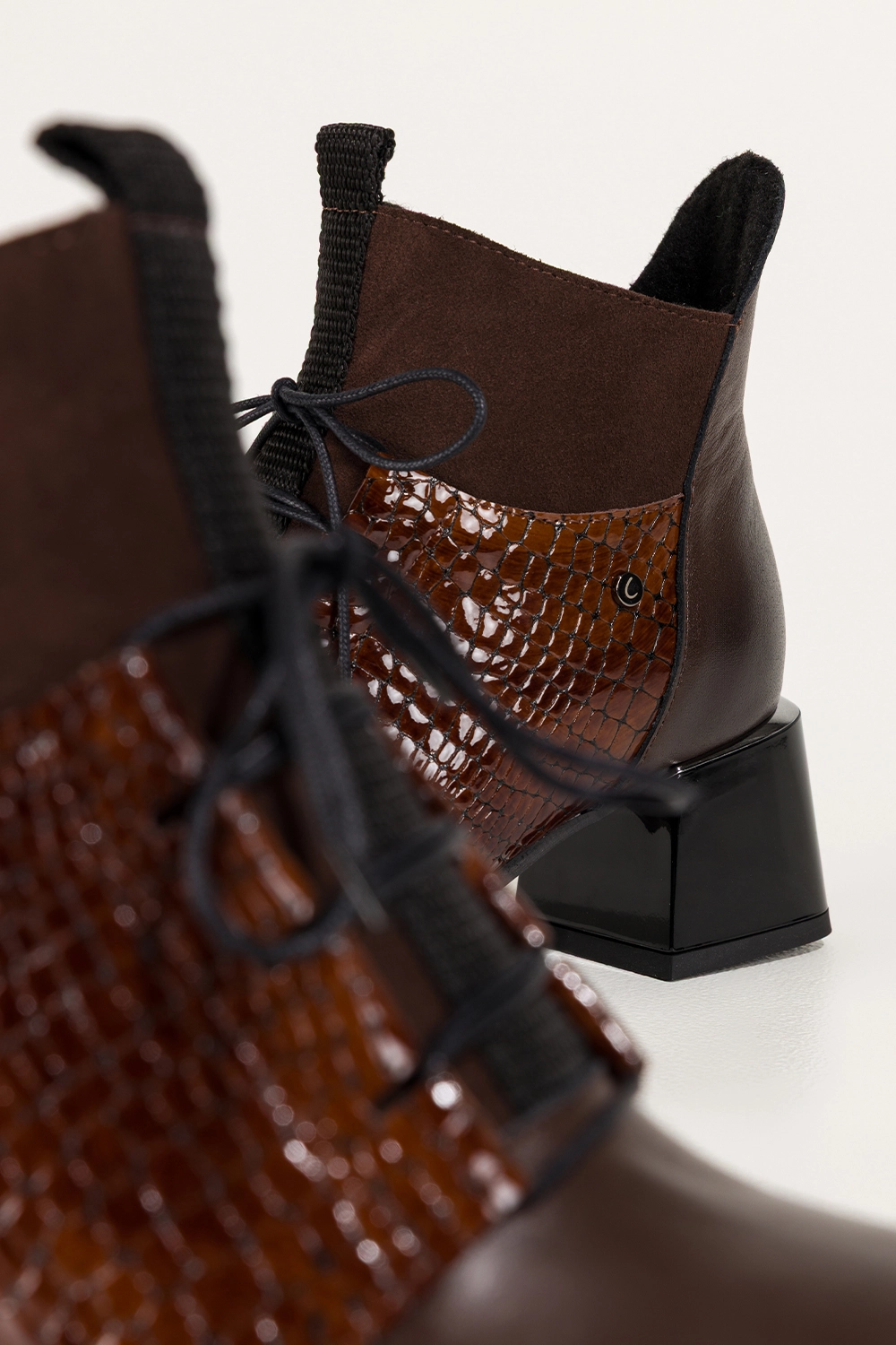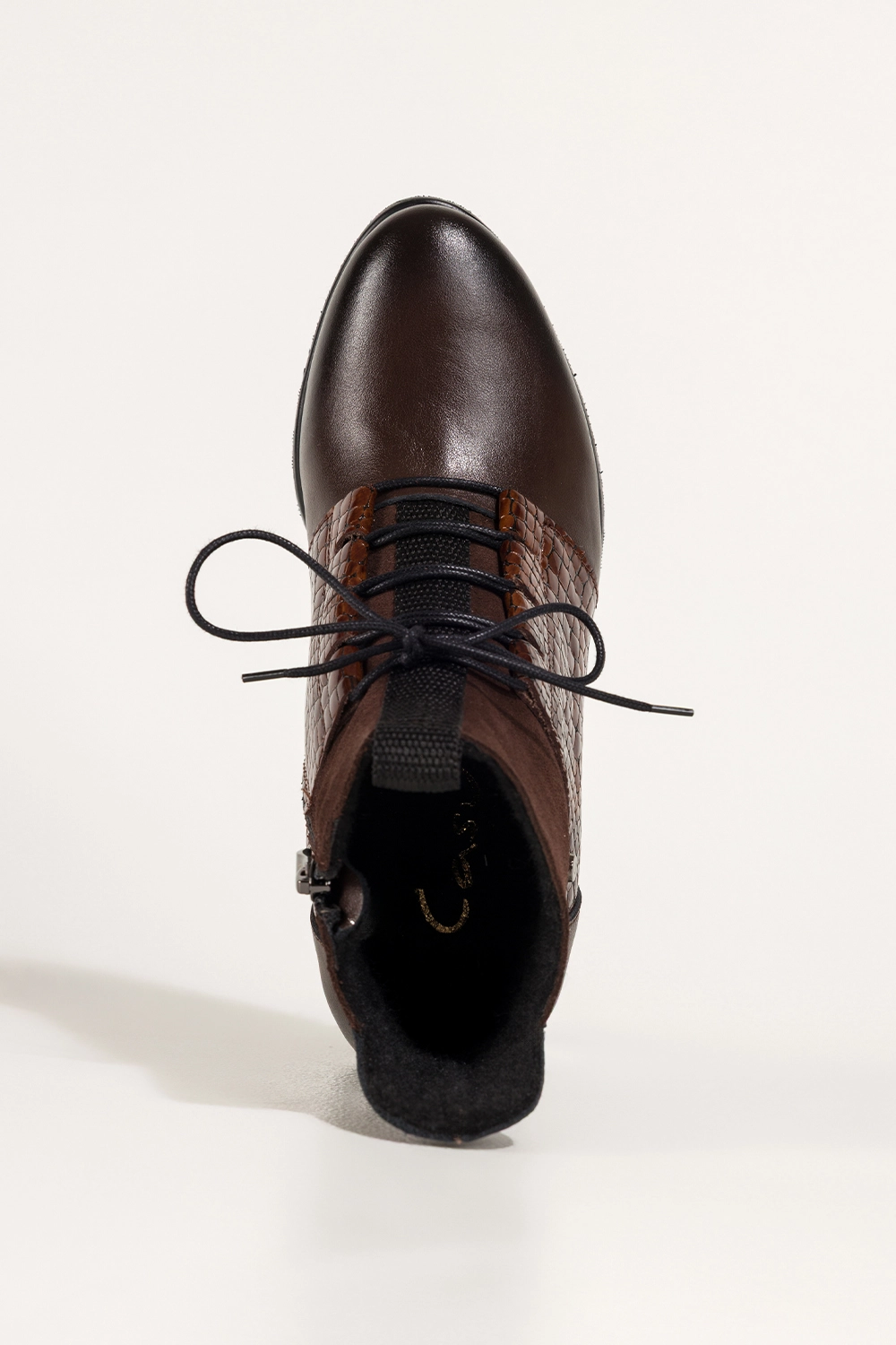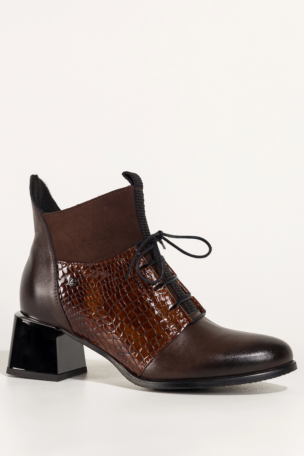 Czekoladowe botki skórzane damskie na ozdobnym klocku lakierowane wstawki z wzorem wężowym sznurowane PRODUKT POLSKI Casu model 39496, to kwintesencja luksusu w codziennym wydaniu. Wykonane z miękkiej, wysokogatunkowej skóry naturalnej, oferują nie tylko trwałość, ale też niebywały komfort użytkowania. Wewnętrzne ocieplenie z koca obuwniczego otula stopy ciepłem, sprawiając, że są idealne na chłodniejsze dni. Solidna konstrukcja, zaokrąglony nosek oraz wygodny zamek z boku zapewniają wygodę i łatwość zakładania.