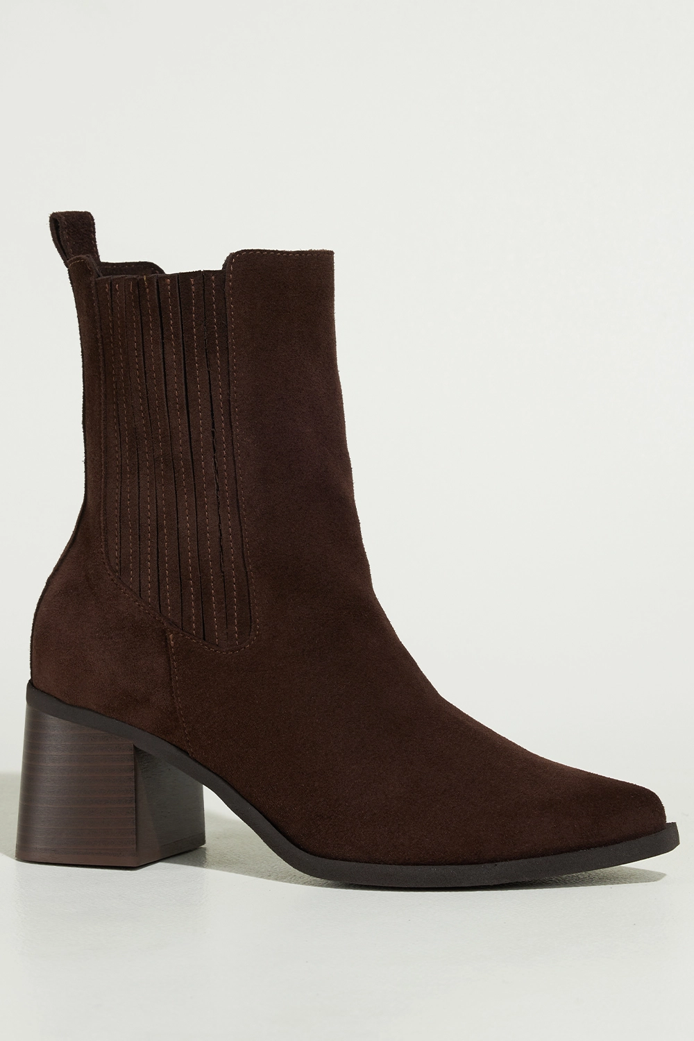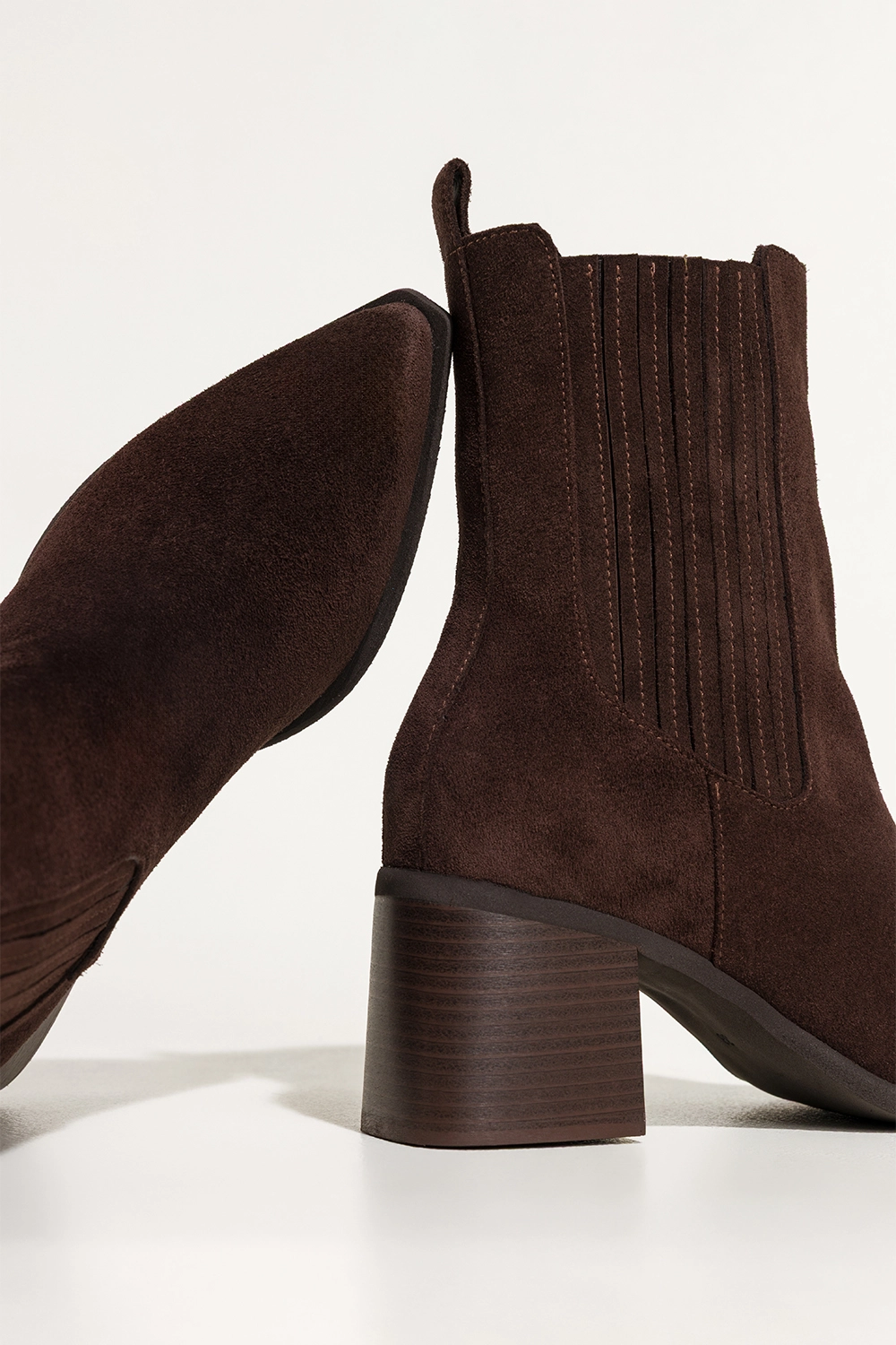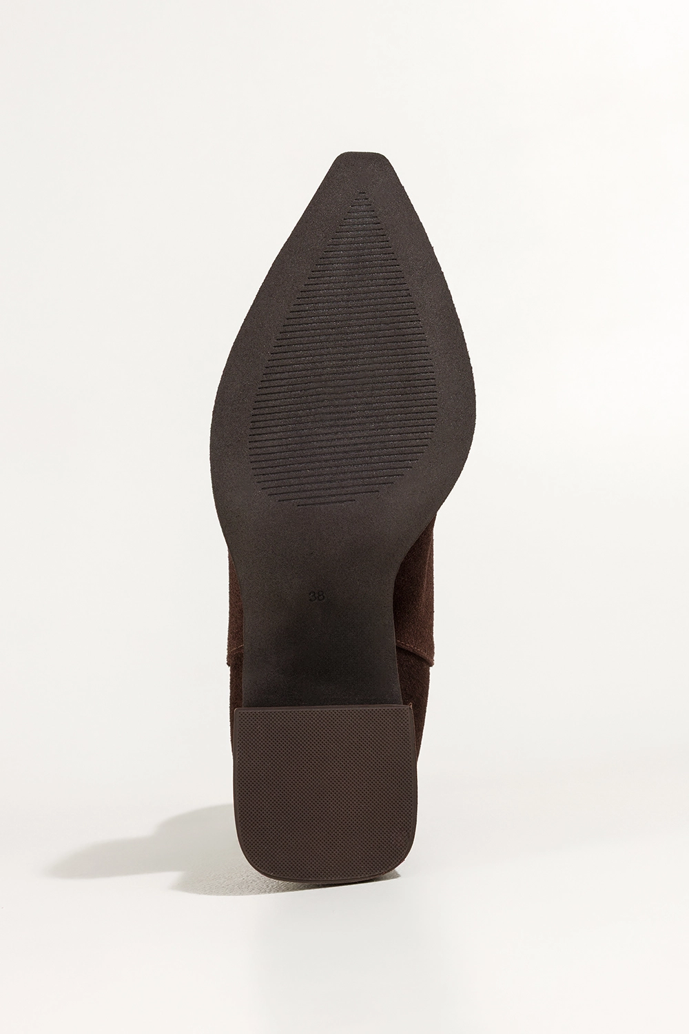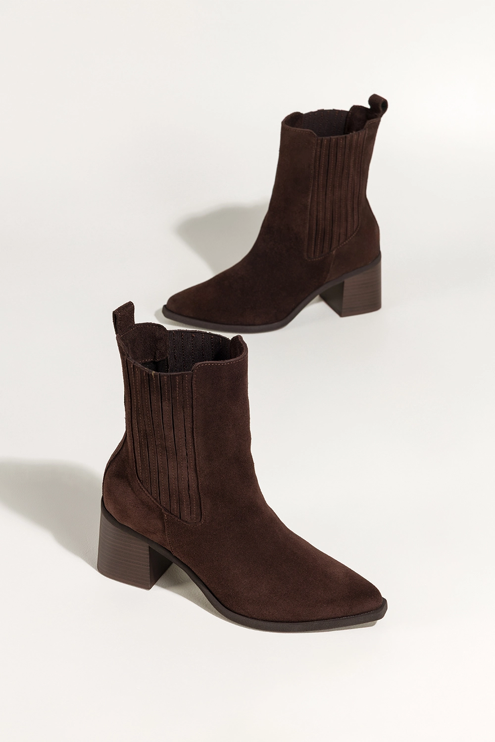 Zmysłowy, czekoladowy odcień dodaje elegancji i głębi każdej stylizacji. Szpiczasty nosek wysmukla stopę, a szeroki obcas typu klocek zapewnia stabilność bez rezygnacji z kobiecego wdzięku. Wsuwane botki z elastycznymi gumami w cholewce dopasowują się do nogi, ułatwiają zakładanie i podkreślają nowoczesny, minimalistyczny styl. To idealna propozycja dla kobiet ceniących połączenie wygody z wyrazistym designem.
