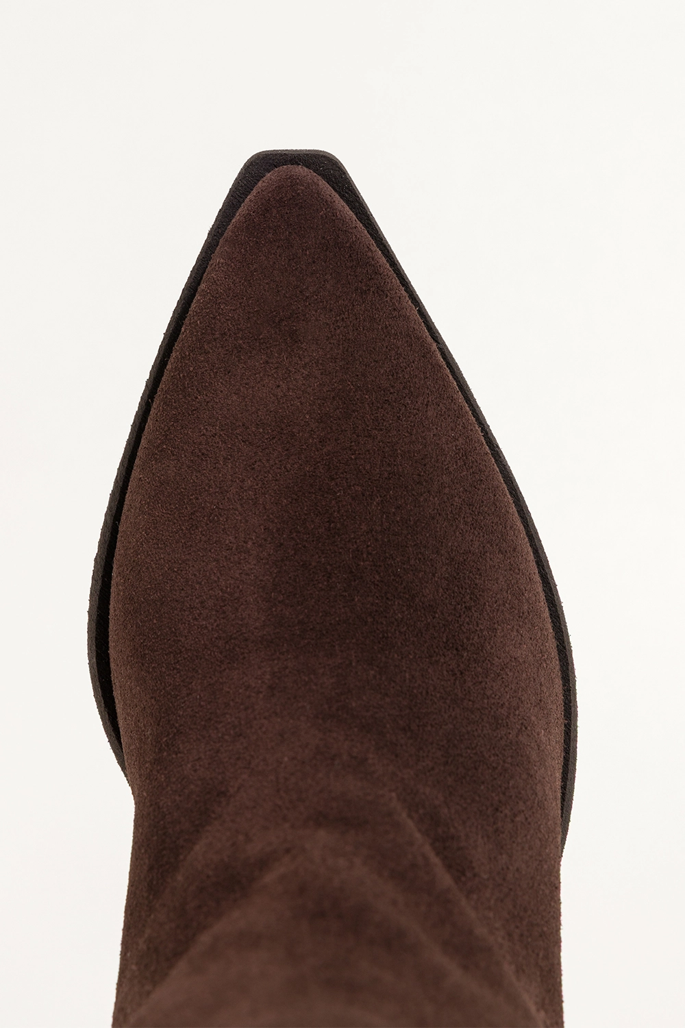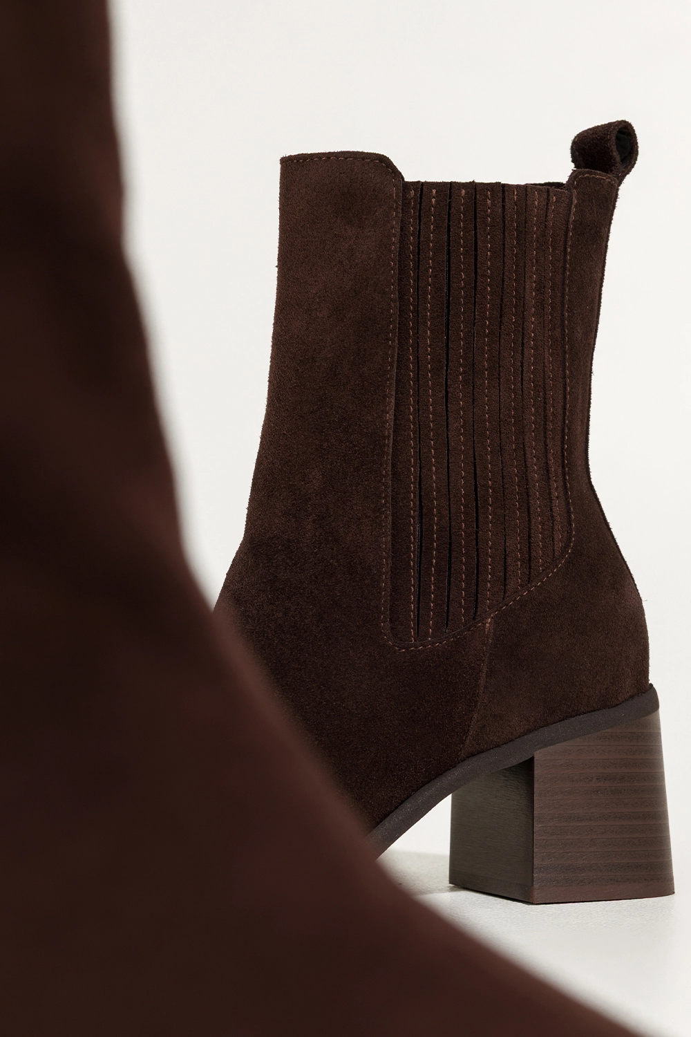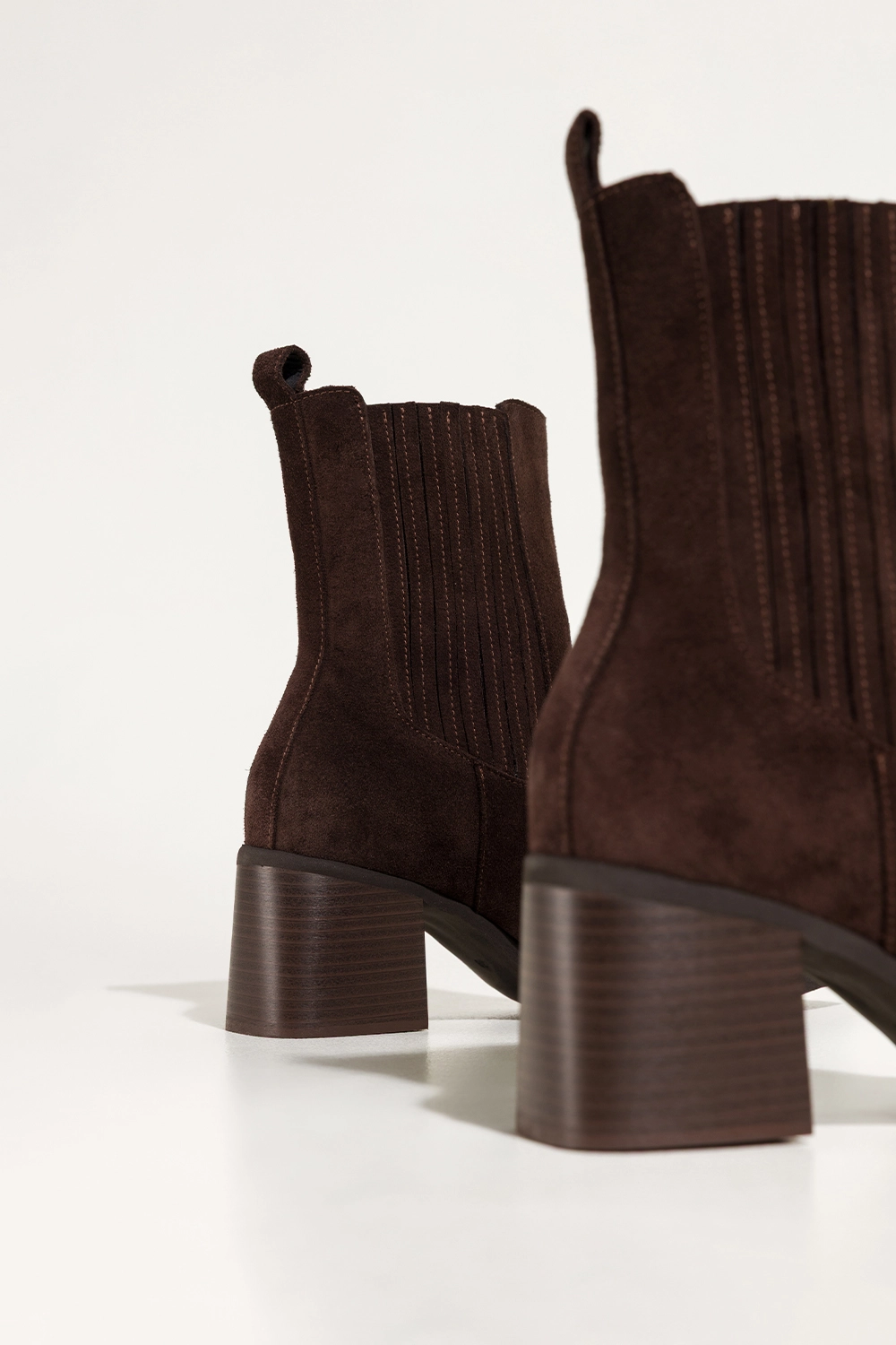 Czekoladowe botki skórzane damskie na szerokim obcasie elastyczne gumy w cholewce PRODUKT POLSKI Casu model 6980-496. Wykonane z wysokogatunkowej skóry zamszowej, zachwycają swoją miękkością i trwałością. Skórzana wkładka gwarantuje komfort noszenia przez cały dzień, a brak ocieplenia czyni je idealnym wyborem na sezon przejściowy.