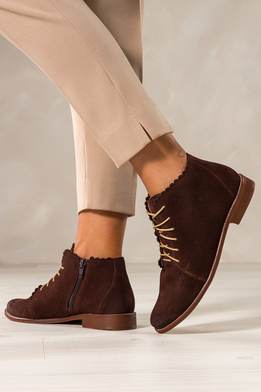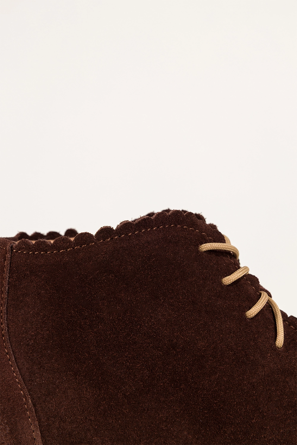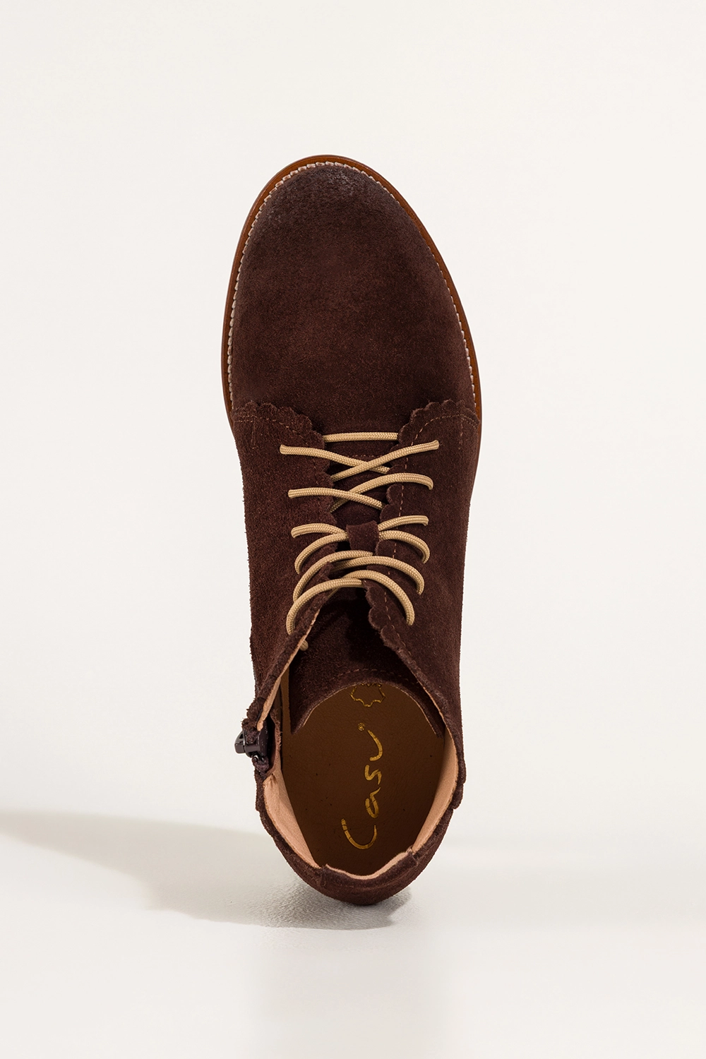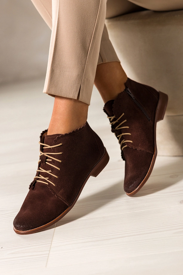 Czekoladowe botki skórzane damskie z ozdobnymi wycięciami sznurowane PRODUKT POLSKI Casu model 5921-SLTO H zostały uszyte z wysokogatunkowej skóry zamszowej, która zachwyca miękkością i trwałością. Skórzana, miękka wkładka zapewnia komfort noszenia przez cały dzień, a solidna płaska podeszwa gwarantuje stabilność kroków. Każdy detal, od beżowych sznurówek po perfekcyjnie wykończoną cholewkę, świadczy o polskim rzemiośle obuwniczym najwyższej klasy.