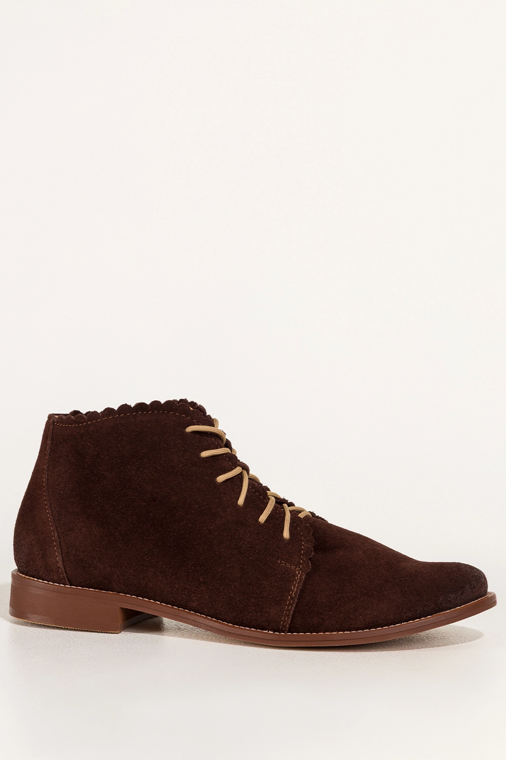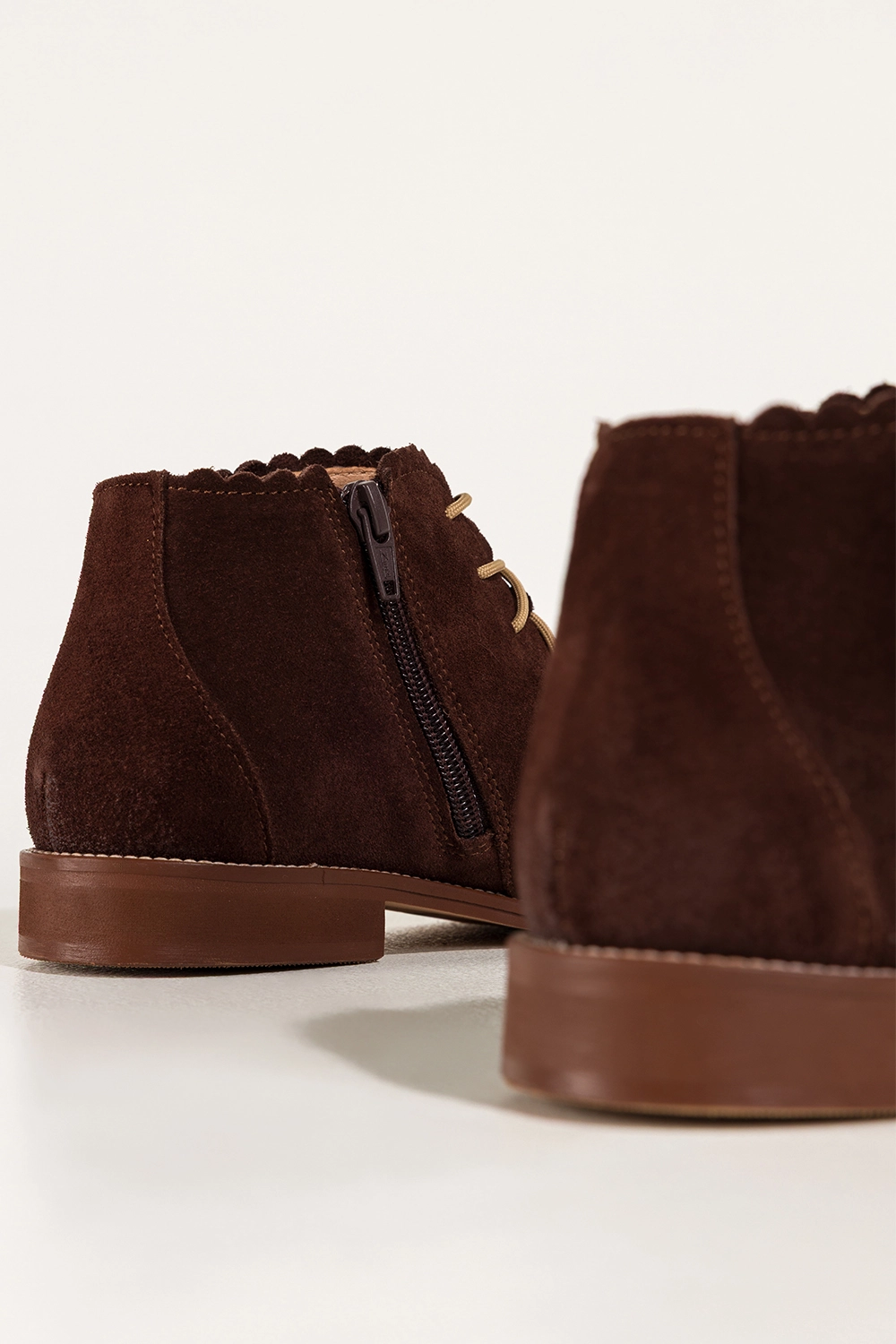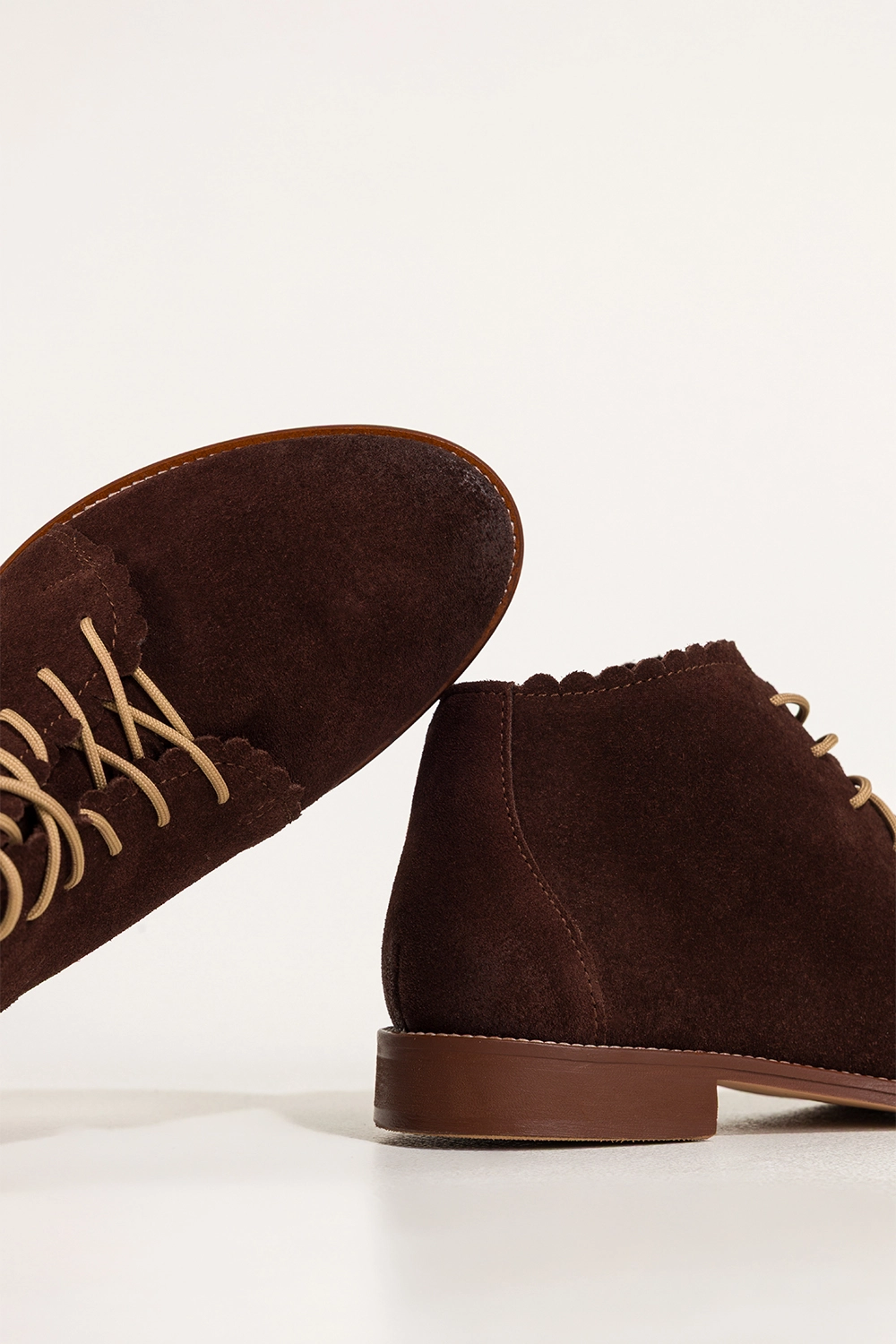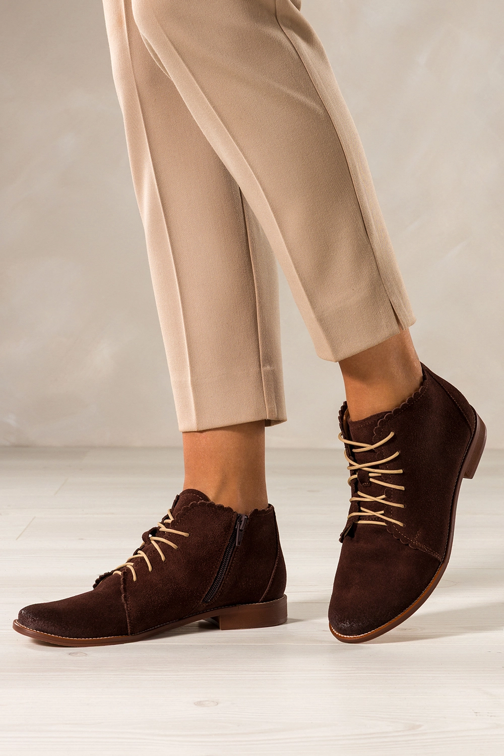 Czekoladowe botki skórzane damskie z ozdobnymi wycięciami sznurowane PRODUKT POLSKI Casu model 5921-SLTO H zostały uszyte z wysokogatunkowej skóry zamszowej, która zachwyca miękkością i trwałością. Skórzana, miękka wkładka zapewnia komfort noszenia przez cały dzień, a solidna płaska podeszwa gwarantuje stabilność kroków. Każdy detal, od beżowych sznurówek po perfekcyjnie wykończoną cholewkę, świadczy o polskim rzemiośle obuwniczym najwyższej klasy.